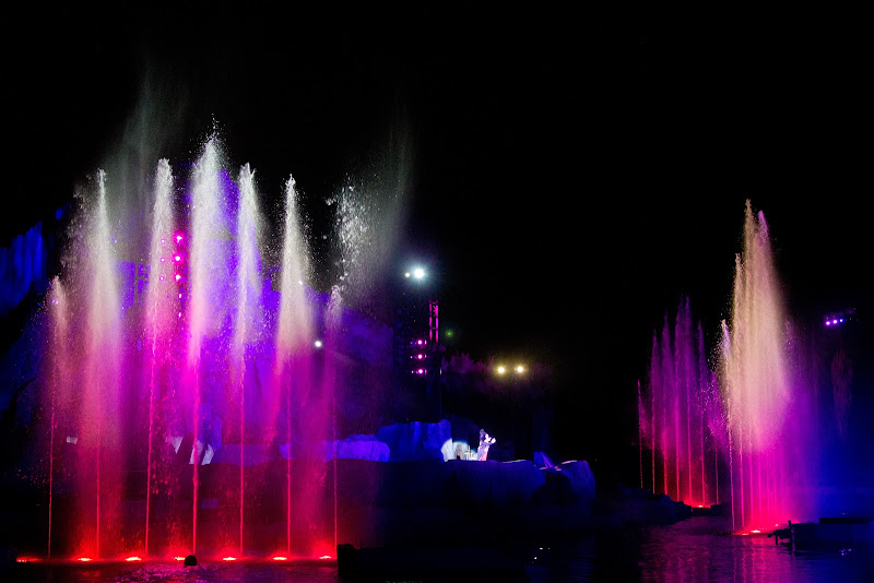 And in the next picture, the white waves is video being projected on the fan shaped fountain, and the blue on the sides, is real water that got shot out to the arena as if a wave was really crashing right in front of us.