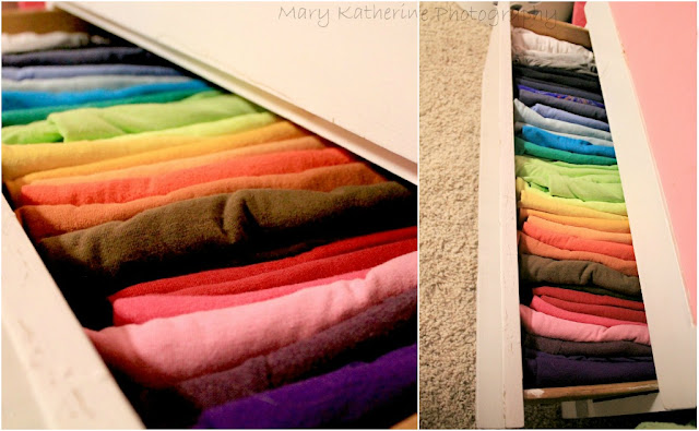 | I have a billion and one t-shirts which I keep nice and neat in my dresser, folded and organized by color. My dear mother laughs at me. |