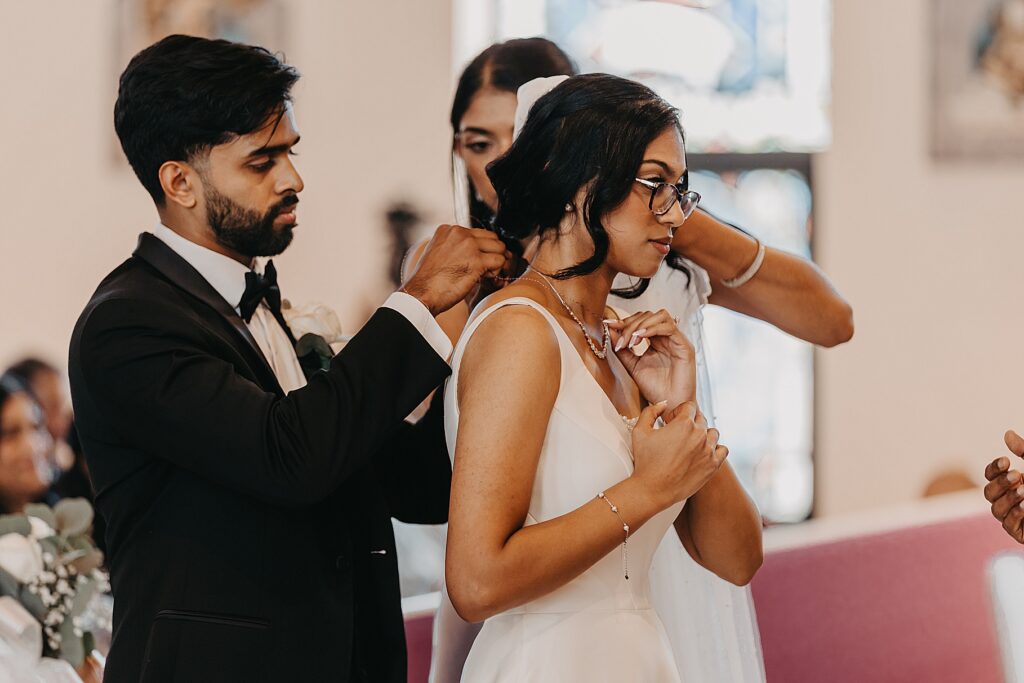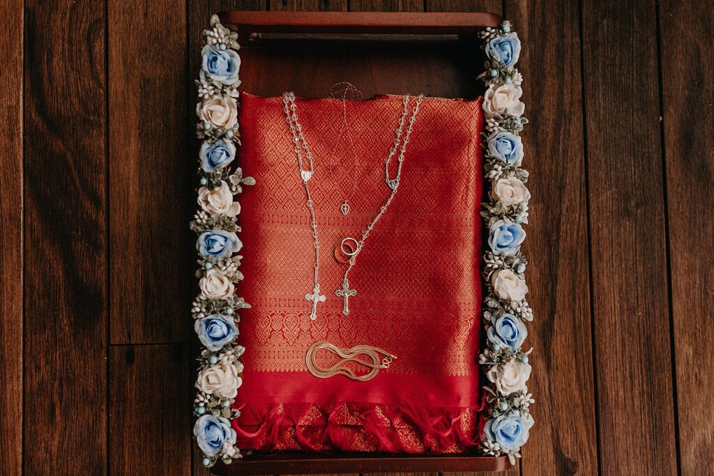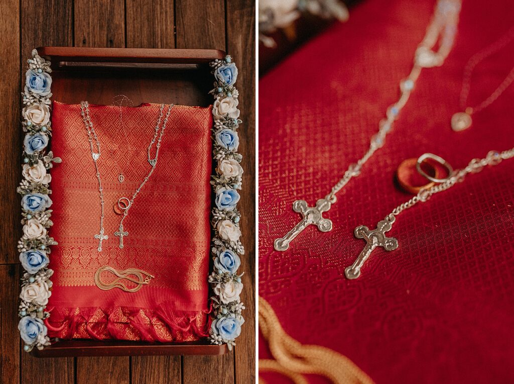 The Thaali (or minnu) is a gold heart-shaped pendant embossed with a cross. The thaali is hung on seven threads taken from the Manthrakodi. During the Ceremony, the groom ties the thaali around the bride’s neck, symbolizing the permanence of marriage and their inseparable bond.