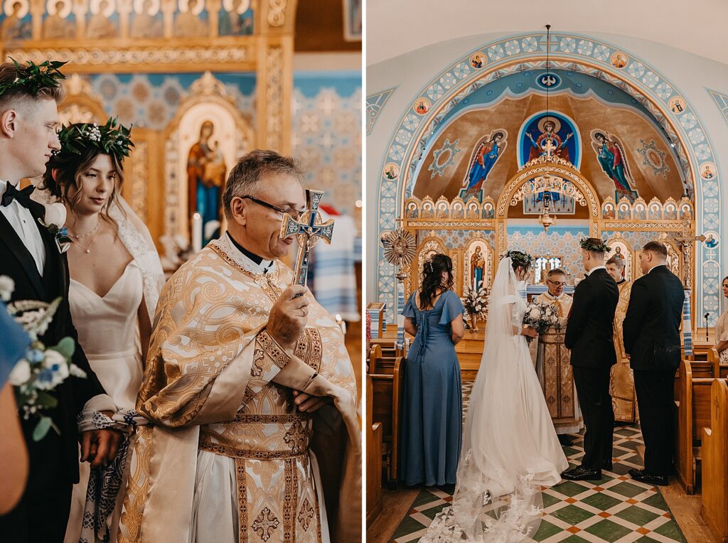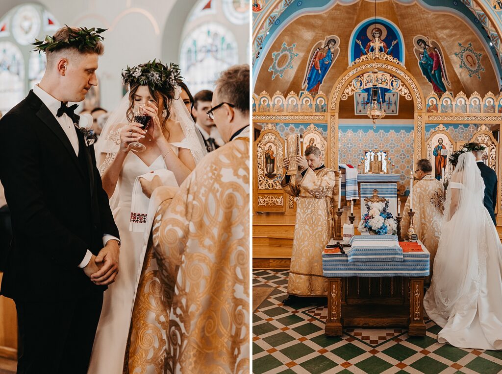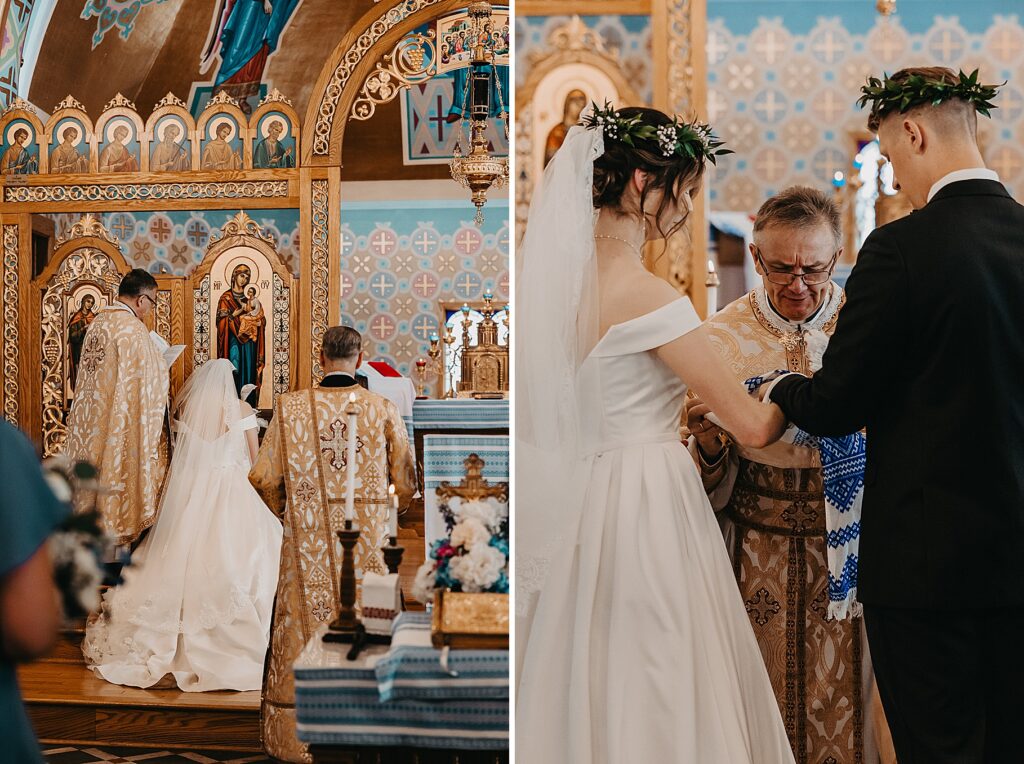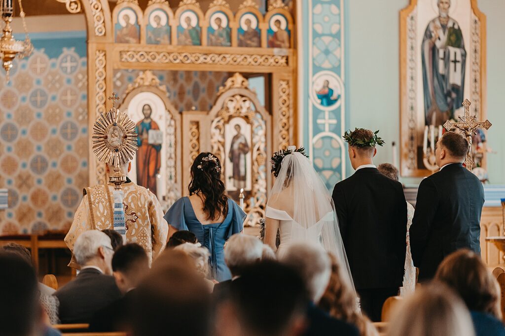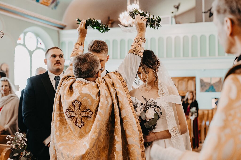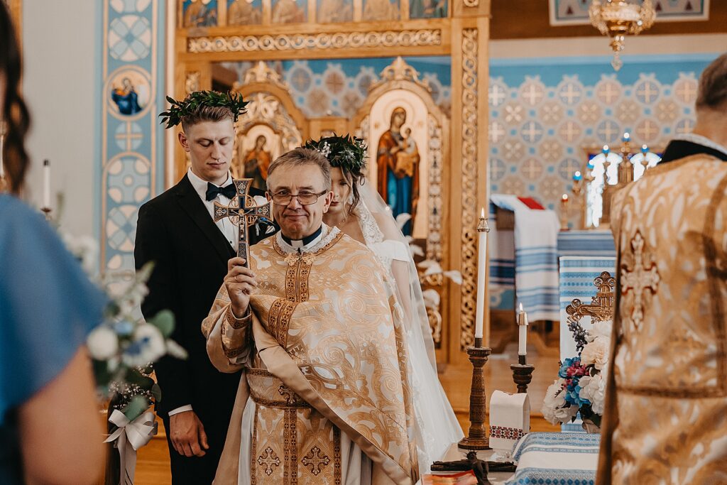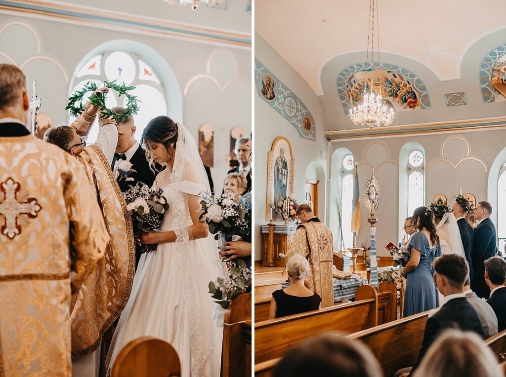 Their ceremony was held at St. Nicholas Ukrainian Catholic Church, Grace’s home parish, where her father serves as a deacon. The church itself was breathtaking, filled with vibrant colors, icons, and the beauty of tradition. One of my favorite moments in a Byzantine wedding is the Crowning, when the couple is crowned with wreaths of myrtle. These crowns symbolize the glory and honor with which God crowns them as king and queen of their new domestic church—the little kingdom they will build together in their home.