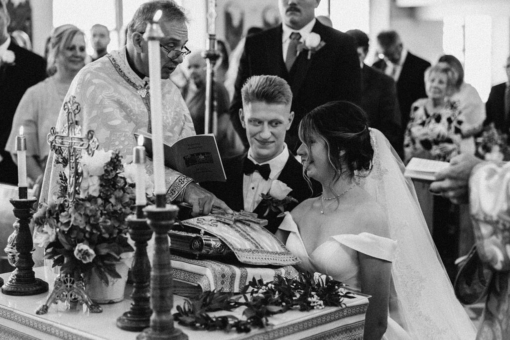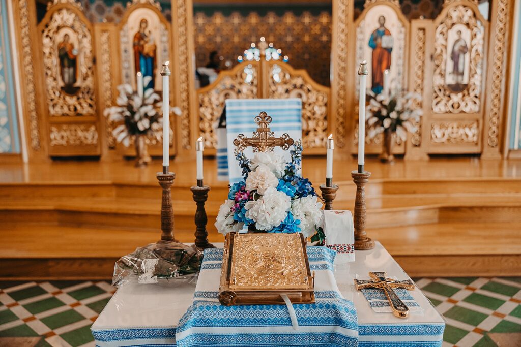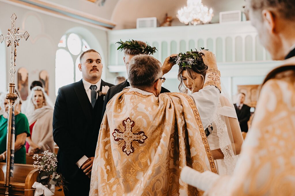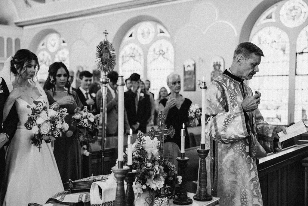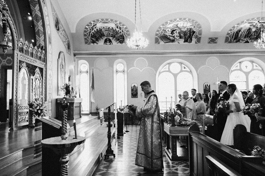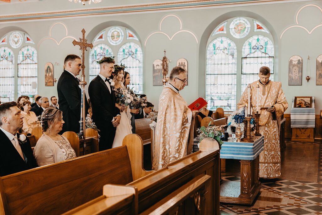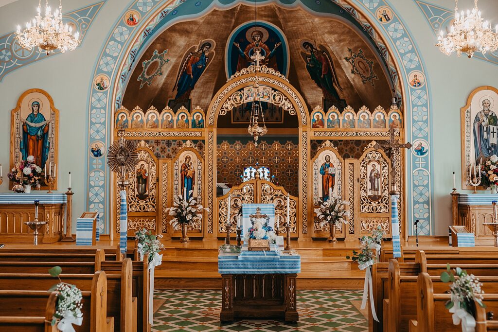 Their ceremony was held at St. Nicholas Ukrainian Catholic Church, Grace’s home parish, where her father serves as a deacon. The church itself was breathtaking, filled with vibrant colors, icons, and the beauty of tradition. One of my favorite moments in a Byzantine wedding is the Crowning, when the couple is crowned with wreaths of myrtle. These crowns symbolize the glory and honor with which God crowns them as king and queen of their new domestic church—the little kingdom they will build together in their home.