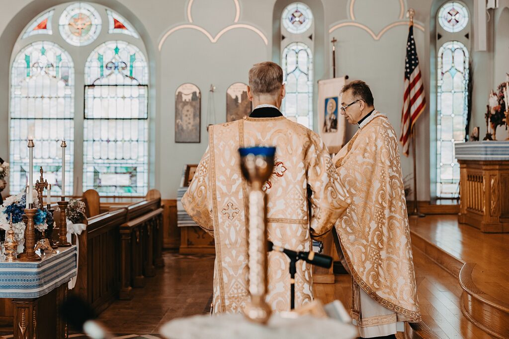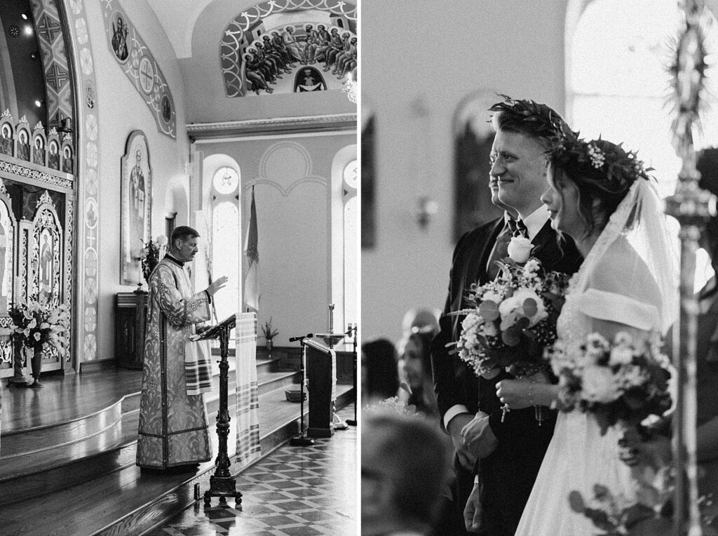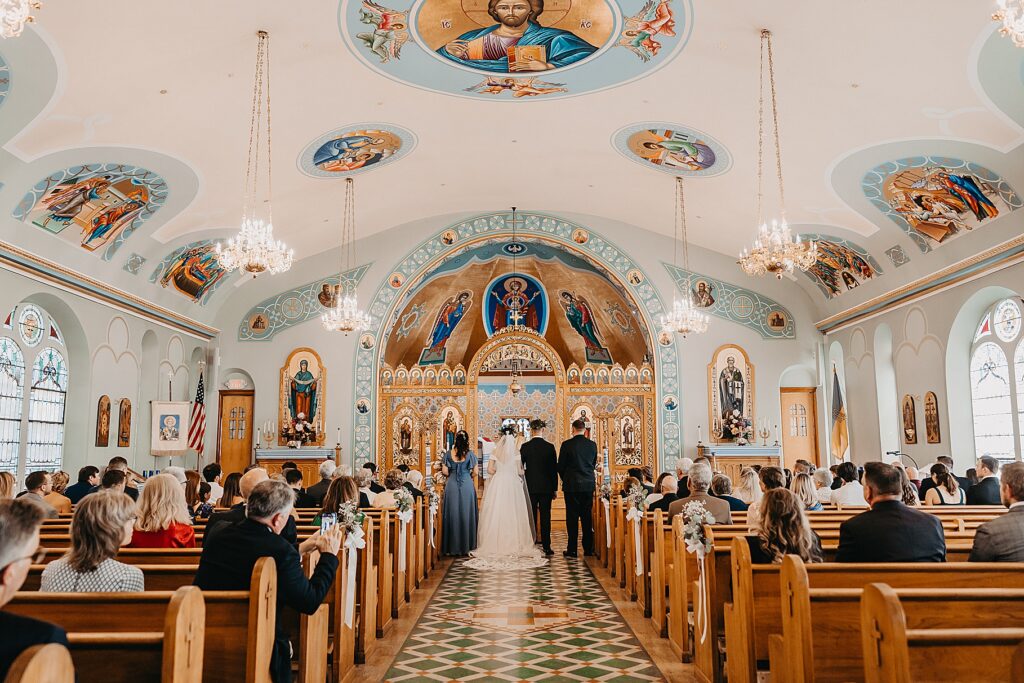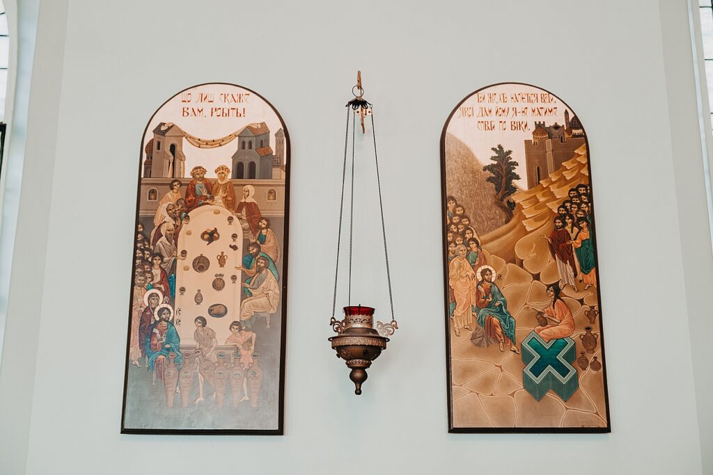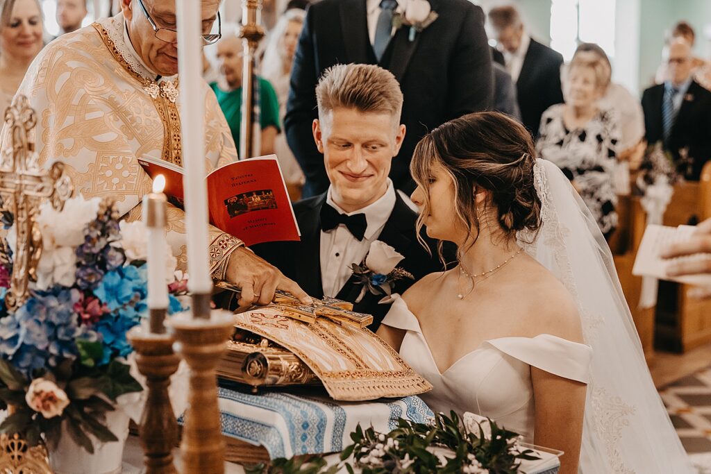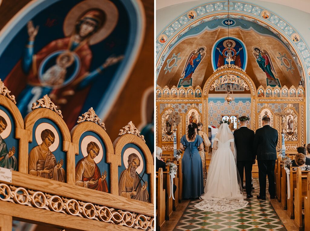Their ceremony was held at St. Nicholas Ukrainian Catholic Church, Grace’s home parish, where her father serves as a deacon. The church itself was breathtaking, filled with vibrant colors, icons, and the beauty of tradition. One of my favorite moments in a Byzantine wedding is the Crowning, when the couple is crowned with wreaths of myrtle. These crowns symbolize the glory and honor with which God crowns them as king and queen of their new domestic church—the little kingdom they will build together in their home.
