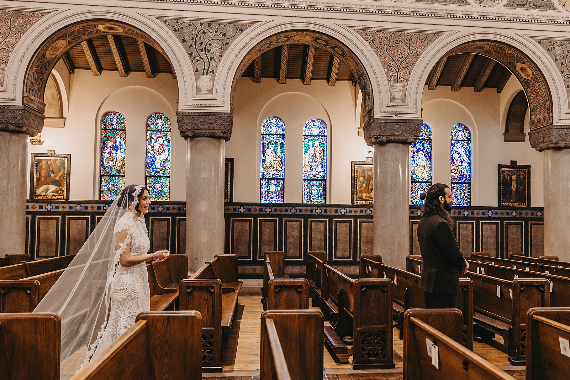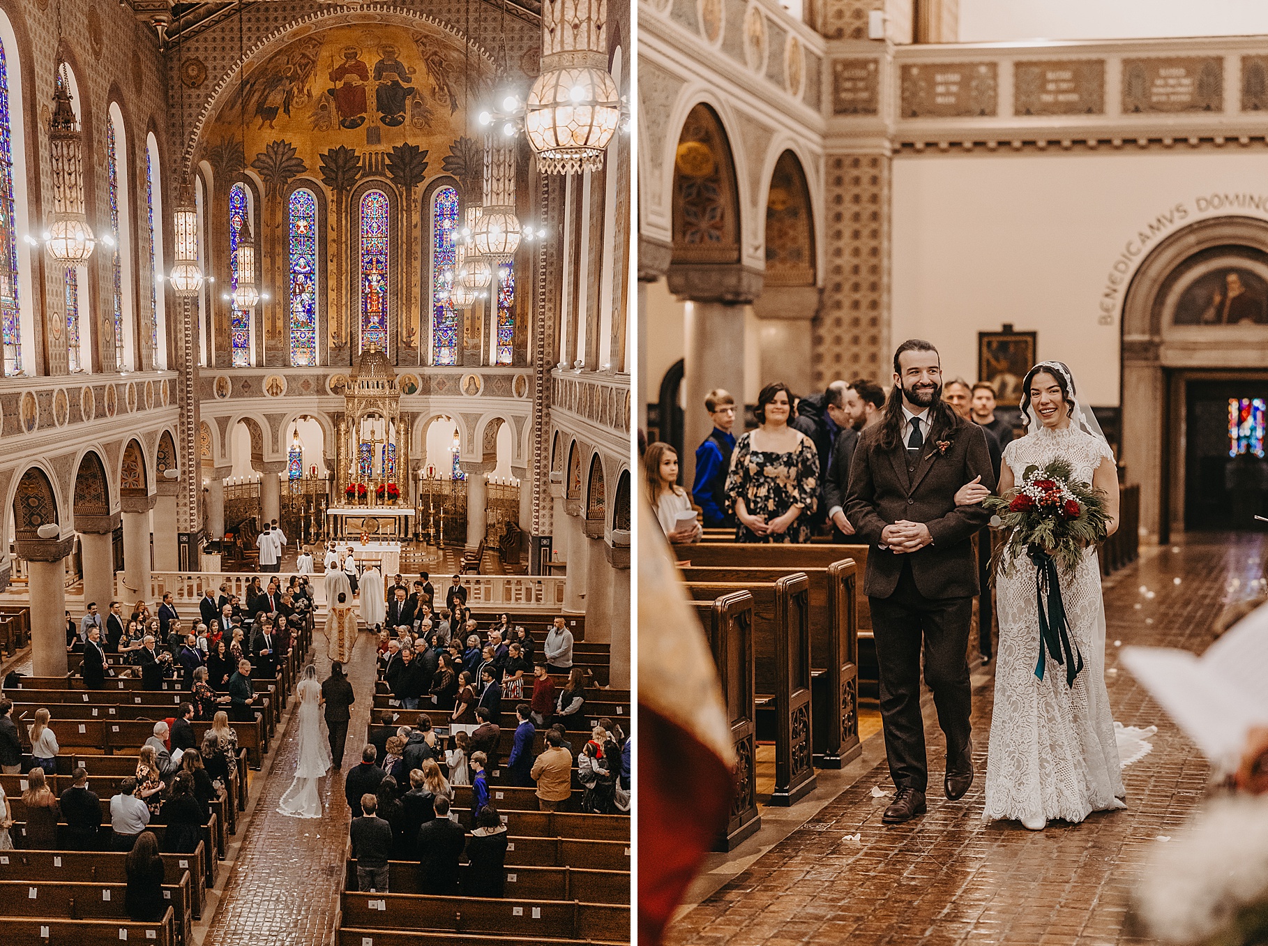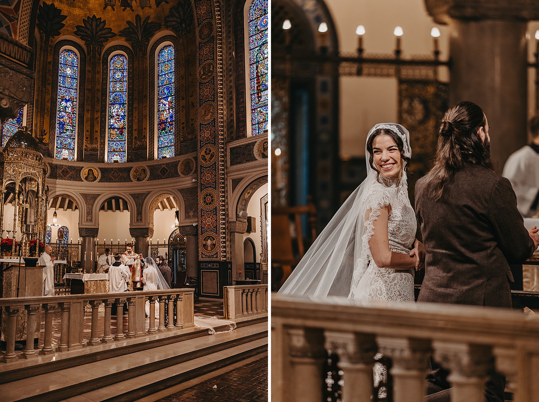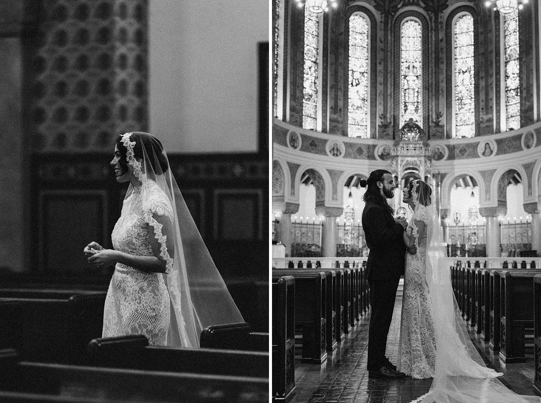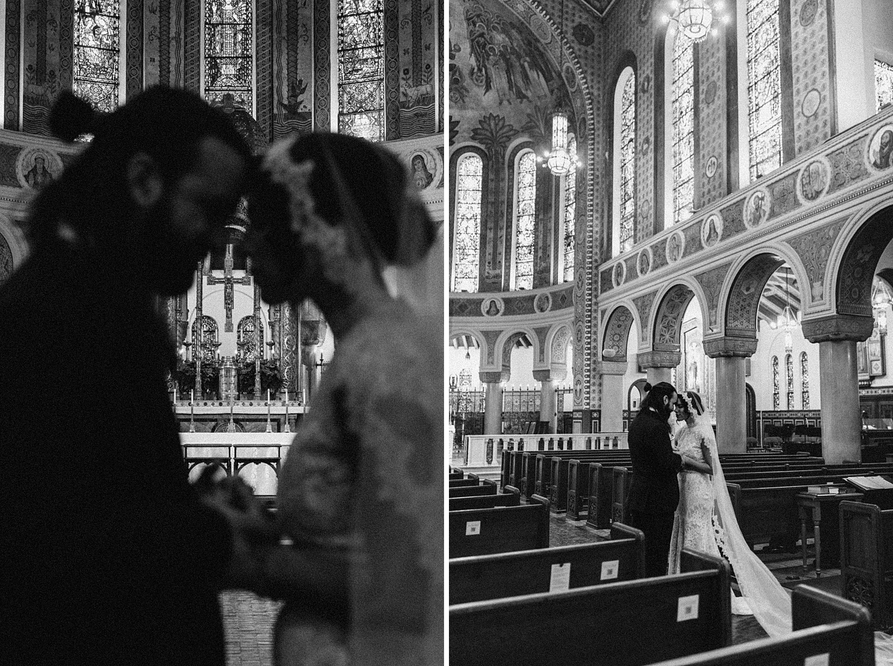 We started the day at a hotel in Kentucky, just across the river from Cincinnati, where both Maria & Benj were getting ready. From there, we headed to their church, the gorgeous St. Monica–St. George Catholic Church, which features stunning stained glass and intricate details everywhere you look. Maria and Benj chose to do a first look (Maria said it was this blogpost that helped them decide!), and the frigid temperatures led us to do it inside the church—which I honestly loved. We were able to take a few quiet moments after their first look for portraits inside the church before too many people arrived, and those are some of my favorites from the entire day.