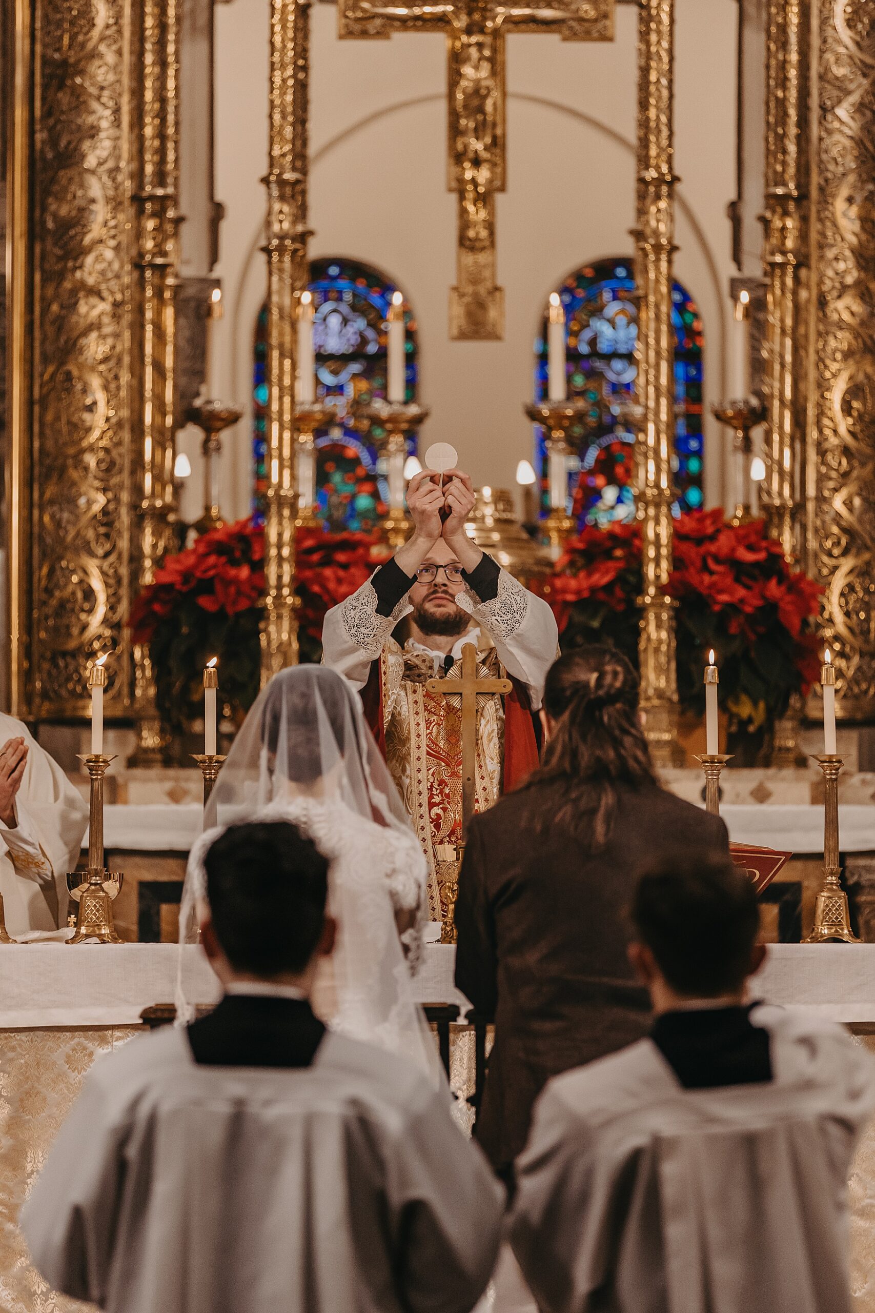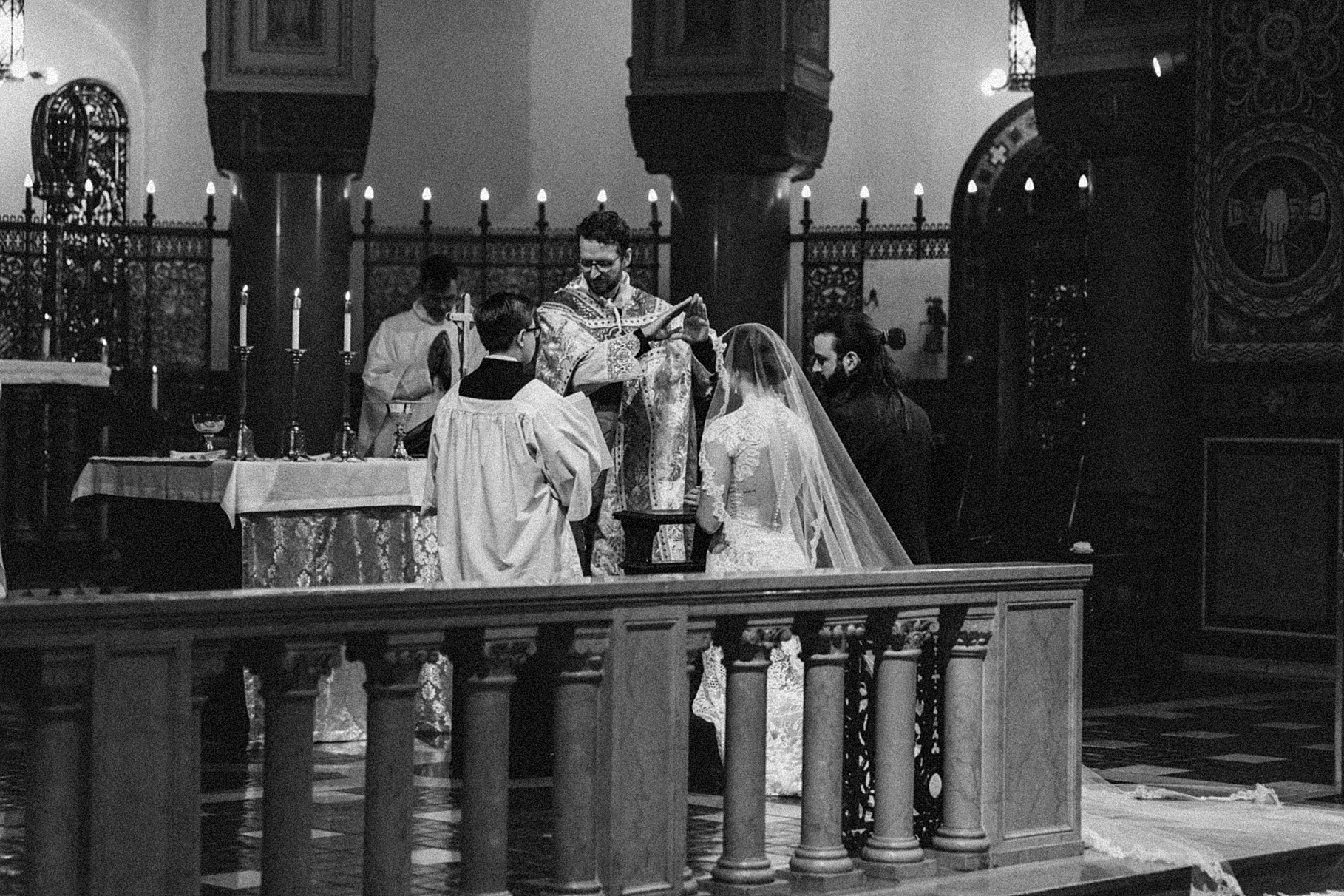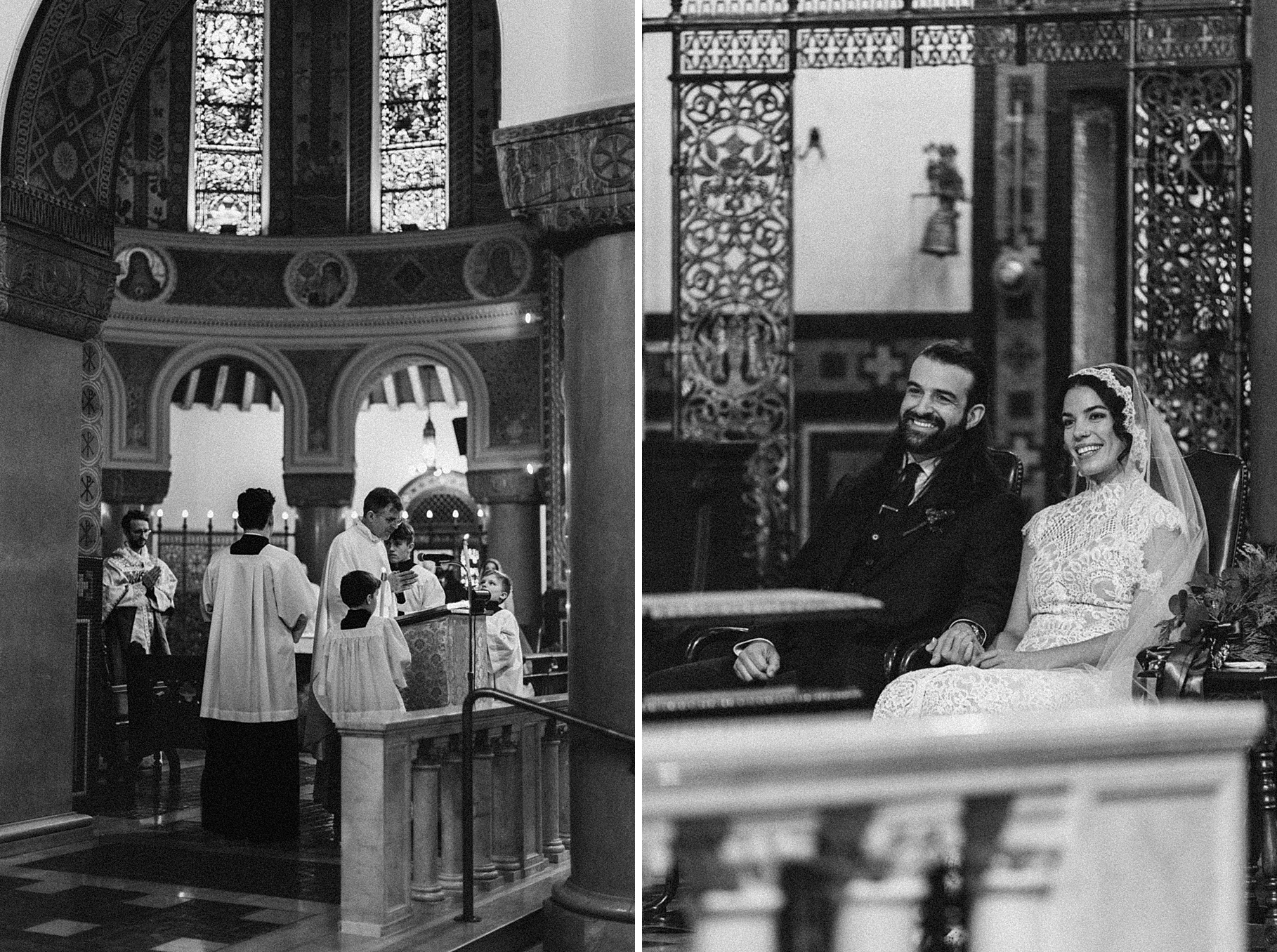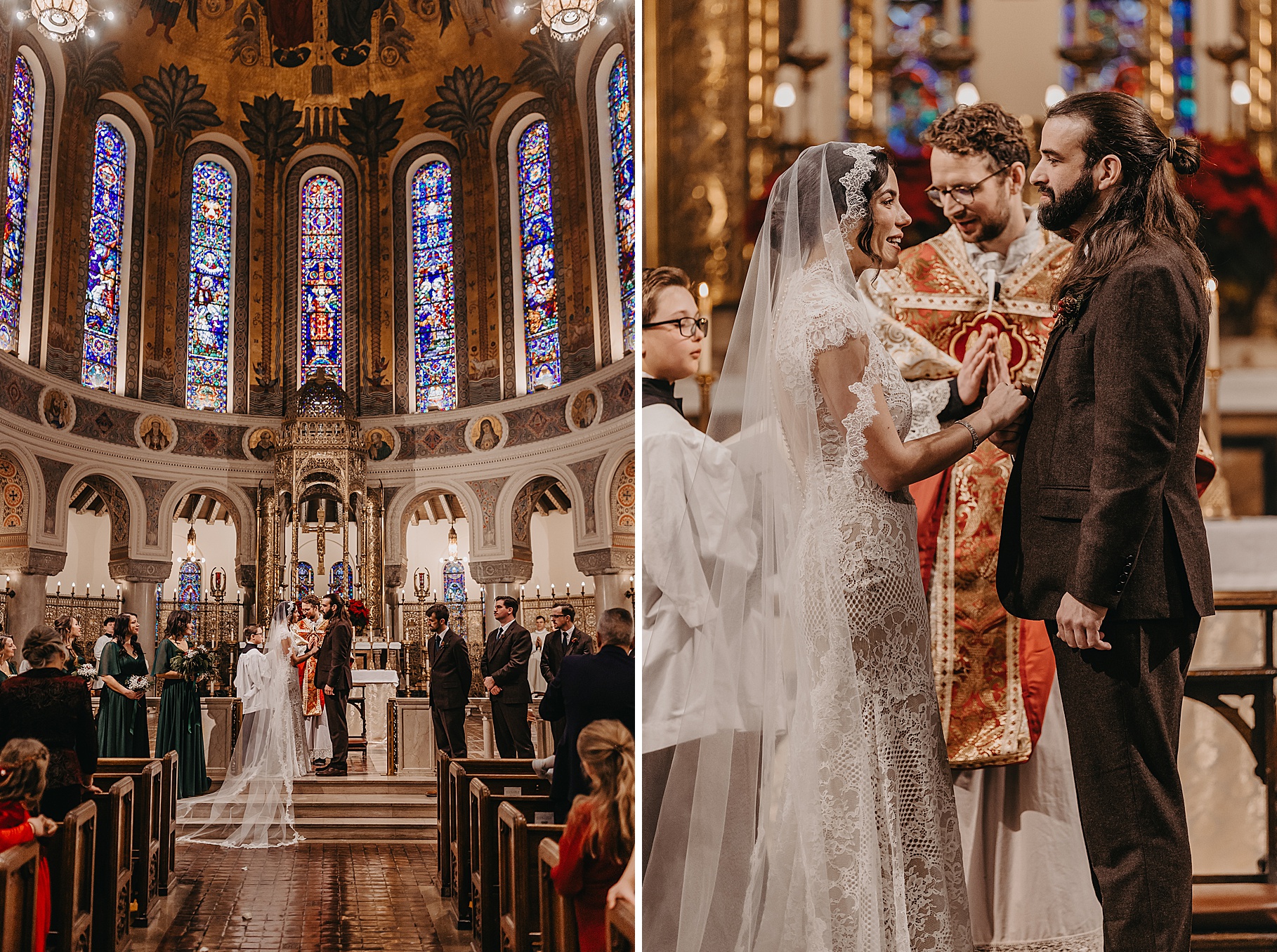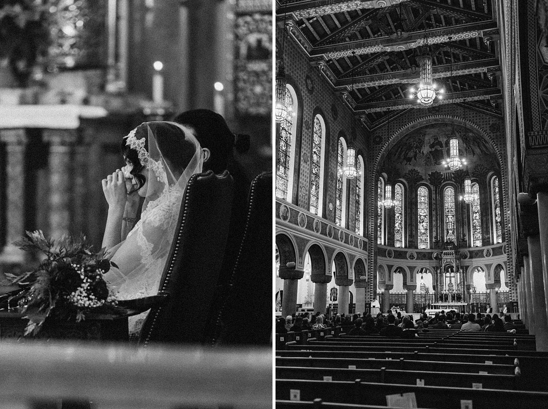 We started the day at a hotel in Kentucky, just across the river from Cincinnati, where both Maria & Benj were getting ready. From there, we headed to their church, the gorgeous St. Monica–St. George Catholic Church, which features stunning stained glass and intricate details everywhere you look. Maria and Benj chose to do a first look (Maria said it was this blogpost that helped them decide!), and the frigid temperatures led us to do it inside the church—which I honestly loved. We were able to take a few quiet moments after their first look for portraits inside the church before too many people arrived, and those are some of my favorites from the entire day.