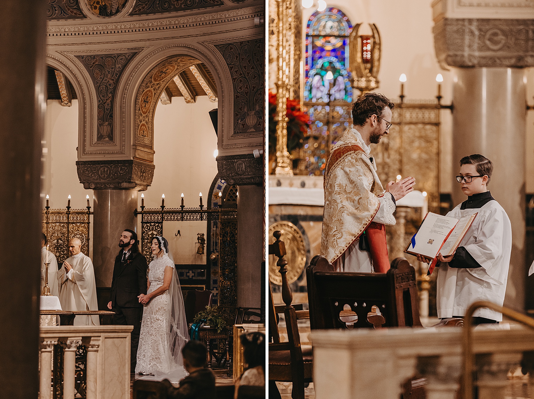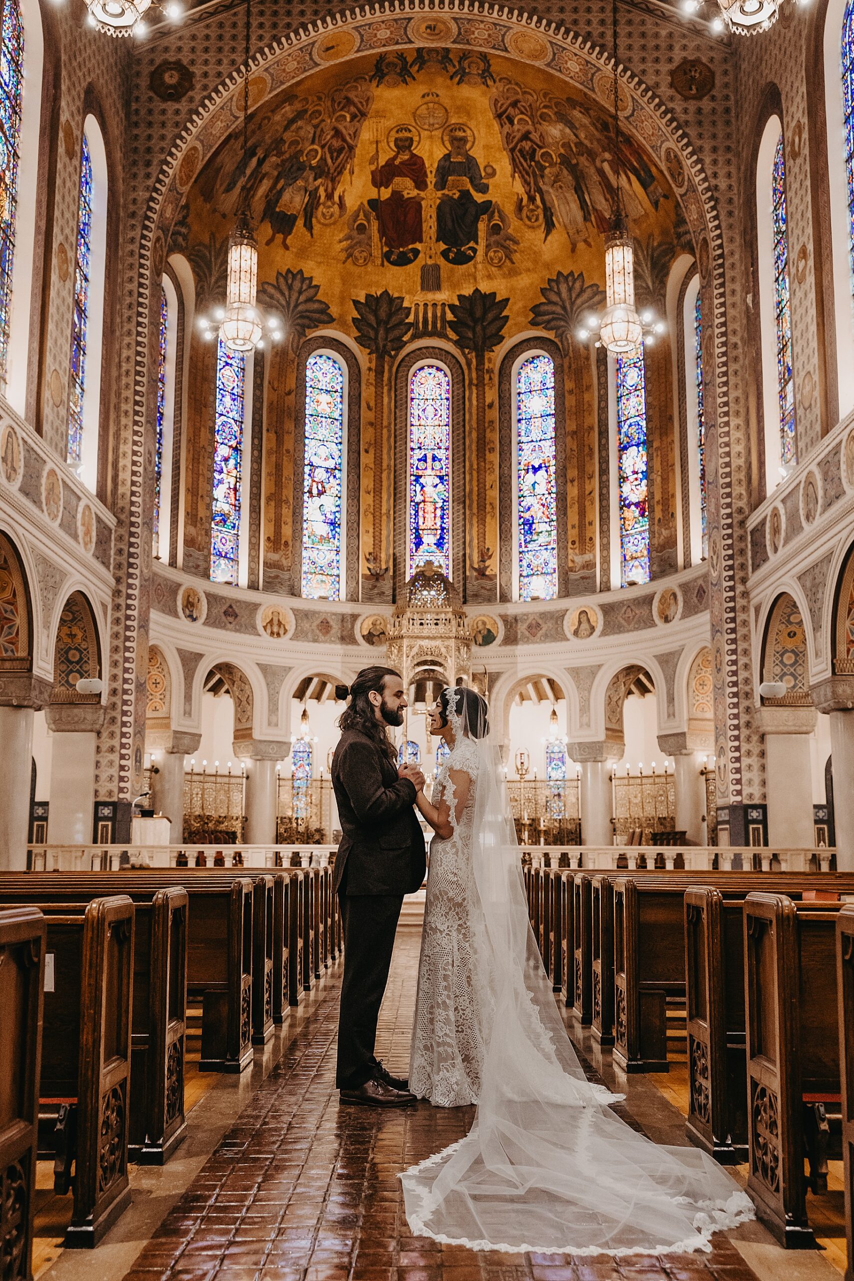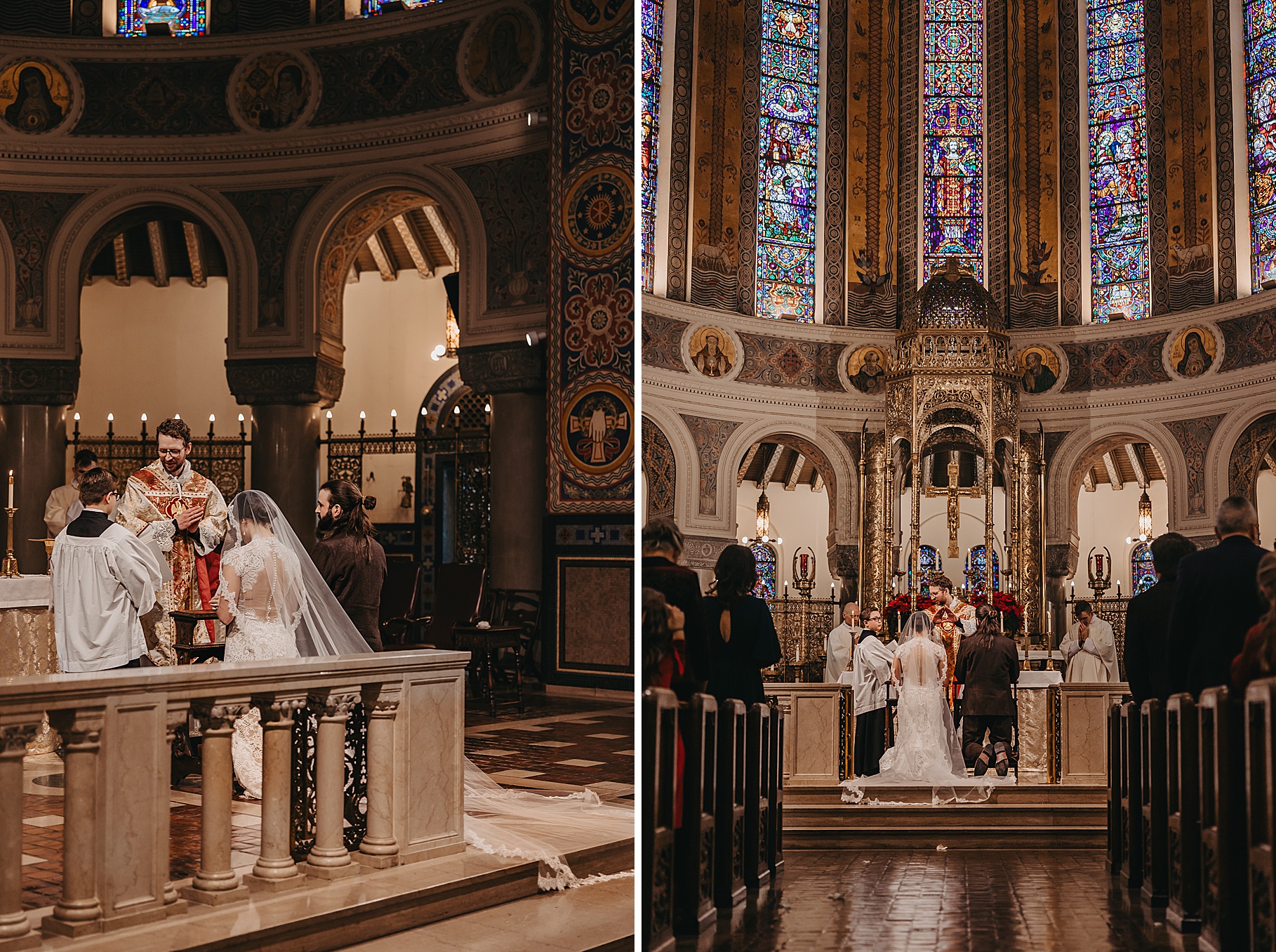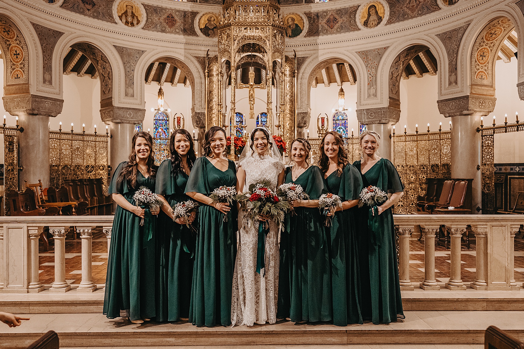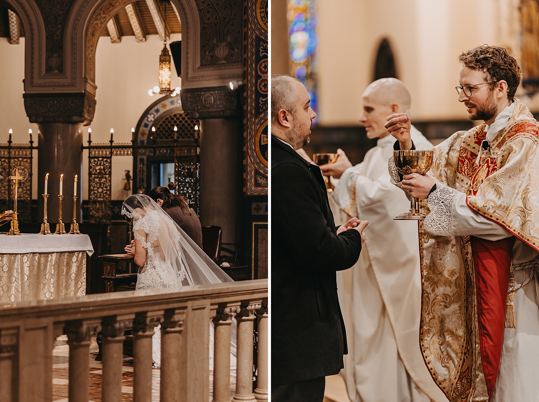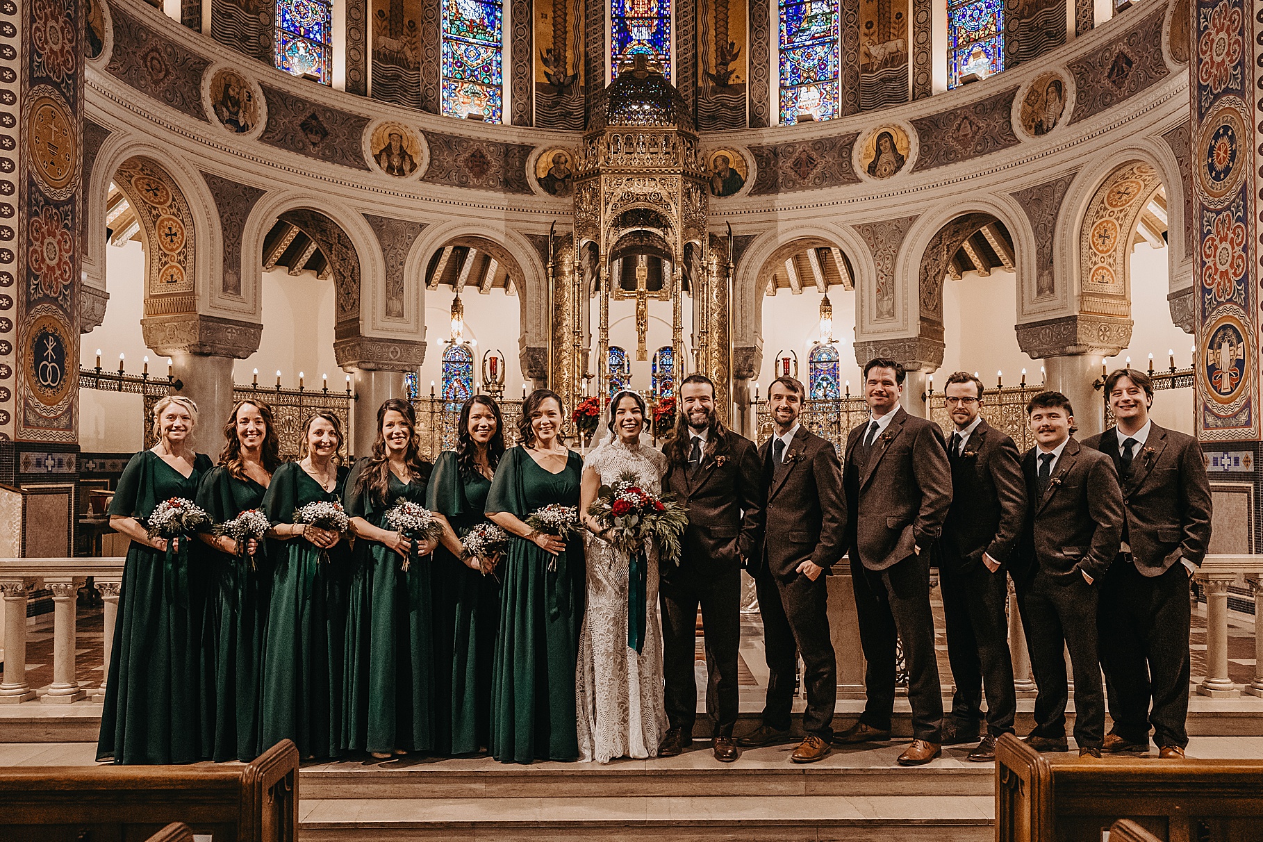 We started the day at a hotel in Kentucky, just across the river from Cincinnati, where both Maria & Benj were getting ready. From there, we headed to their church, the gorgeous St. Monica–St. George Catholic Church, which features stunning stained glass and intricate details everywhere you look. Maria and Benj chose to do a first look (Maria said it was this blogpost that helped them decide!), and the frigid temperatures led us to do it inside the church—which I honestly loved. We were able to take a few quiet moments after their first look for portraits inside the church before too many people arrived, and those are some of my favorites from the entire day.