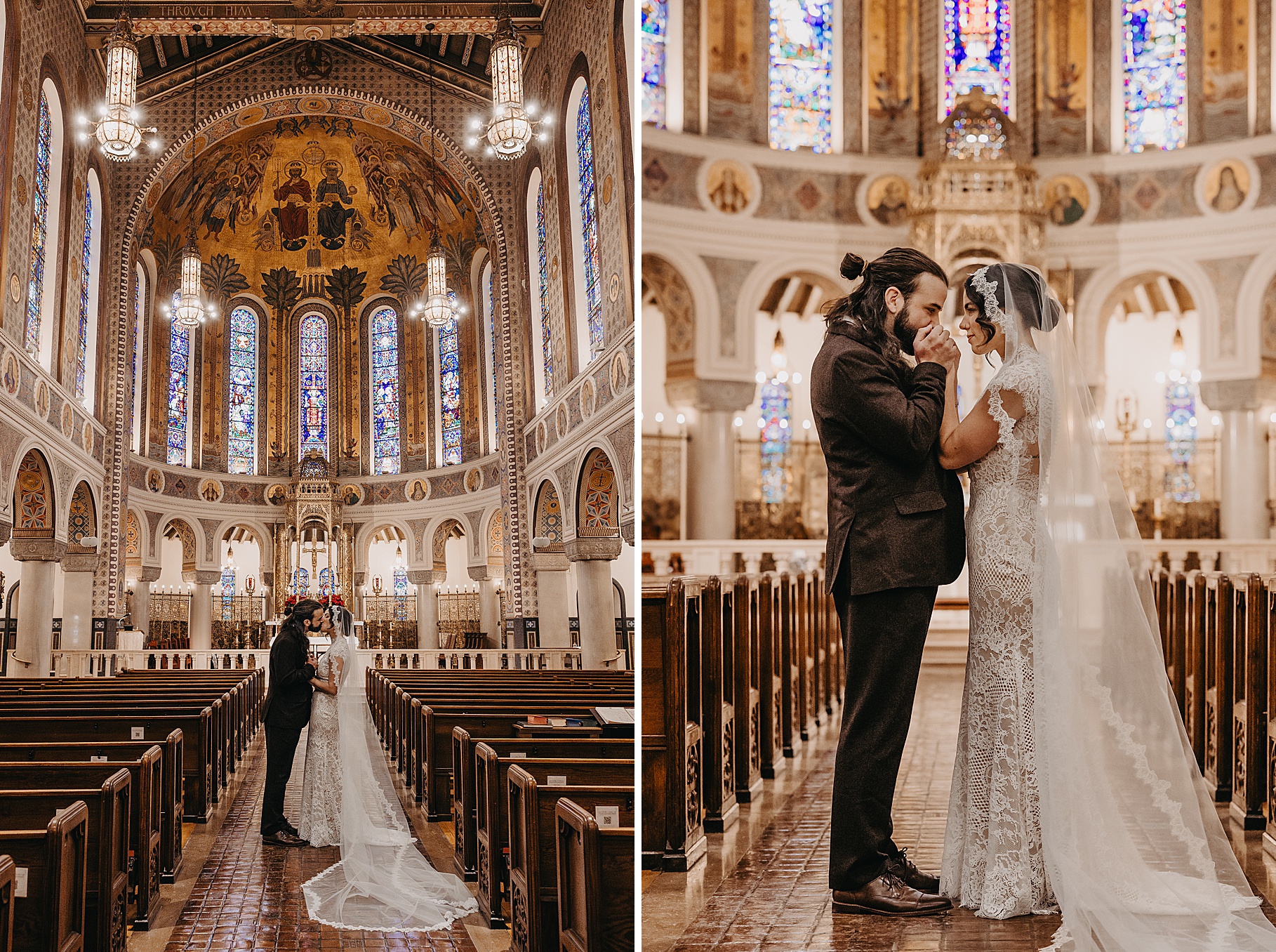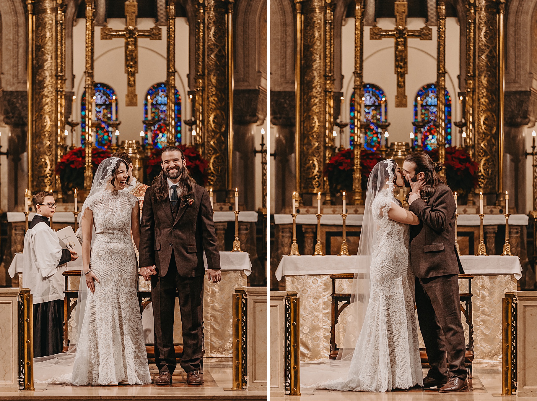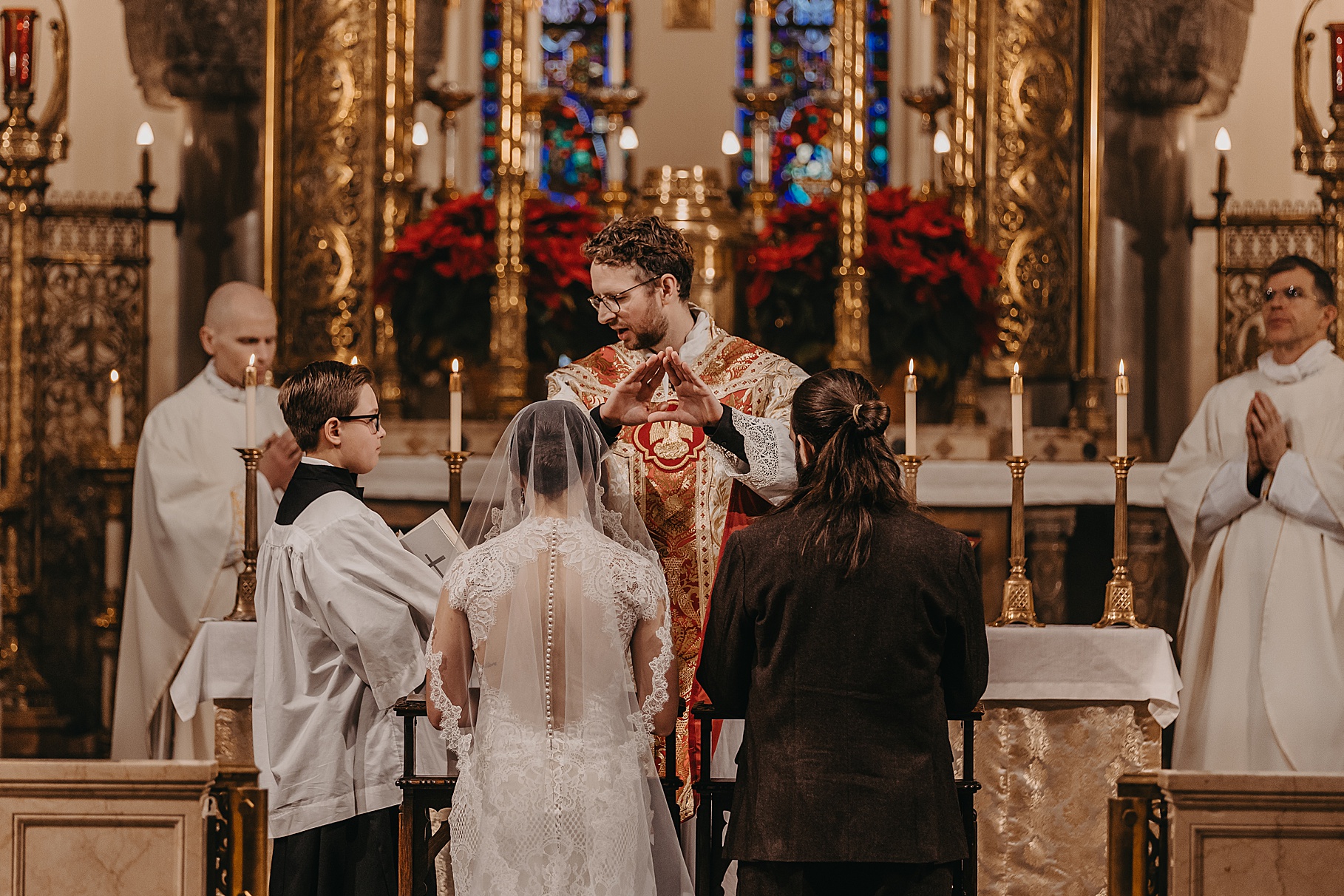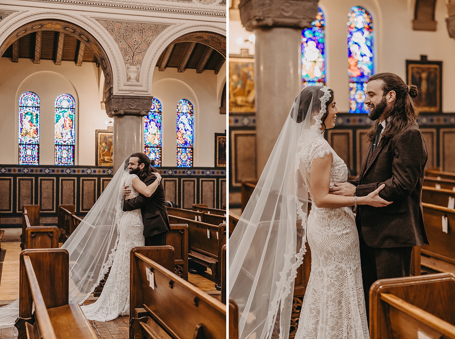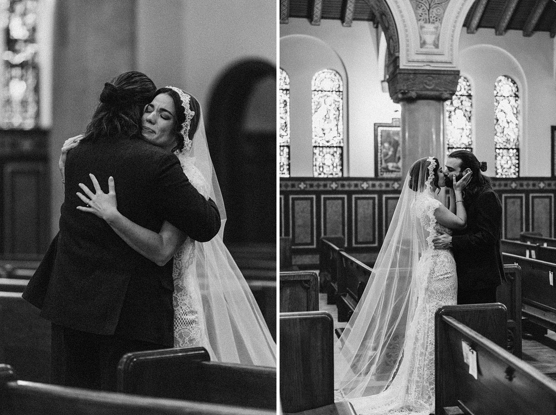We started the day at a hotel in Kentucky, just across the river from Cincinnati, where both Maria & Benj were getting ready. From there, we headed to their church, the gorgeous St. Monica–St. George Catholic Church, which features stunning stained glass and intricate details everywhere you look. Maria and Benj chose to do a first look (Maria said it was this blogpost that helped them decide!), and the frigid temperatures led us to do it inside the church—which I honestly loved. We were able to take a few quiet moments after their first look for portraits inside the church before too many people arrived, and those are some of my favorites from the entire day.