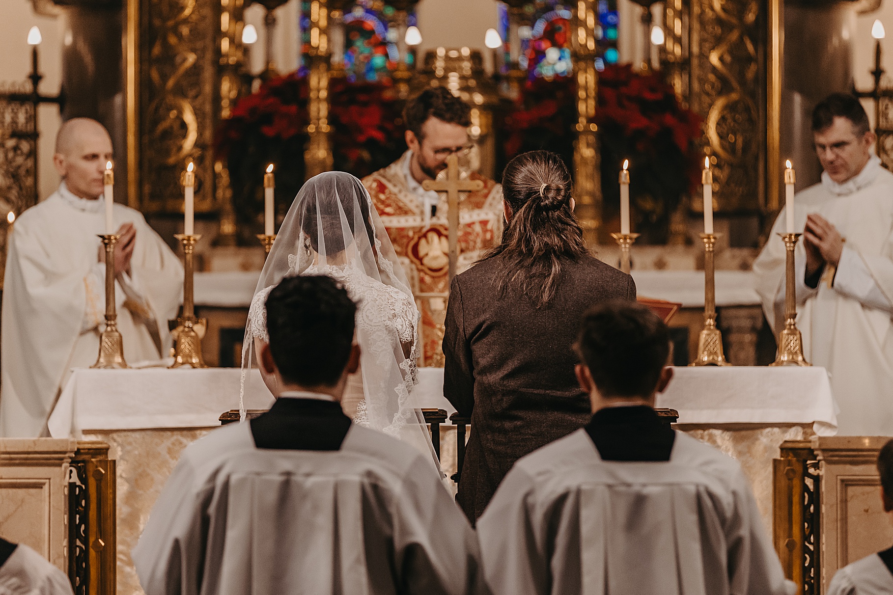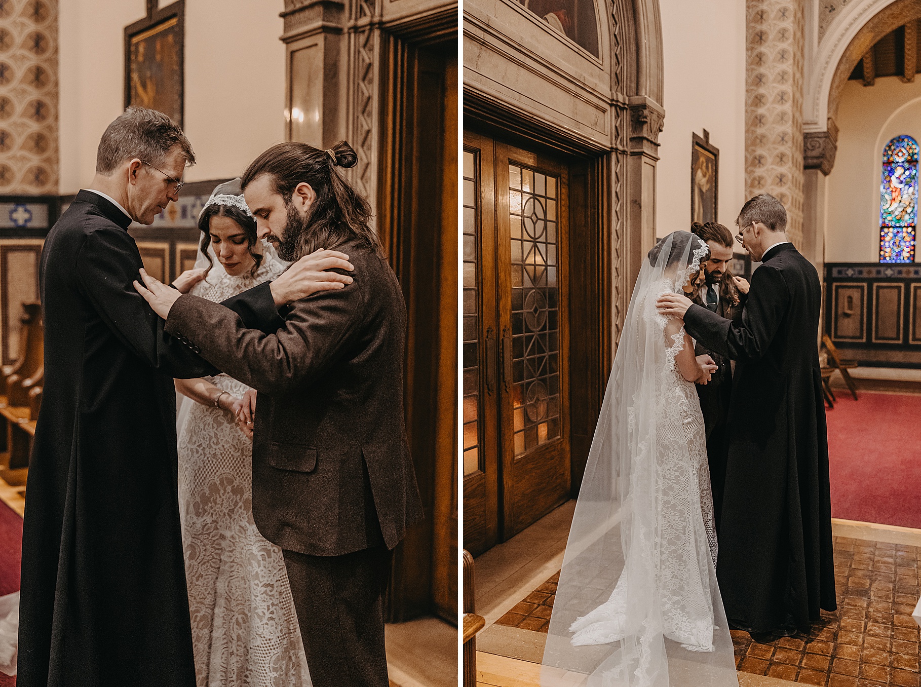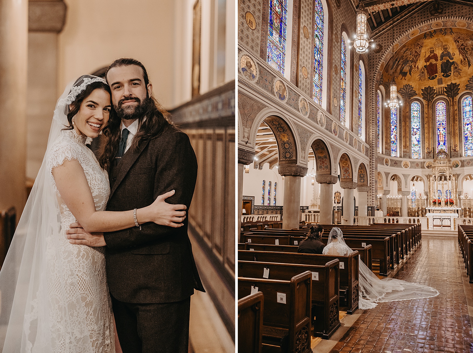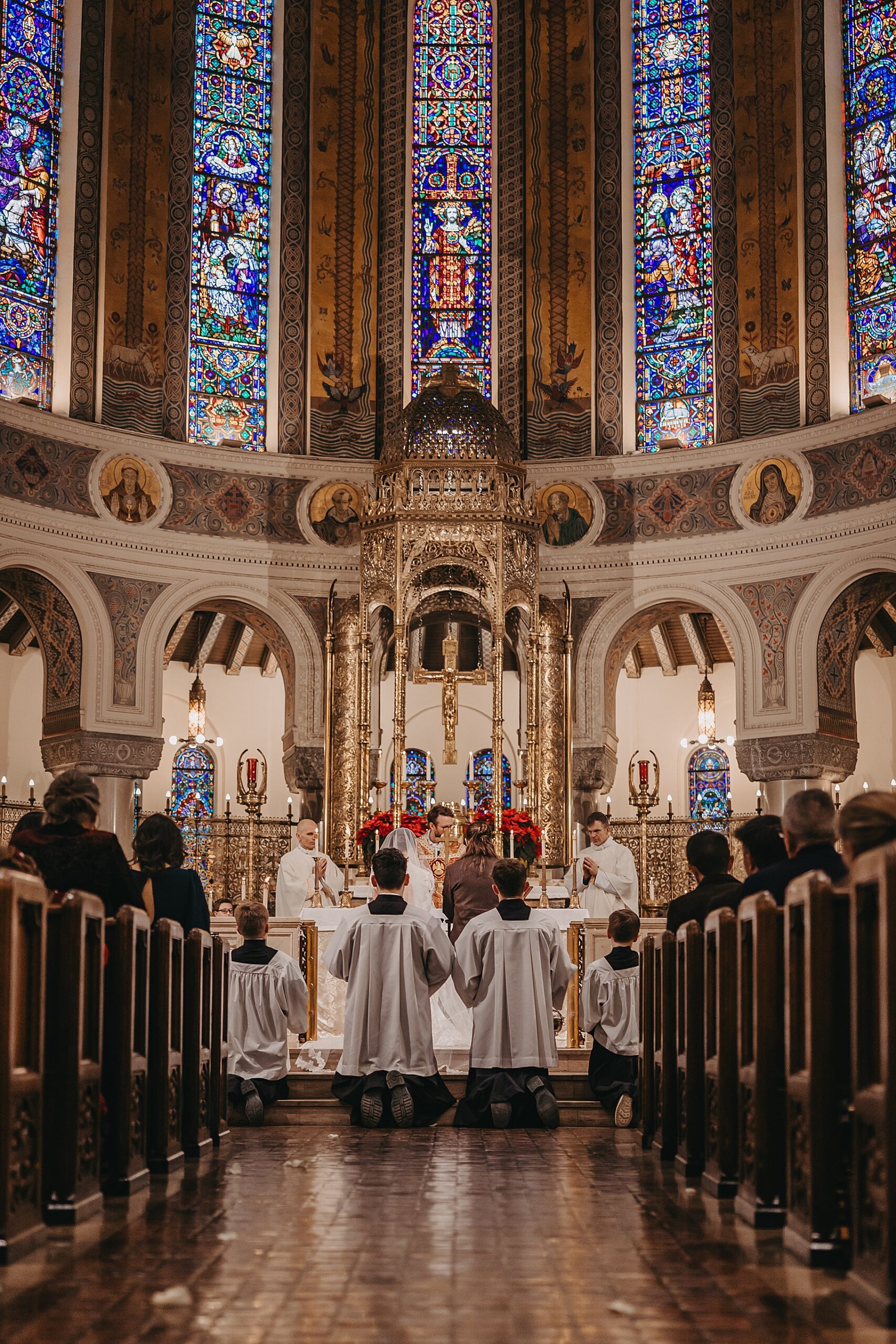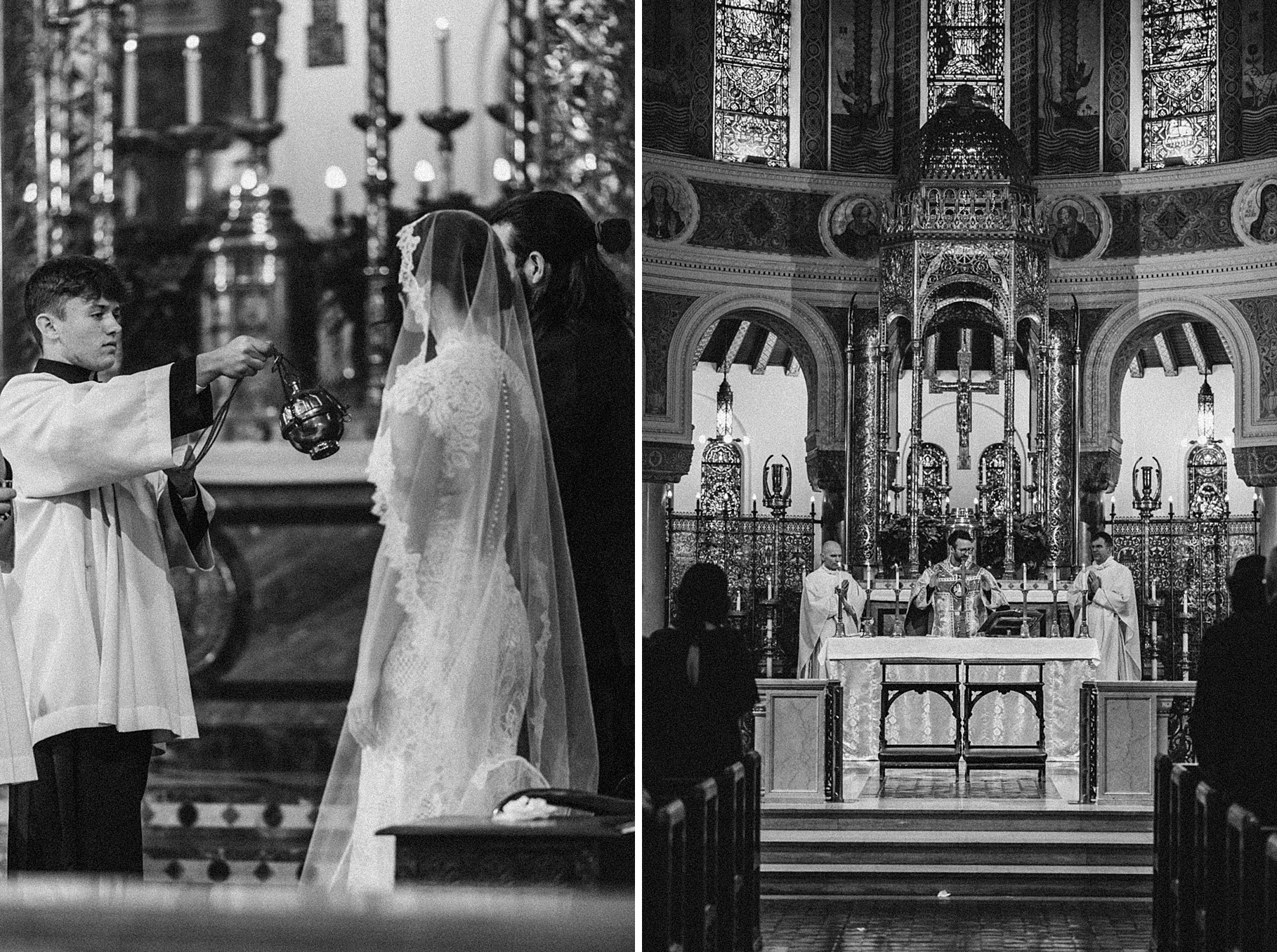 We started the day at a hotel in Kentucky, just across the river from Cincinnati, where both Maria & Benj were getting ready. From there, we headed to their church, the gorgeous St. Monica–St. George Catholic Church, which features stunning stained glass and intricate details everywhere you look. Maria and Benj chose to do a first look (Maria said it was this blogpost that helped them decide!), and the frigid temperatures led us to do it inside the church—which I honestly loved. We were able to take a few quiet moments after their first look for portraits inside the church before too many people arrived, and those are some of my favorites from the entire day.