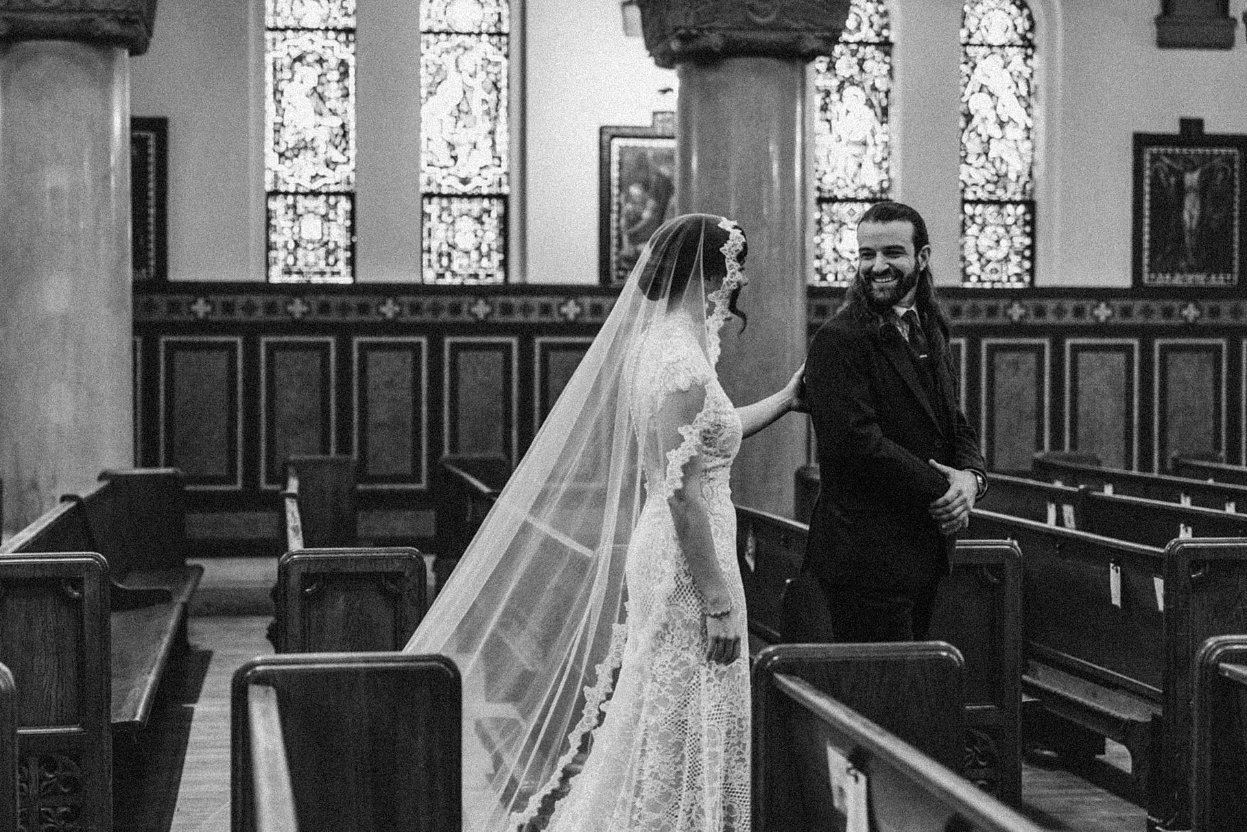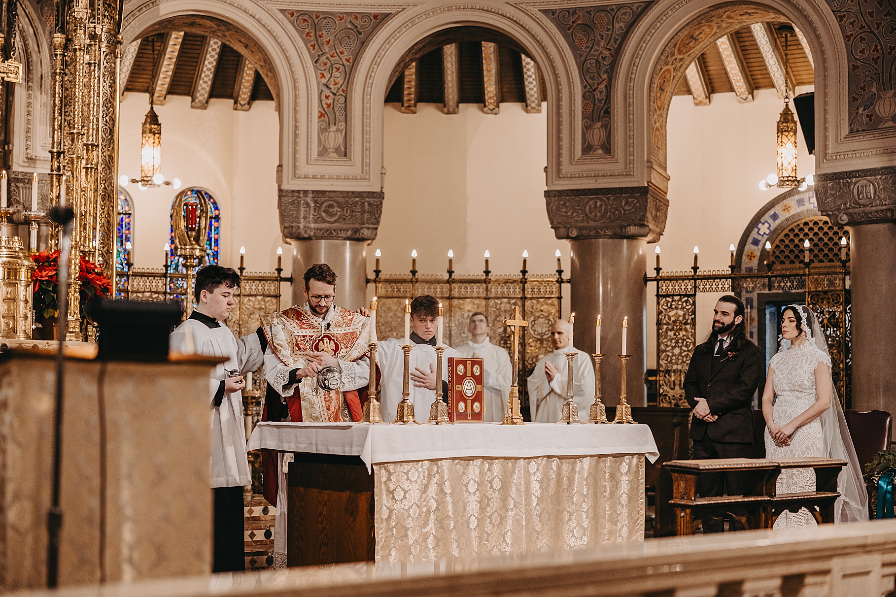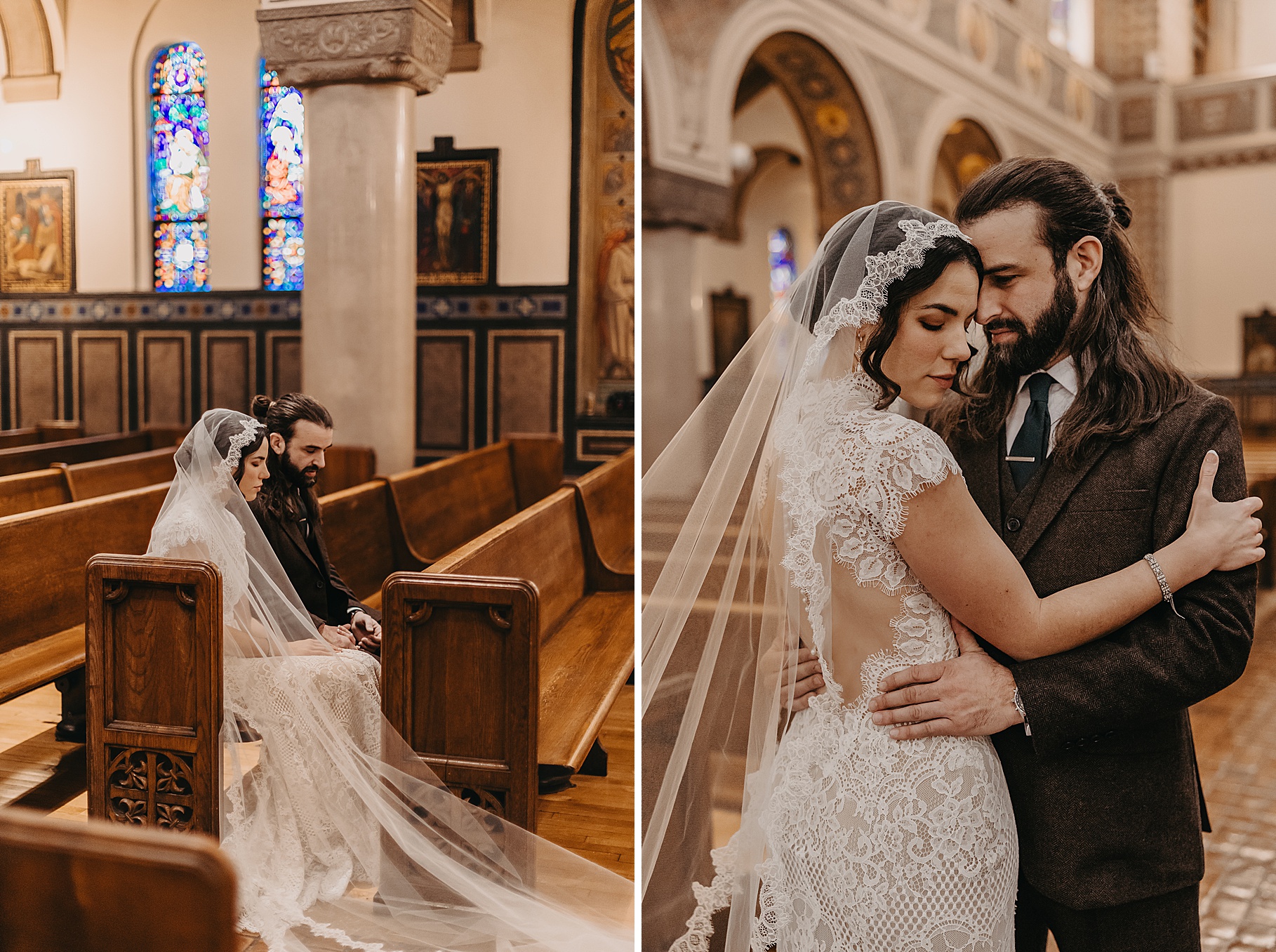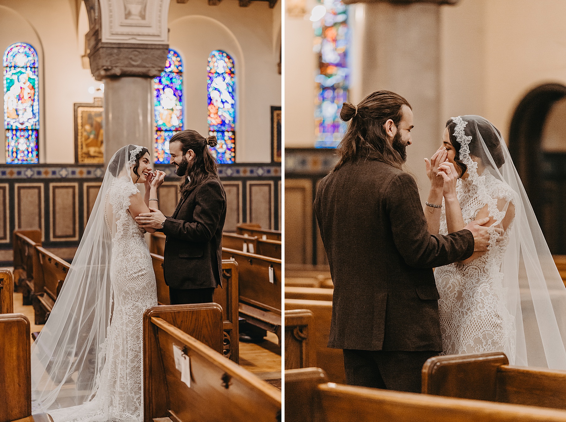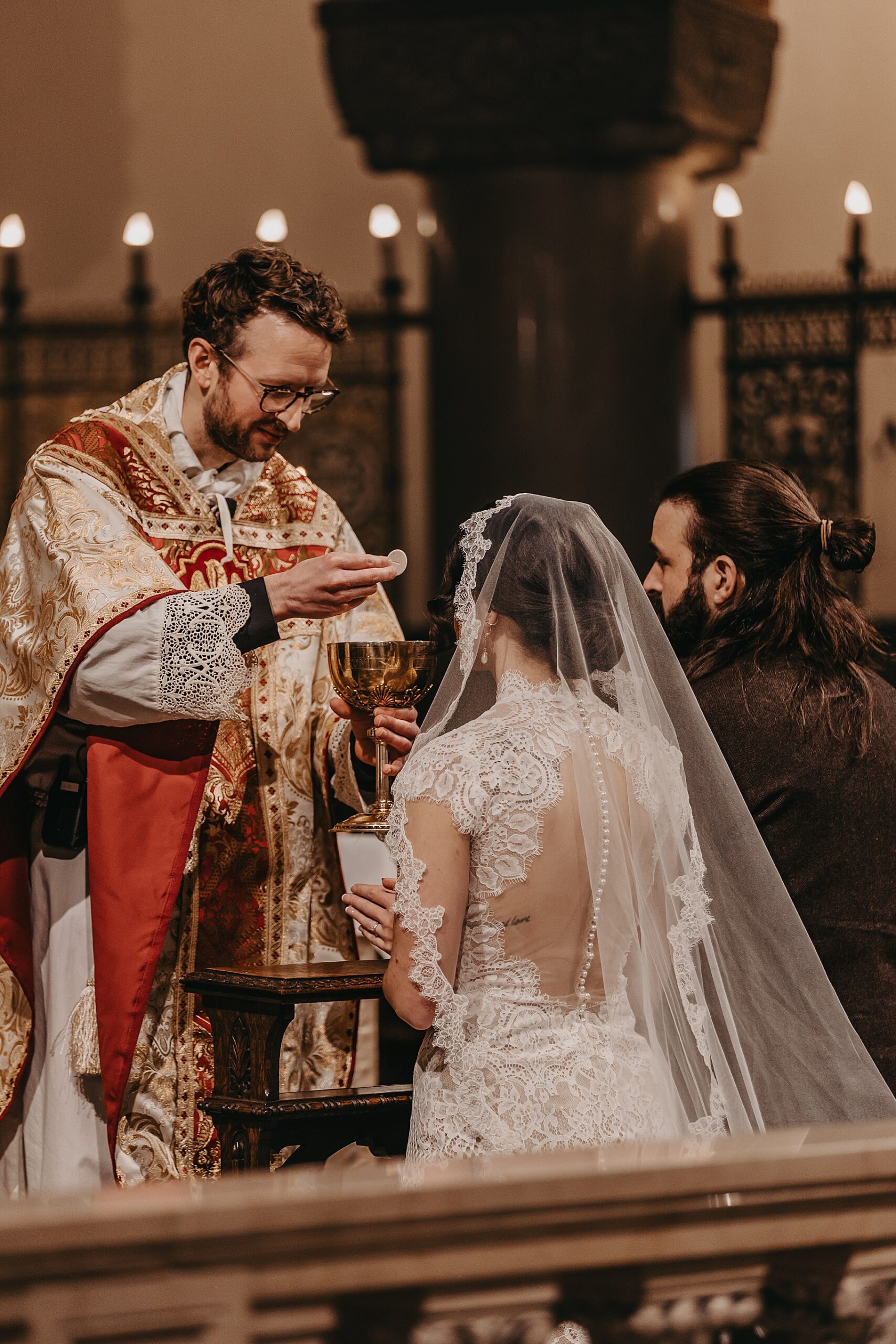 We started the day at a hotel in Kentucky, just across the river from Cincinnati, where both Maria & Benj were getting ready. From there, we headed to their church, the gorgeous St. Monica–St. George Catholic Church, which features stunning stained glass and intricate details everywhere you look. Maria and Benj chose to do a first look (Maria said it was this blogpost that helped them decide!), and the frigid temperatures led us to do it inside the church—which I honestly loved. We were able to take a few quiet moments after their first look for portraits inside the church before too many people arrived, and those are some of my favorites from the entire day.