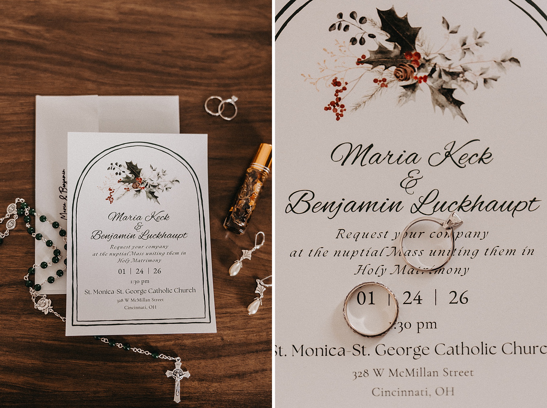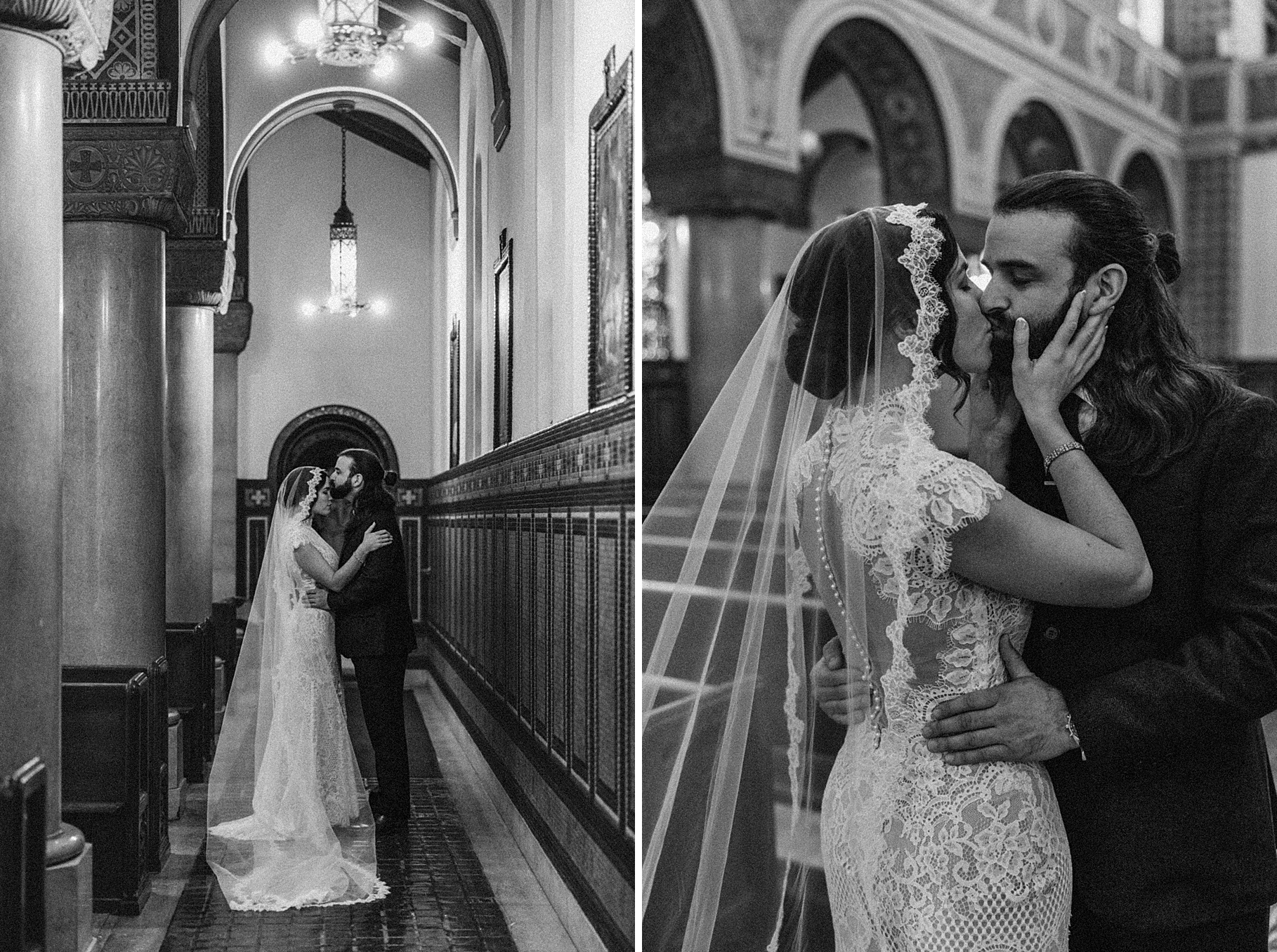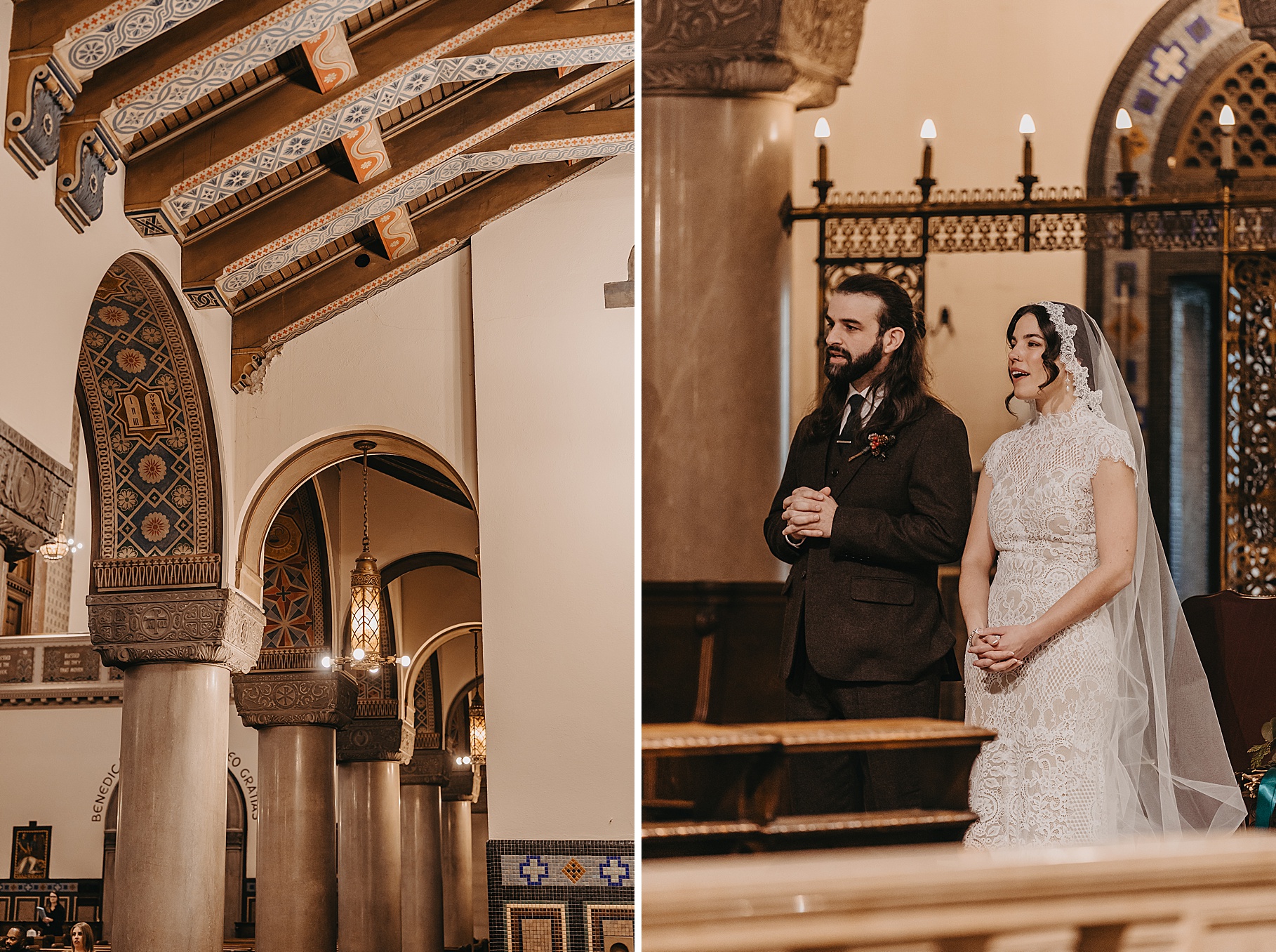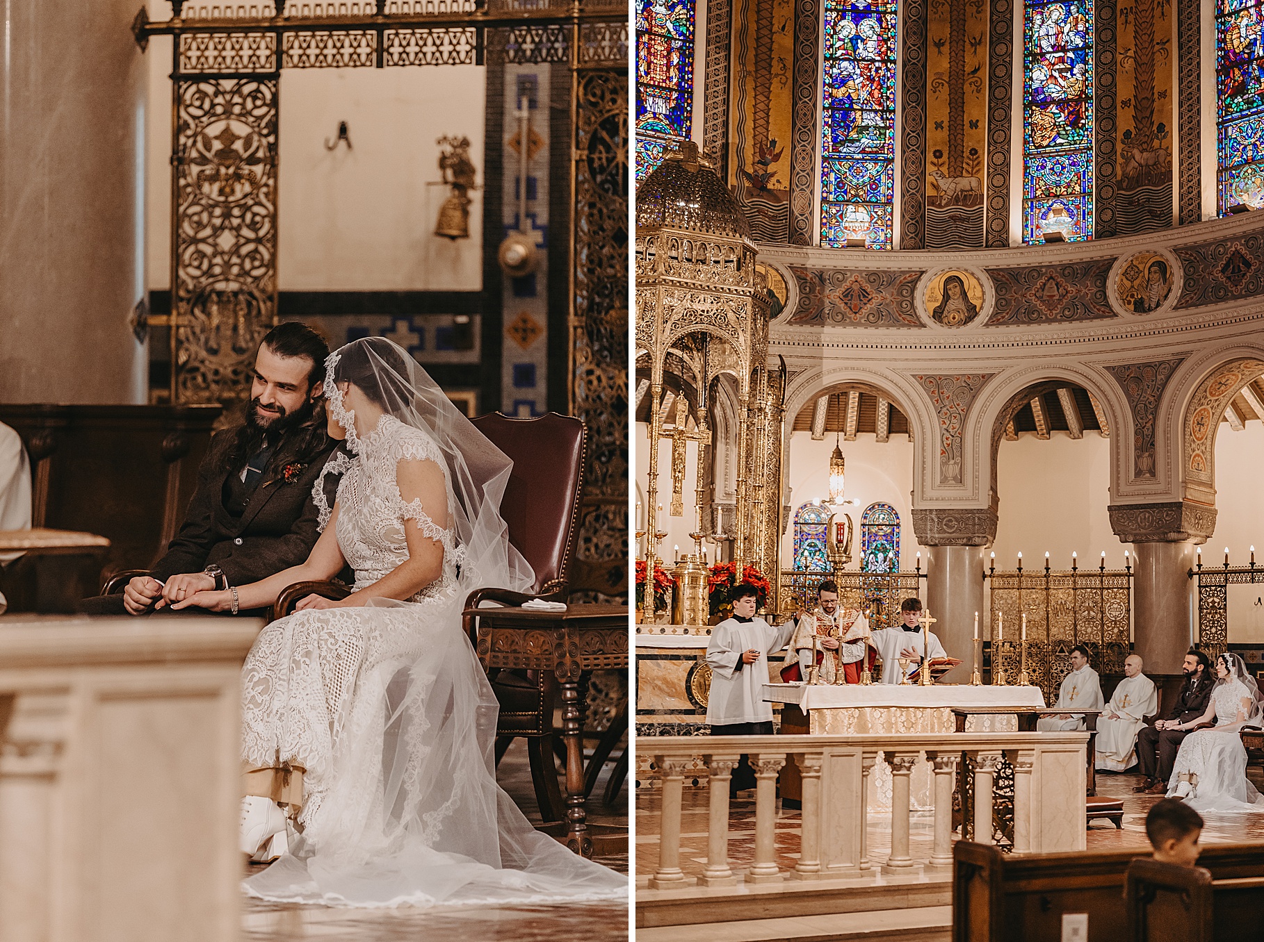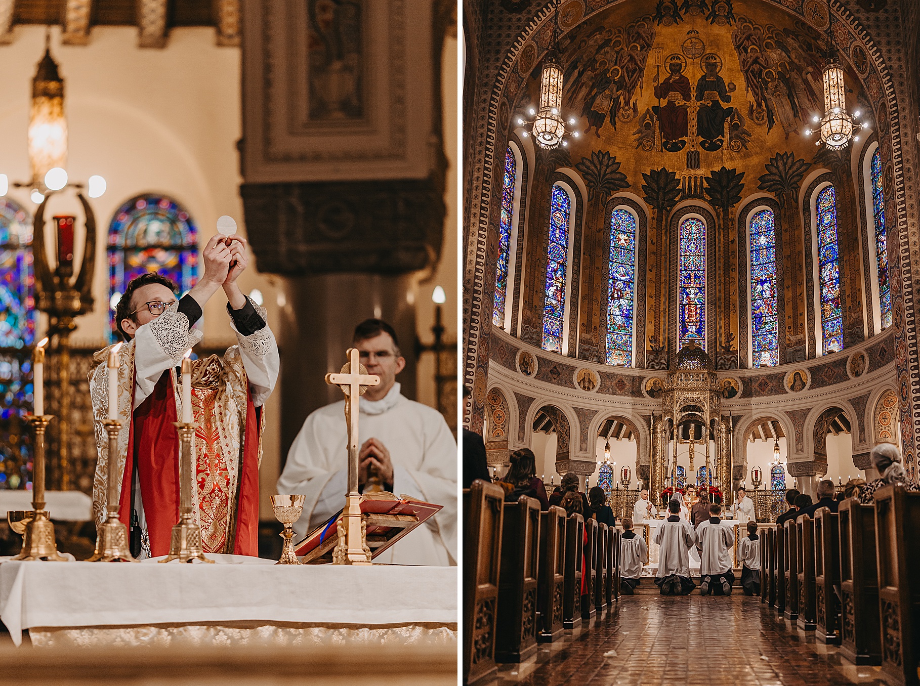 We started the day at a hotel in Kentucky, just across the river from Cincinnati, where both Maria & Benj were getting ready. From there, we headed to their church, the gorgeous St. Monica–St. George Catholic Church, which features stunning stained glass and intricate details everywhere you look. Maria and Benj chose to do a first look (Maria said it was this blogpost that helped them decide!), and the frigid temperatures led us to do it inside the church—which I honestly loved. We were able to take a few quiet moments after their first look for portraits inside the church before too many people arrived, and those are some of my favorites from the entire day.