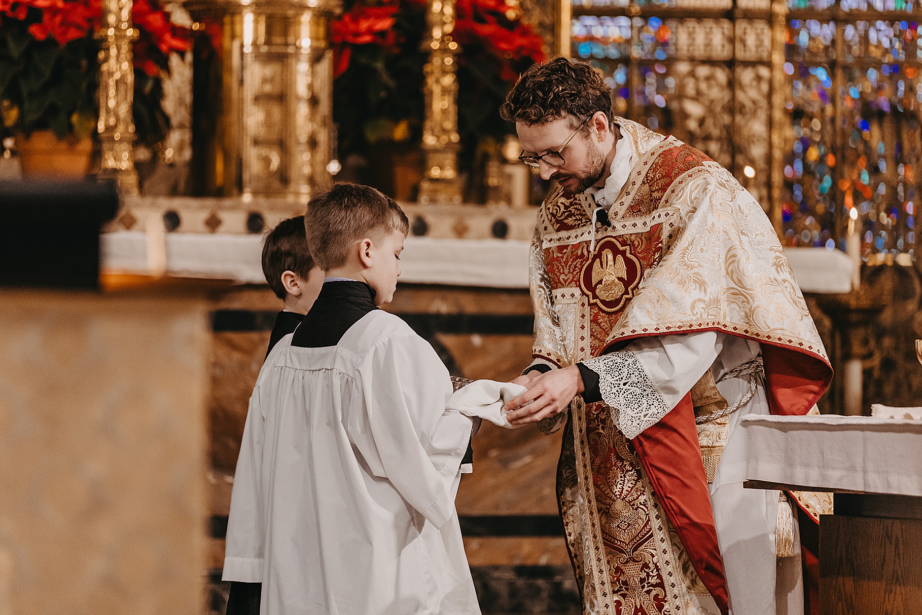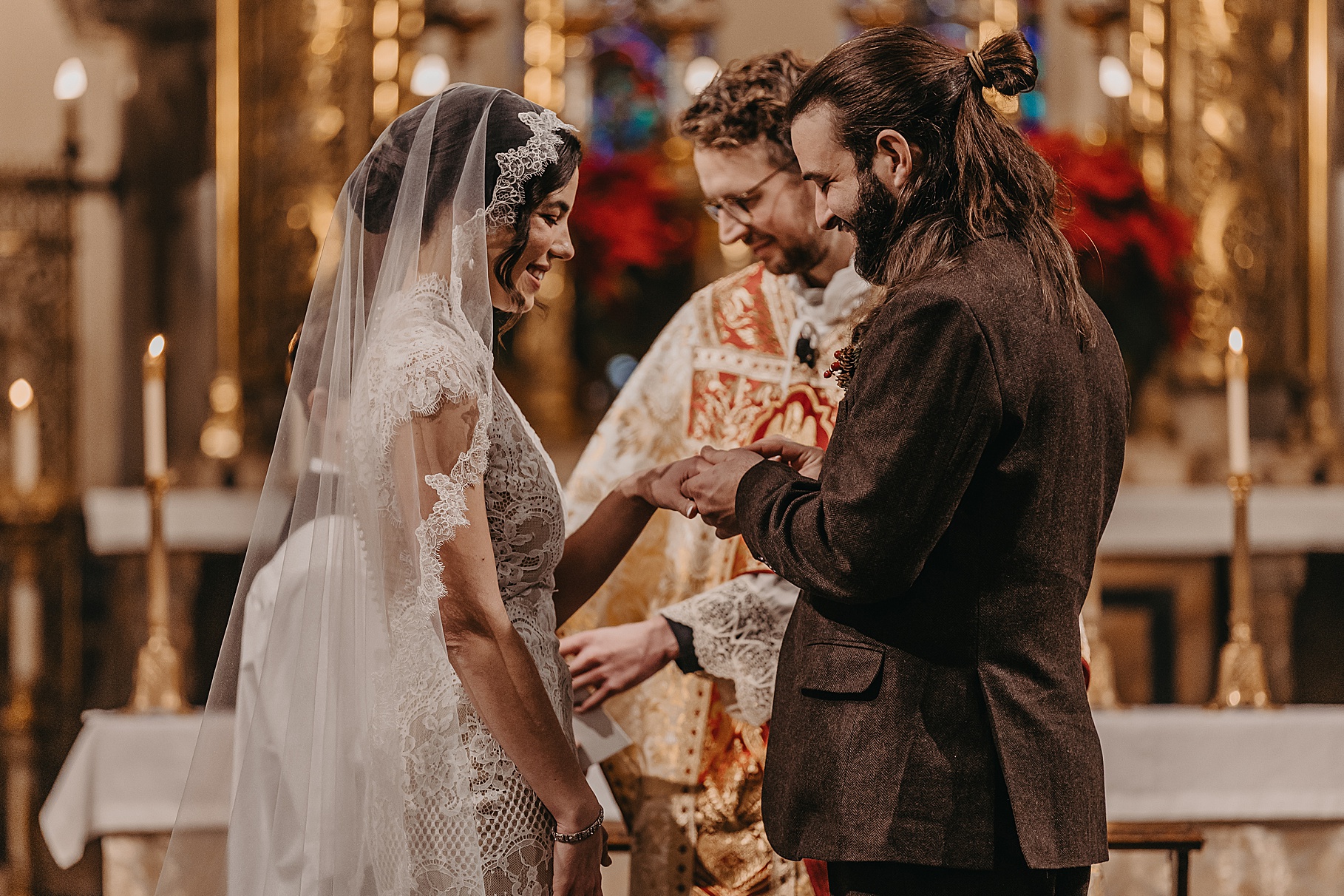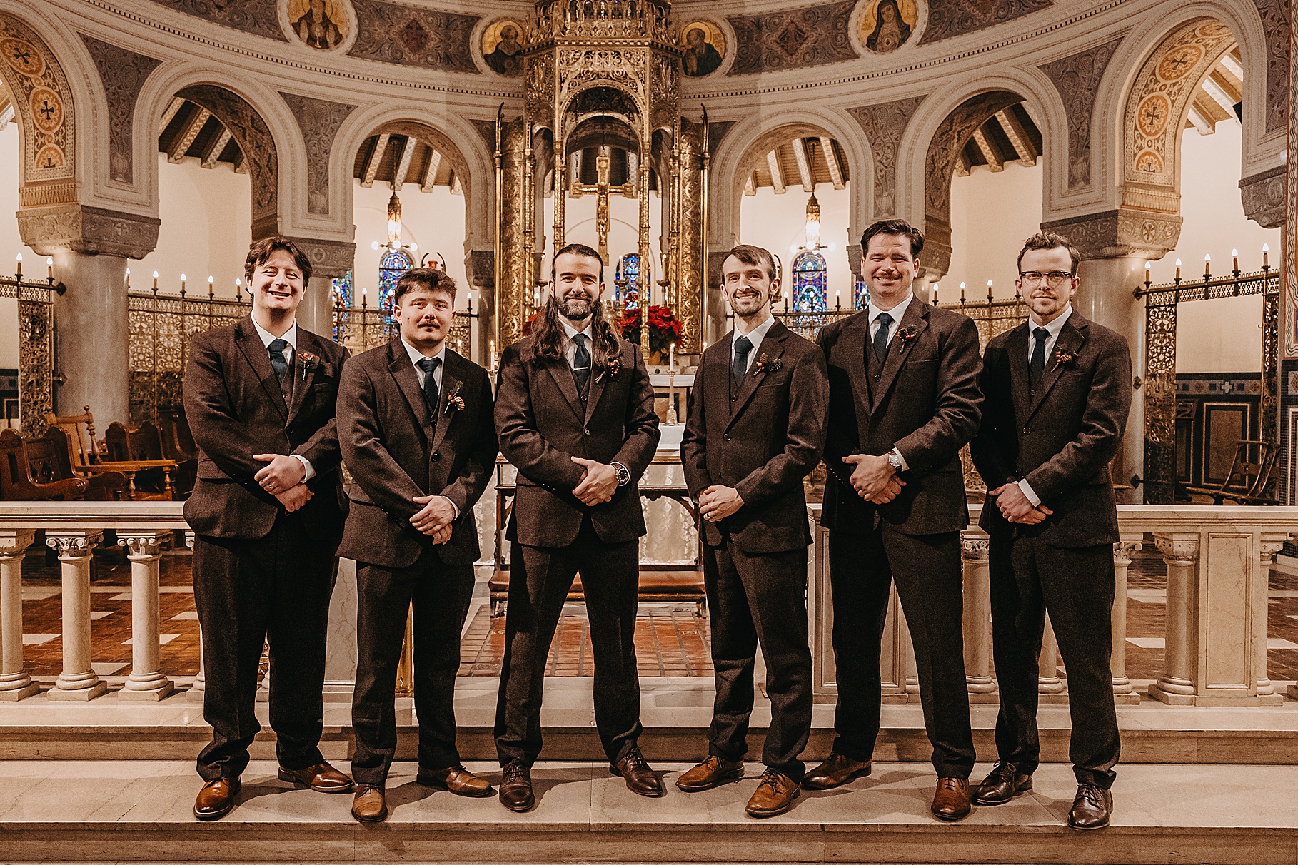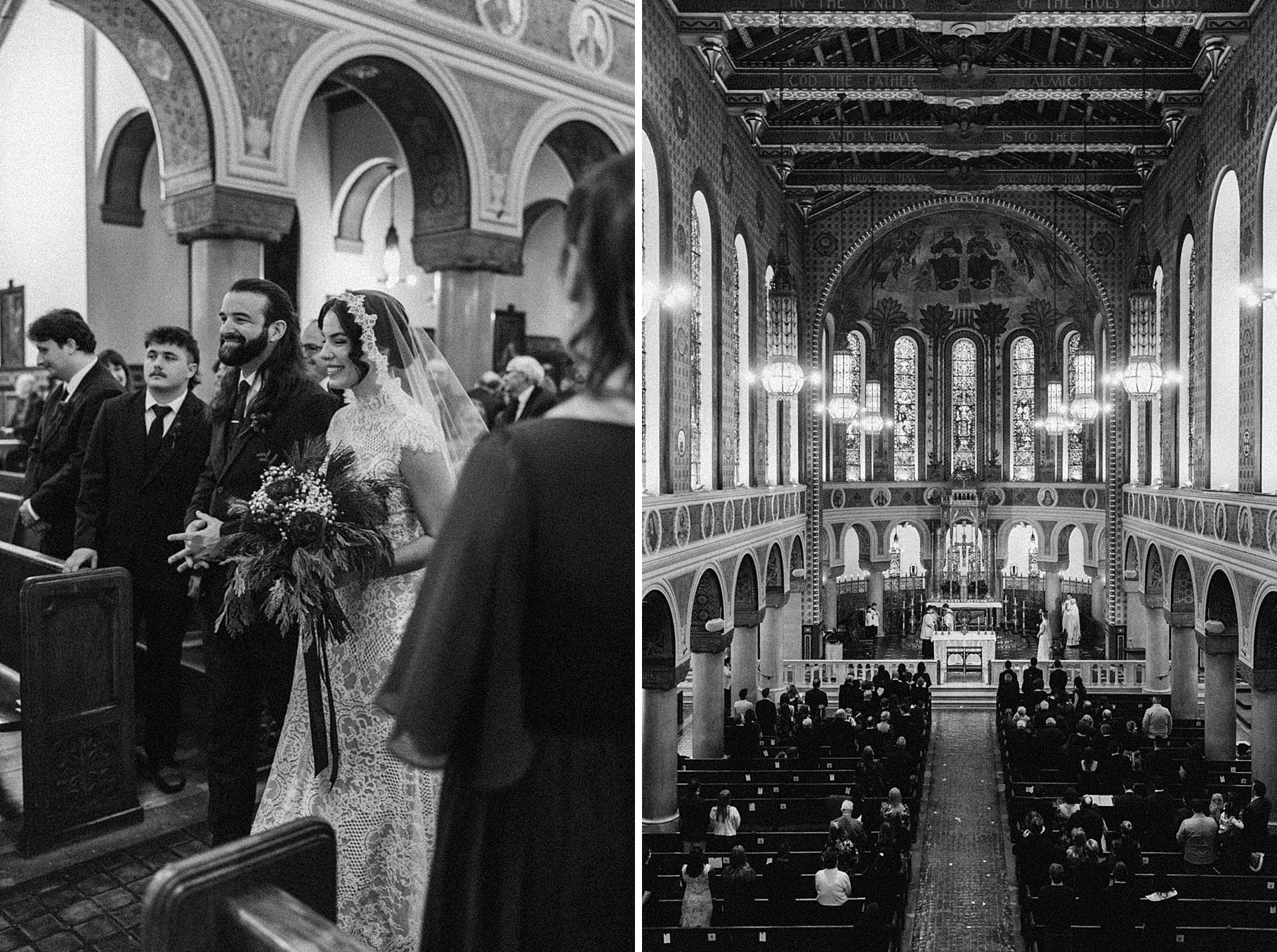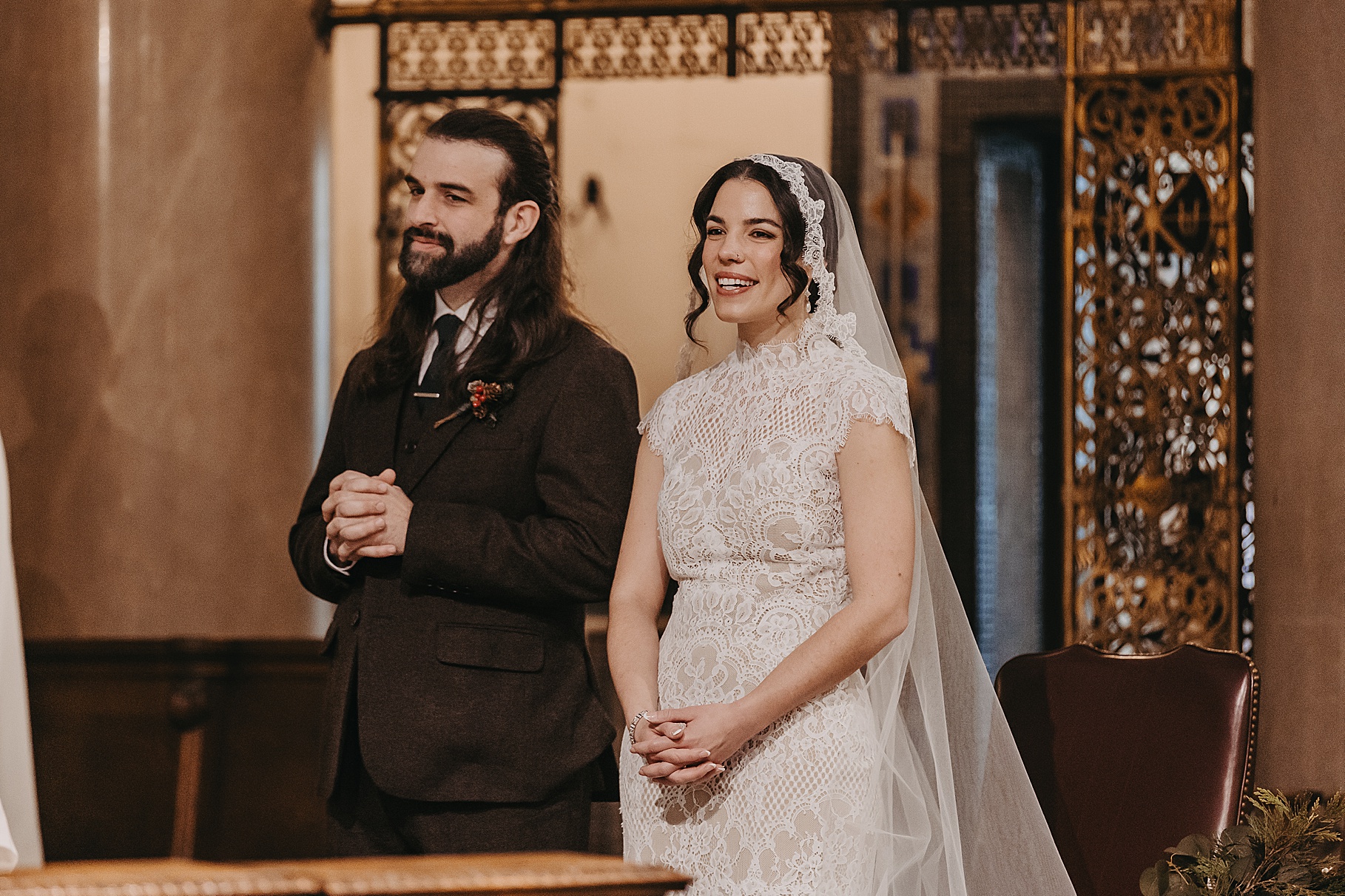 We started the day at a hotel in Kentucky, just across the river from Cincinnati, where both Maria & Benj were getting ready. From there, we headed to their church, the gorgeous St. Monica–St. George Catholic Church, which features stunning stained glass and intricate details everywhere you look. Maria and Benj chose to do a first look (Maria said it was this blogpost that helped them decide!), and the frigid temperatures led us to do it inside the church—which I honestly loved. We were able to take a few quiet moments after their first look for portraits inside the church before too many people arrived, and those are some of my favorites from the entire day.