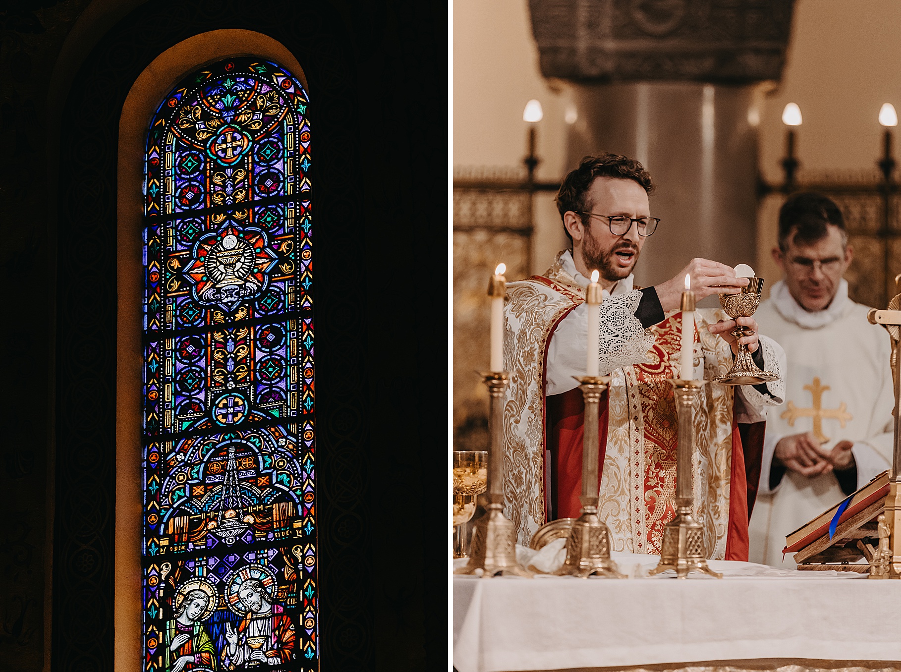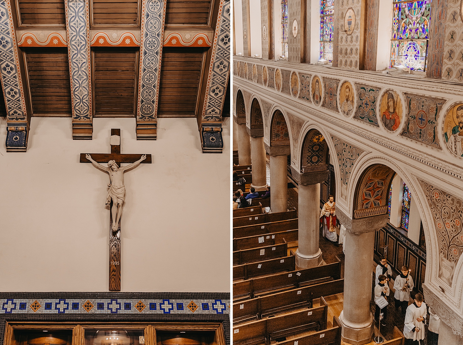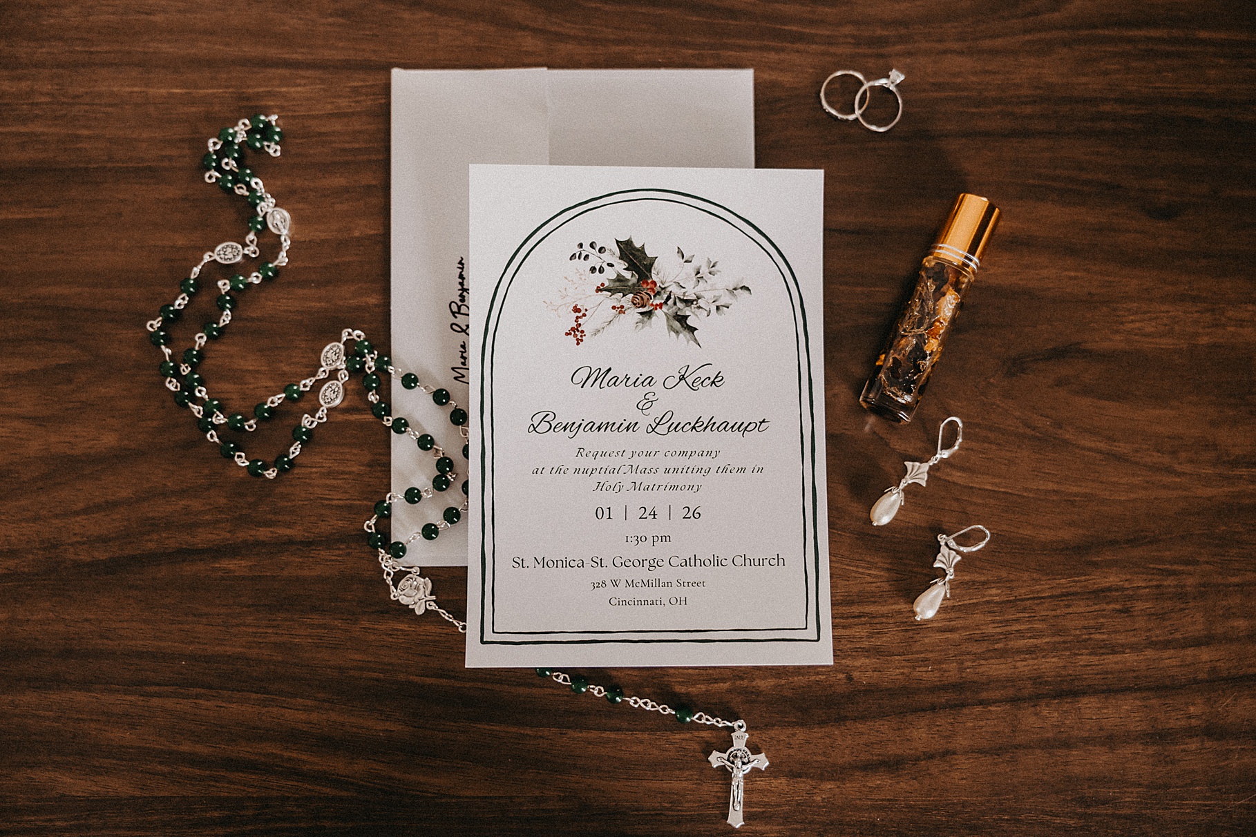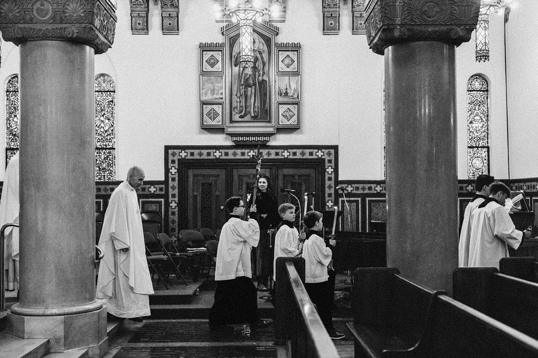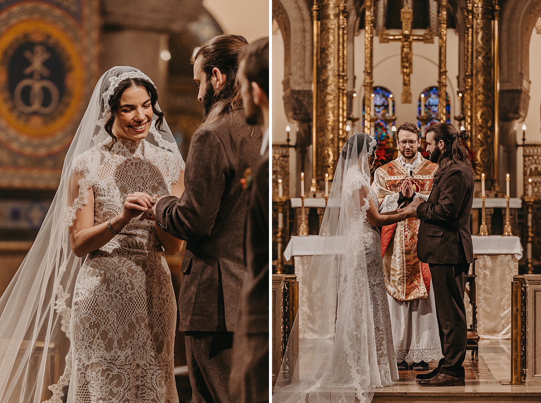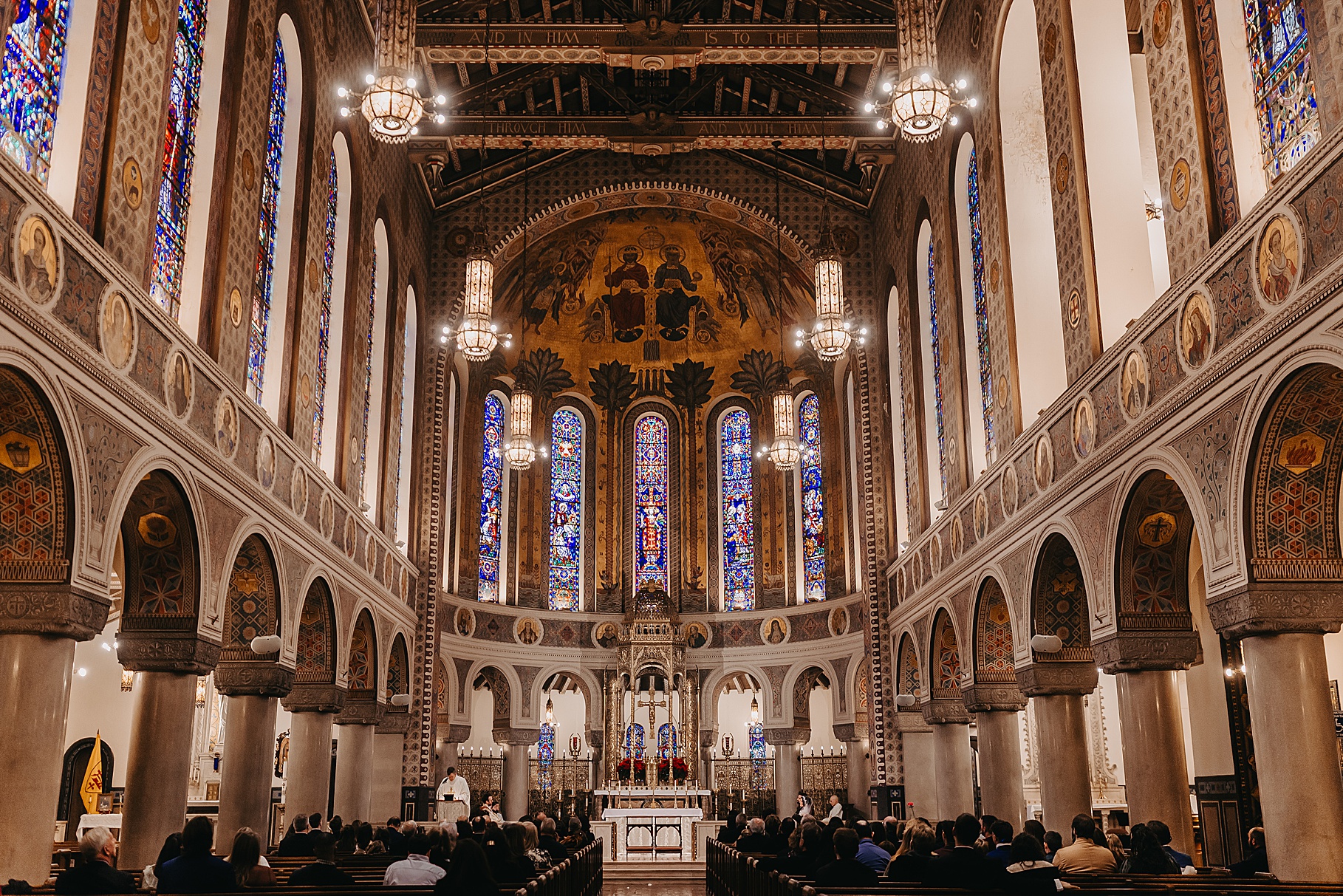 We started the day at a hotel in Kentucky, just across the river from Cincinnati, where both Maria & Benj were getting ready. From there, we headed to their church, the gorgeous St. Monica–St. George Catholic Church, which features stunning stained glass and intricate details everywhere you look. Maria and Benj chose to do a first look (Maria said it was this blogpost that helped them decide!), and the frigid temperatures led us to do it inside the church—which I honestly loved. We were able to take a few quiet moments after their first look for portraits inside the church before too many people arrived, and those are some of my favorites from the entire day.