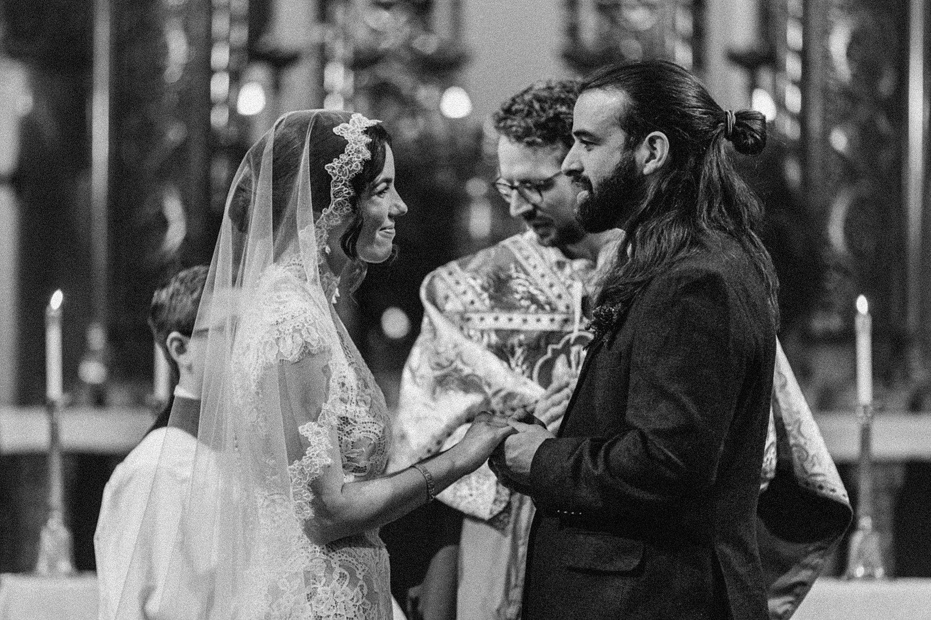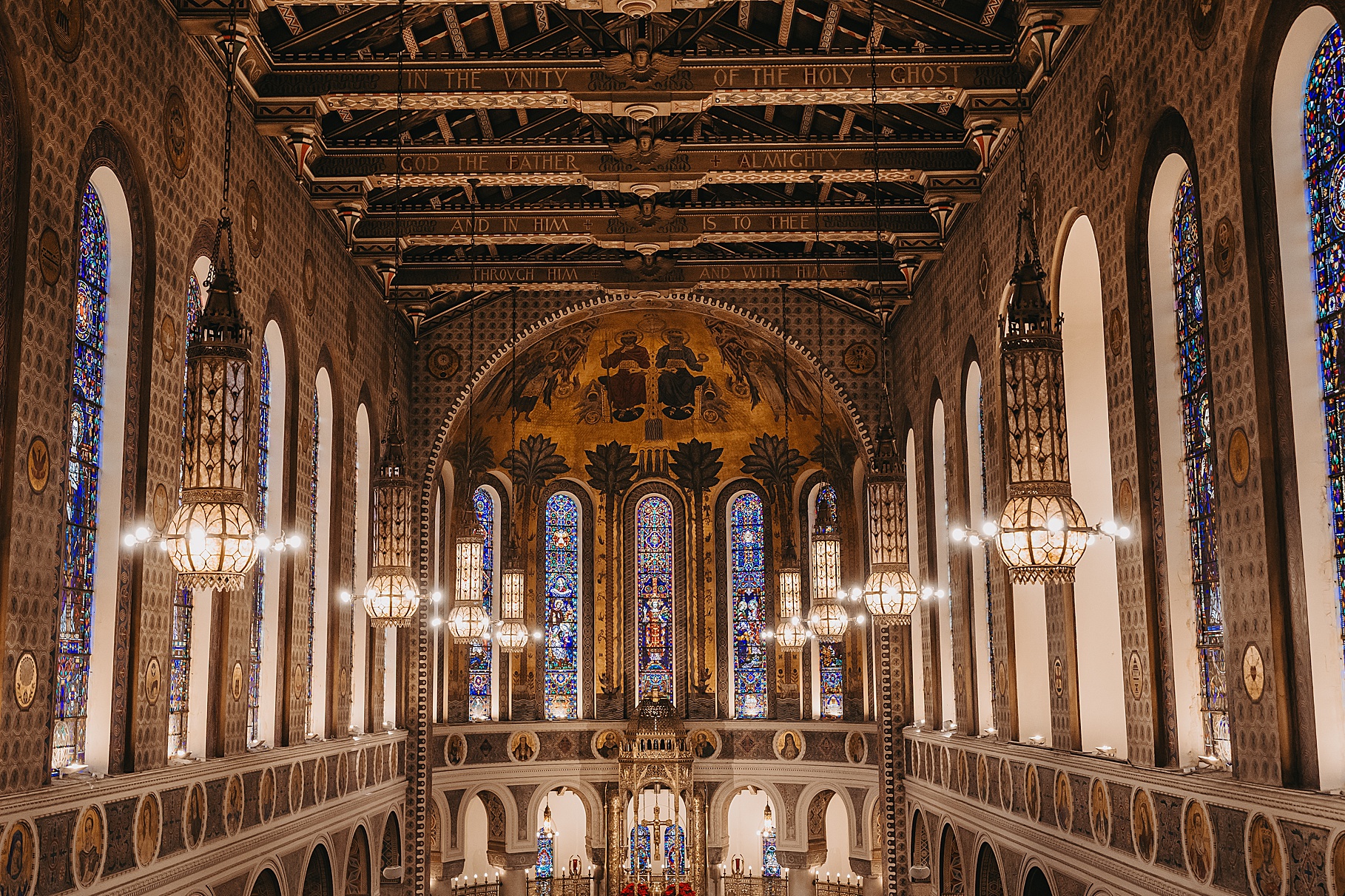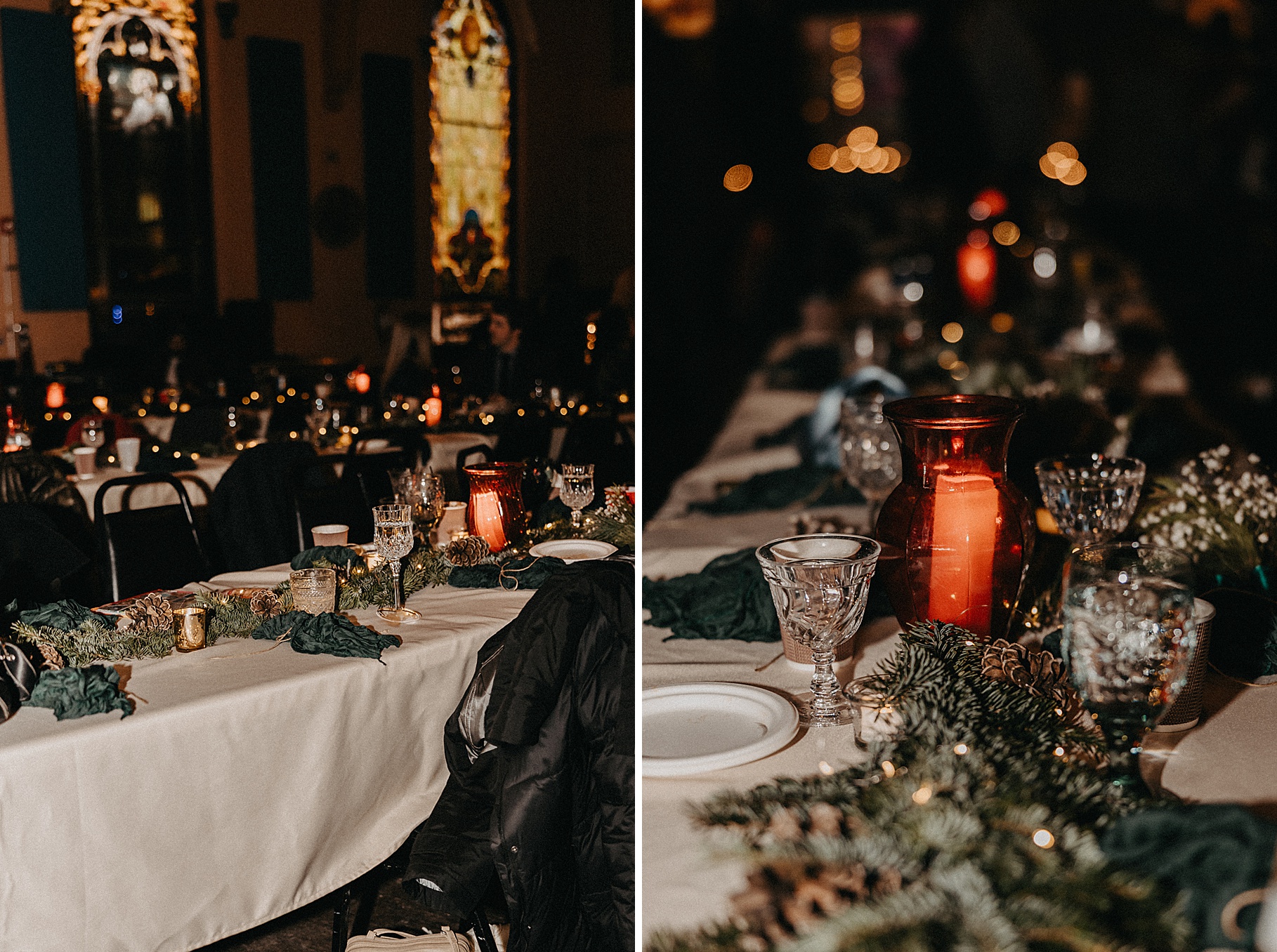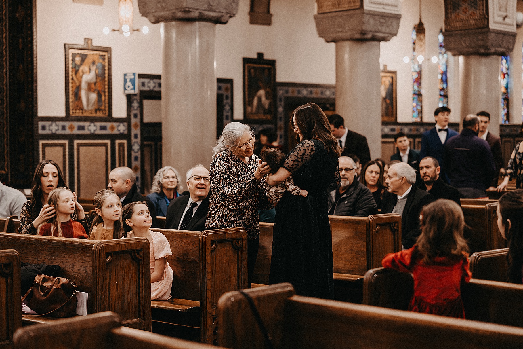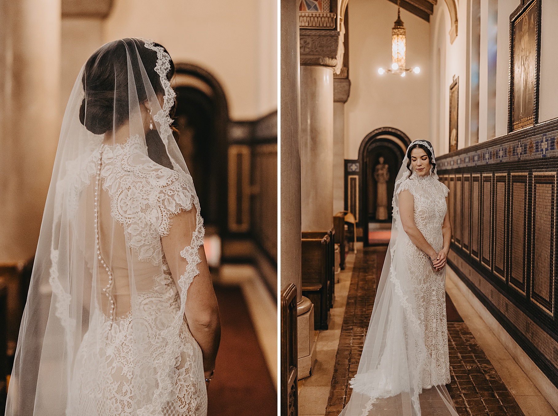 We started the day at a hotel in Kentucky, just across the river from Cincinnati, where both Maria & Benj were getting ready. From there, we headed to their church, the gorgeous St. Monica–St. George Catholic Church, which features stunning stained glass and intricate details everywhere you look. Maria and Benj chose to do a first look (Maria said it was this blogpost that helped them decide!), and the frigid temperatures led us to do it inside the church—which I honestly loved. We were able to take a few quiet moments after their first look for portraits inside the church before too many people arrived, and those are some of my favorites from the entire day.