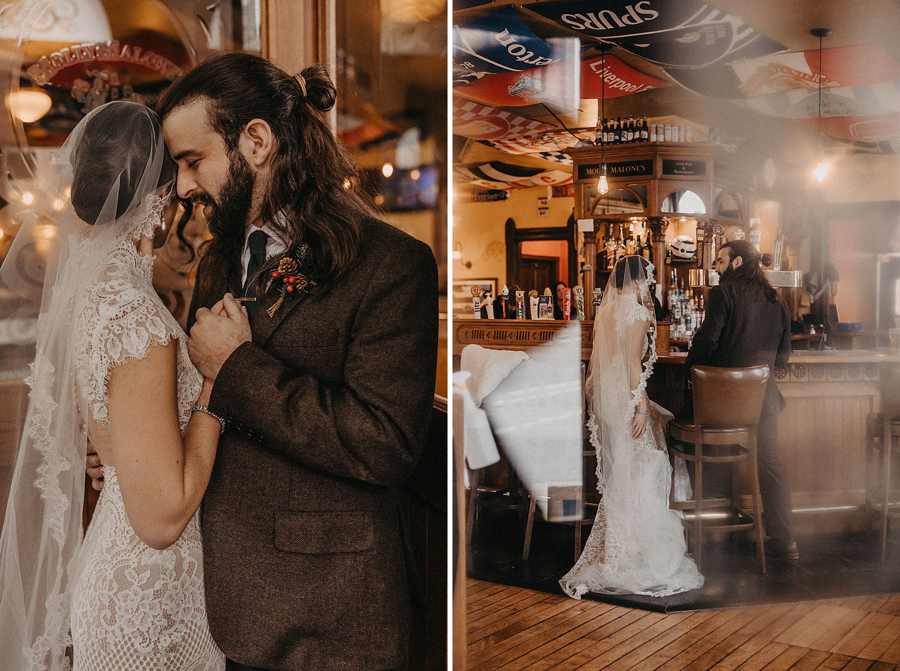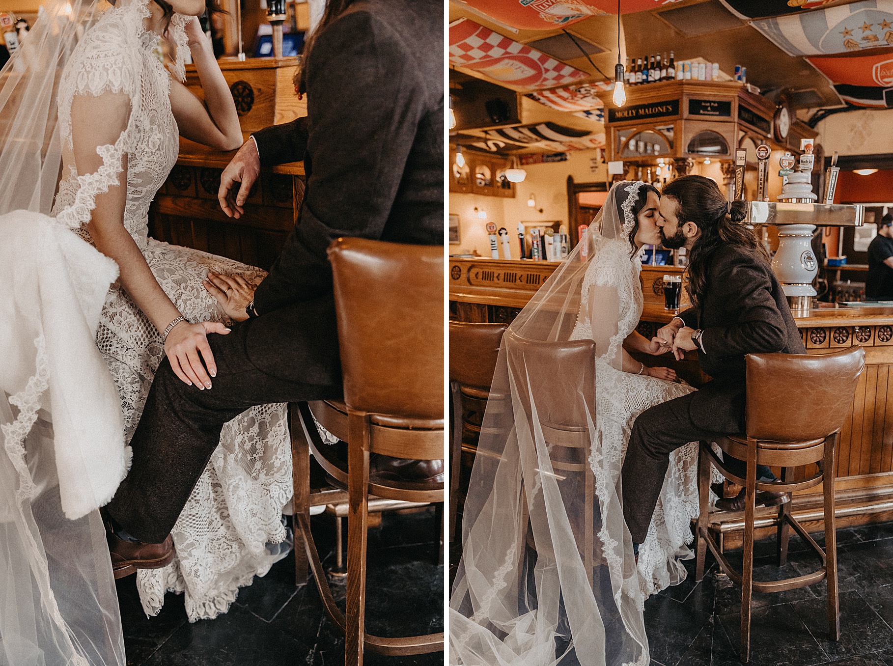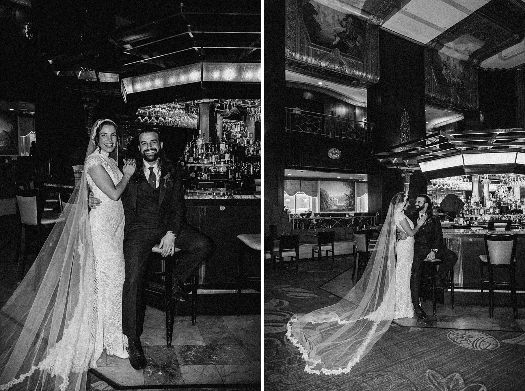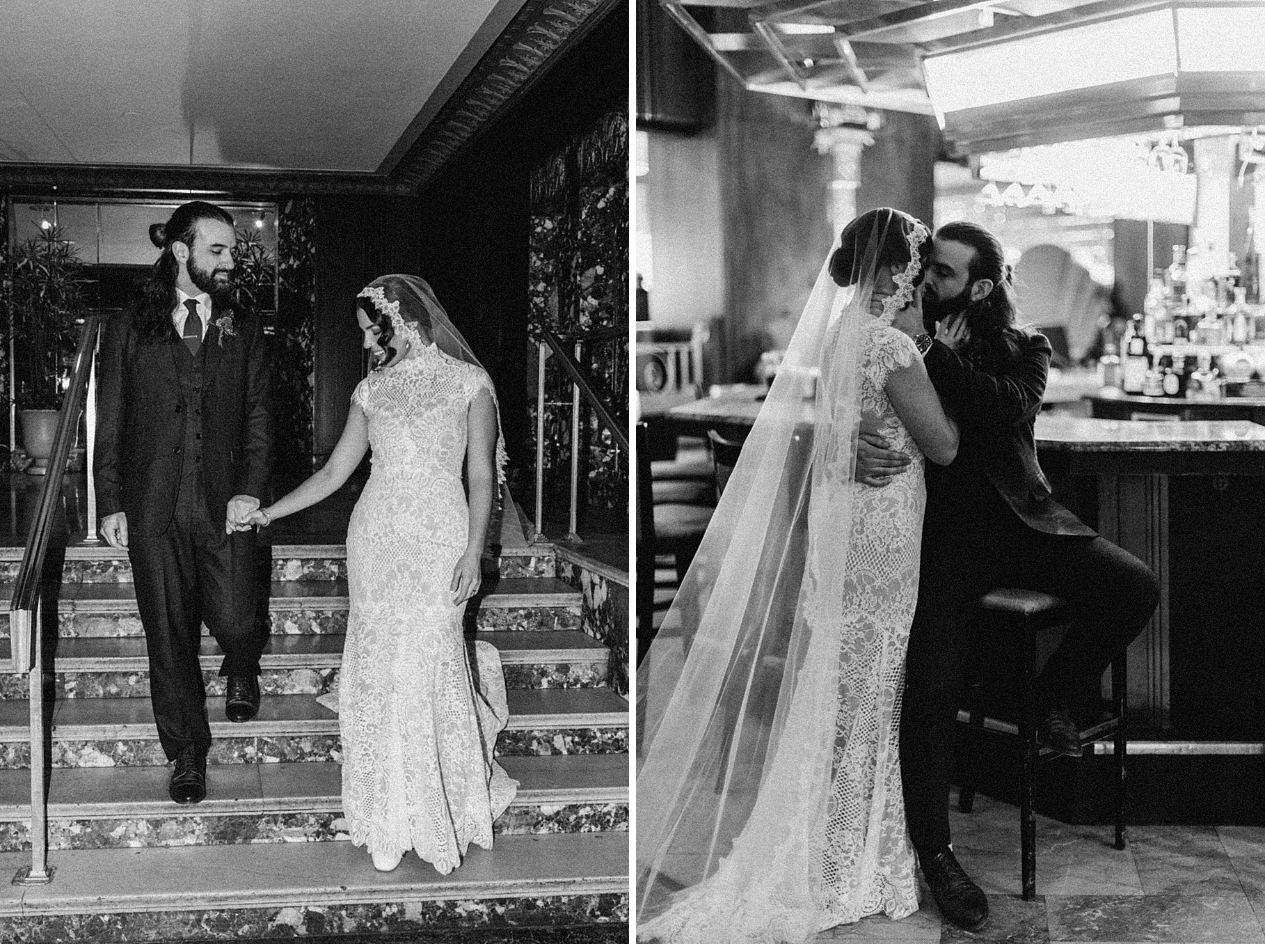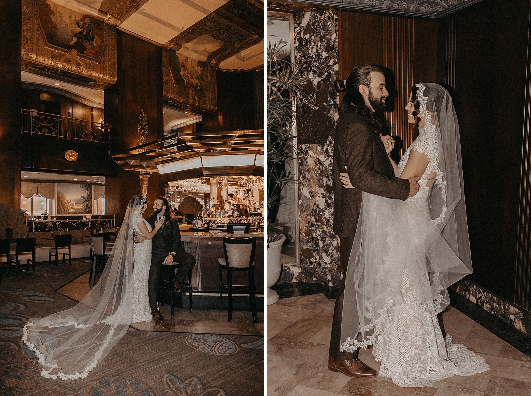 After their beautiful Nuptial Mass, we headed to two unique spots for Maria & Benj’s portraits. With wind chills bringing temperatures close to zero, we needed indoor locations, and the lobby of the Hilton Netherland Plaza Hotel and an Irish pub (Molly Malone’s) provided the perfect settings.