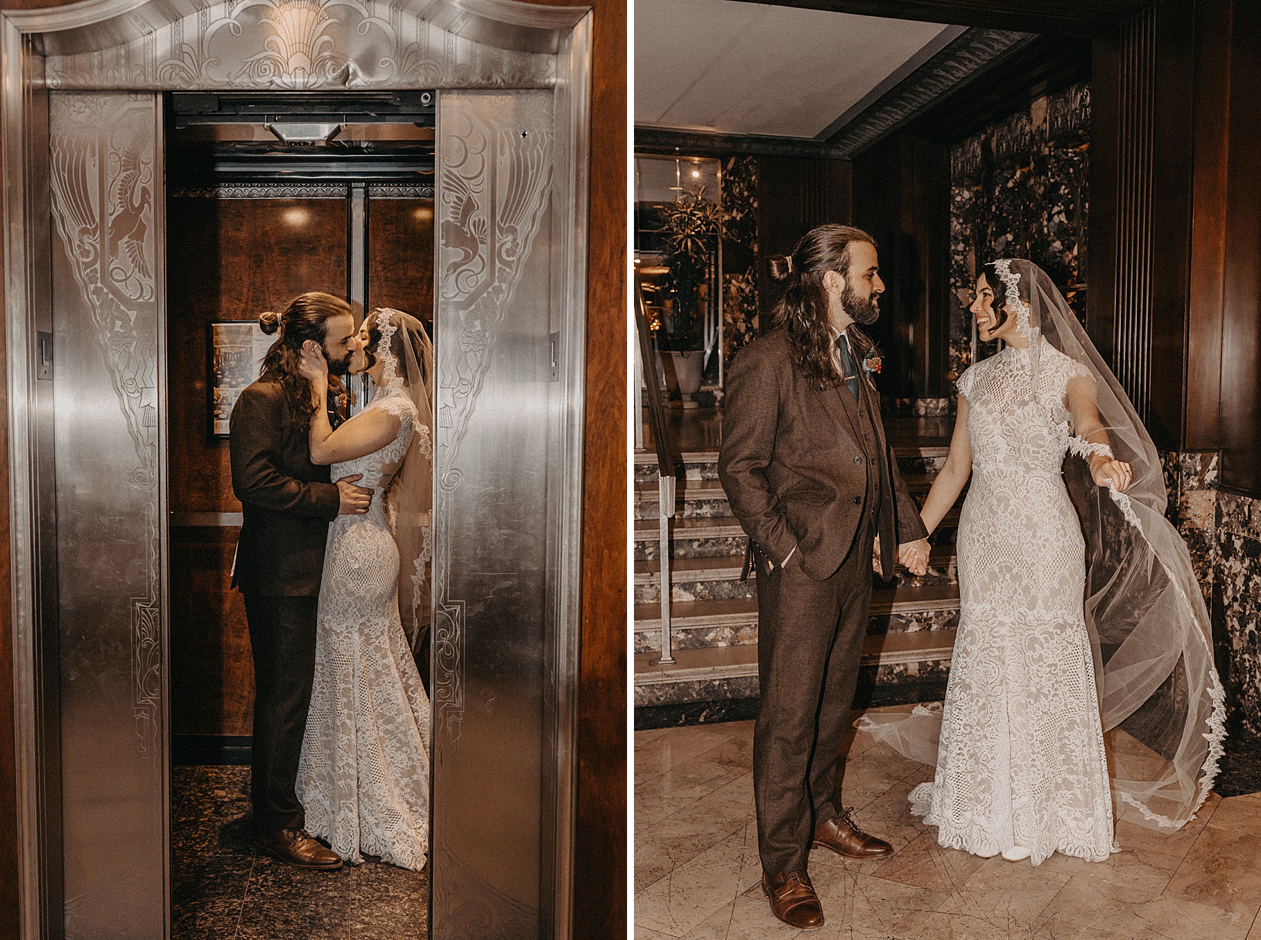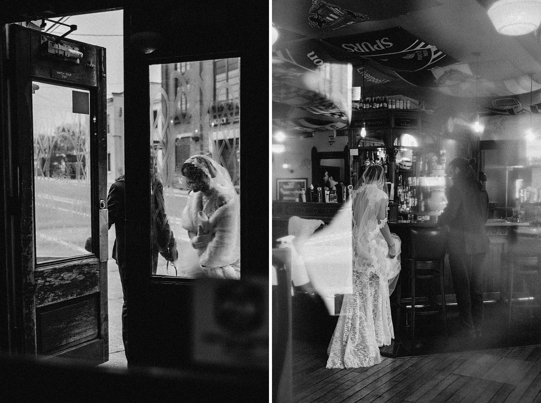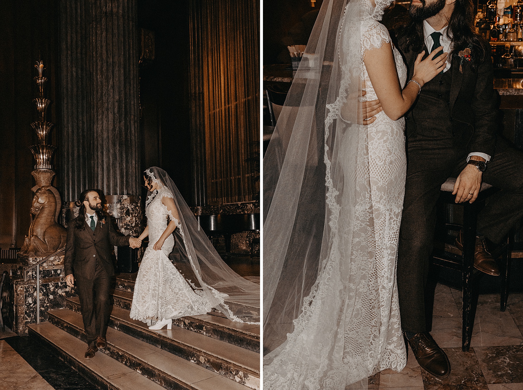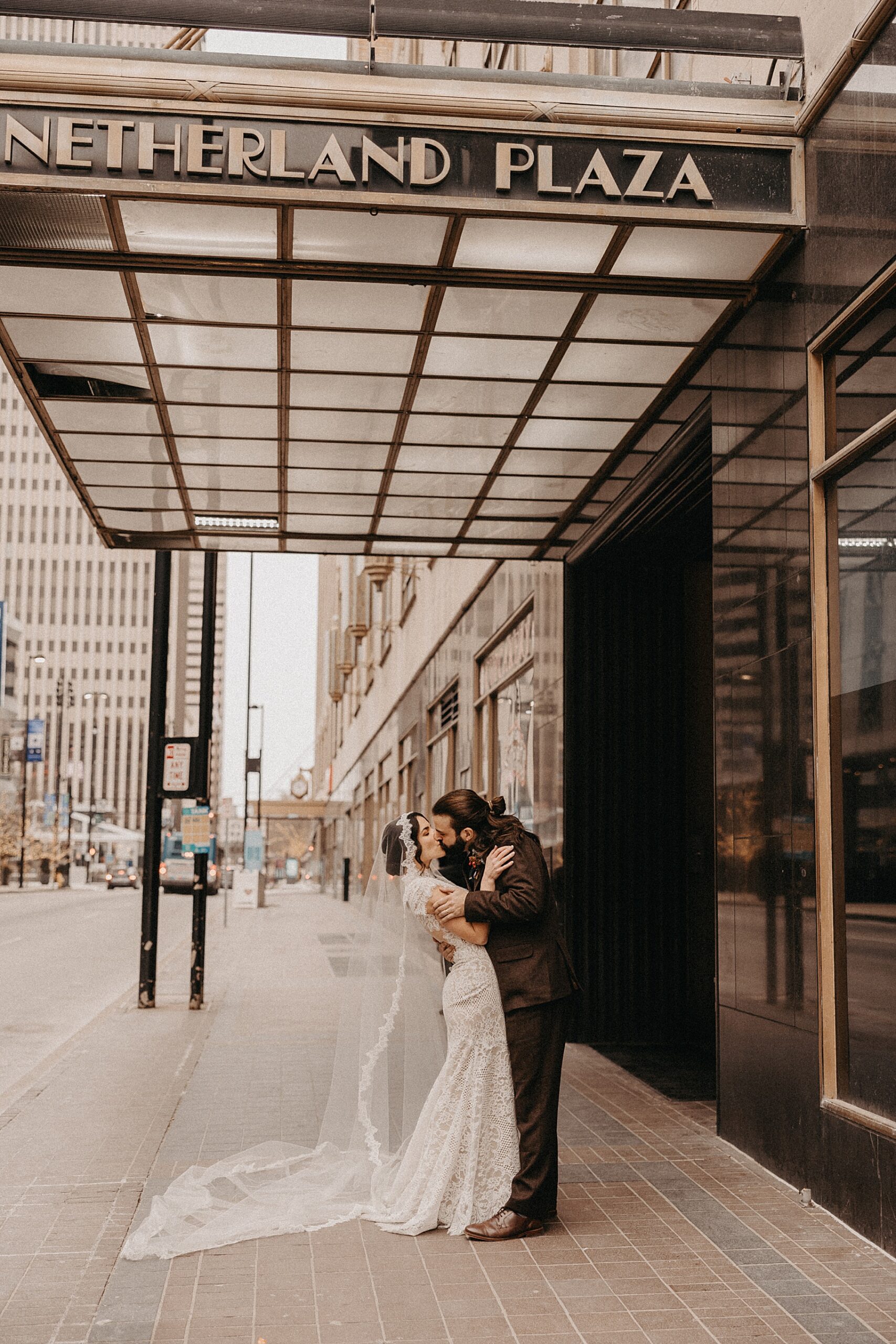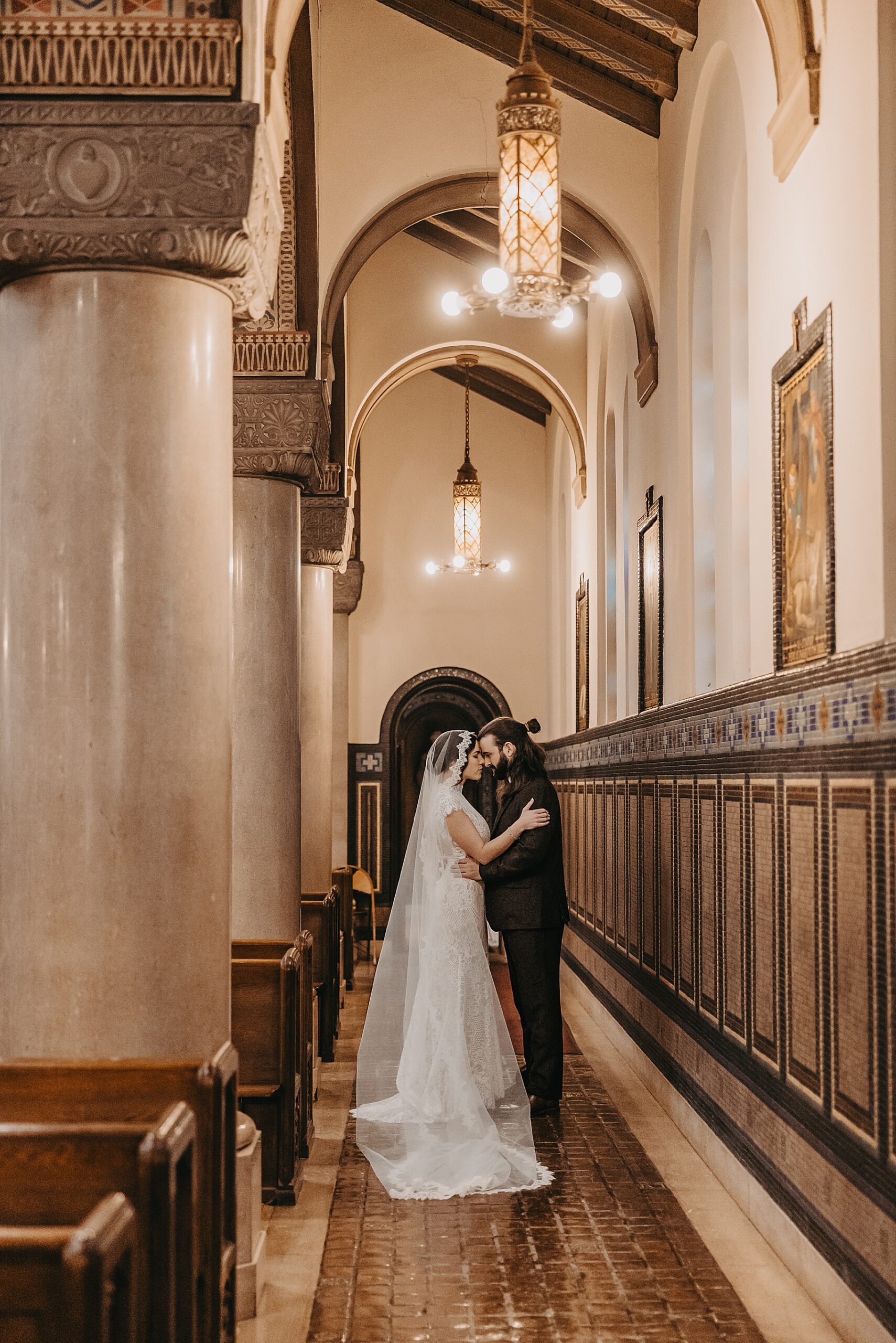 After their beautiful Nuptial Mass, we headed to two unique spots for Maria & Benj’s portraits. With wind chills bringing temperatures close to zero, we needed indoor locations, and the lobby of the Hilton Netherland Plaza Hotel and an Irish pub (Molly Malone’s) provided the perfect settings.