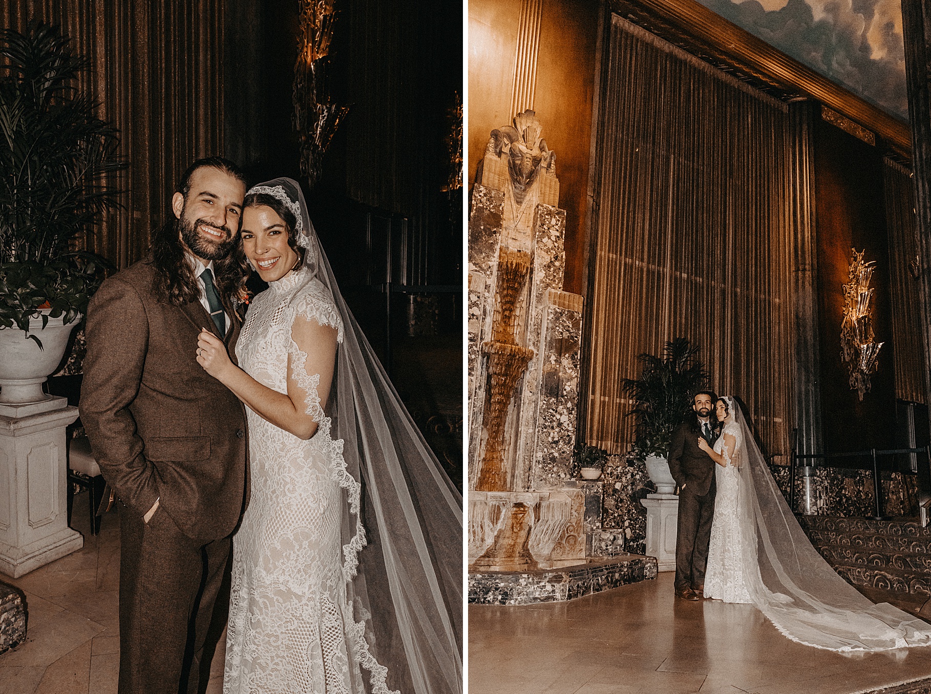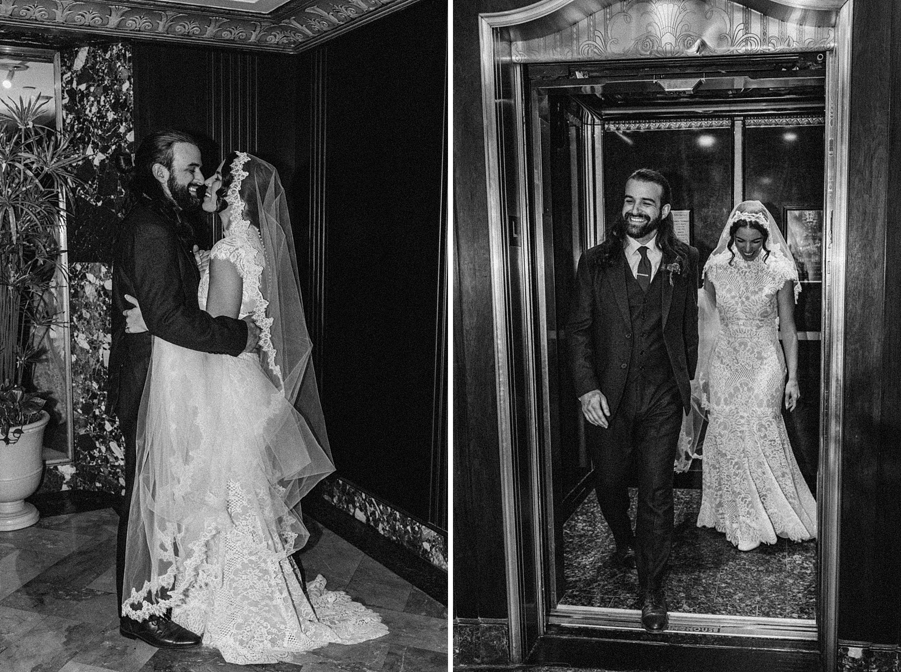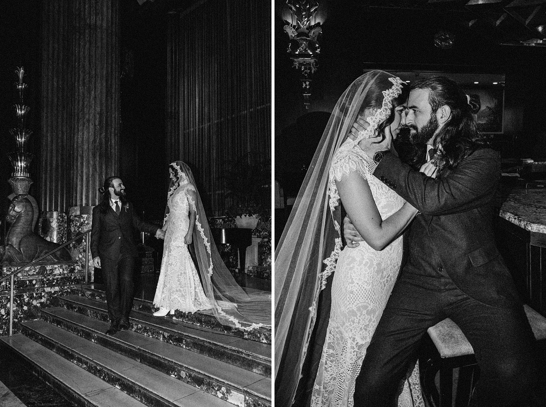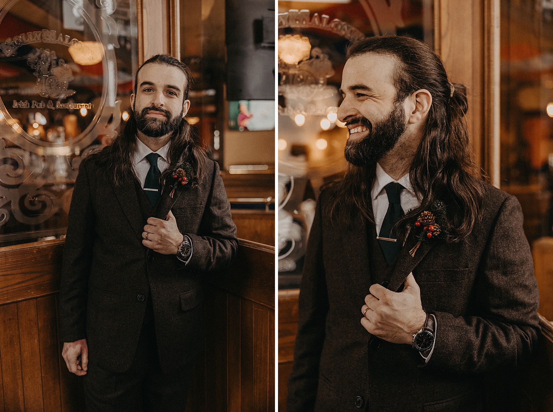 After their beautiful Nuptial Mass, we headed to two unique spots for Maria & Benj’s portraits. With wind chills bringing temperatures close to zero, we needed indoor locations, and the lobby of the Hilton Netherland Plaza Hotel and an Irish pub (Molly Malone’s) provided the perfect settings.