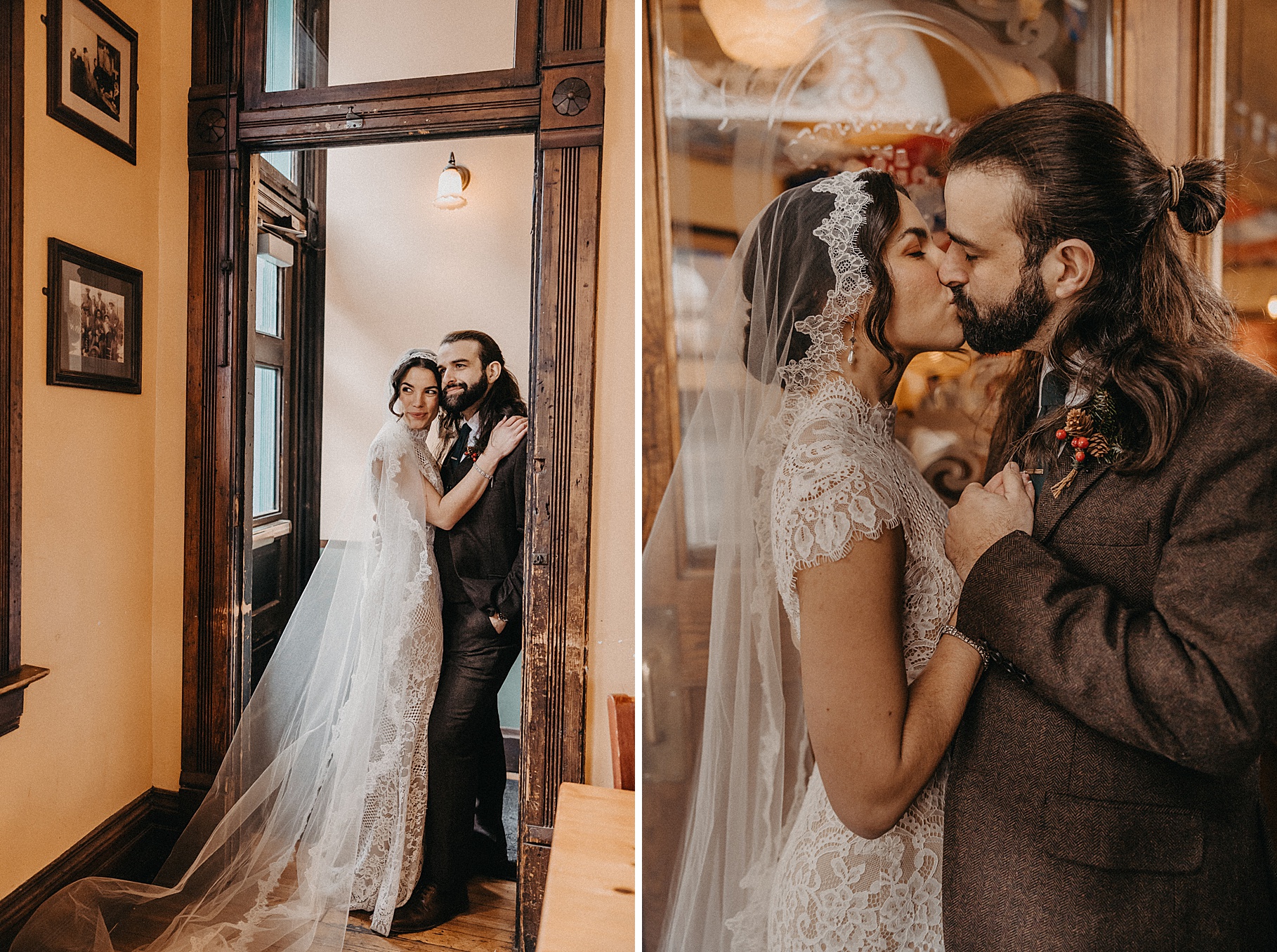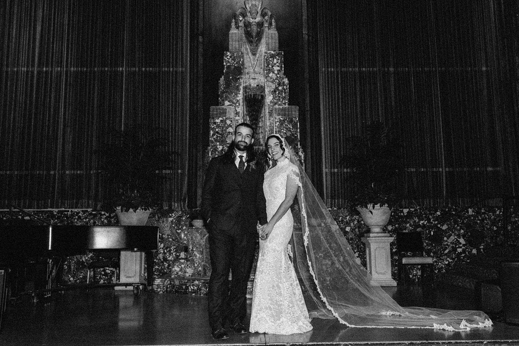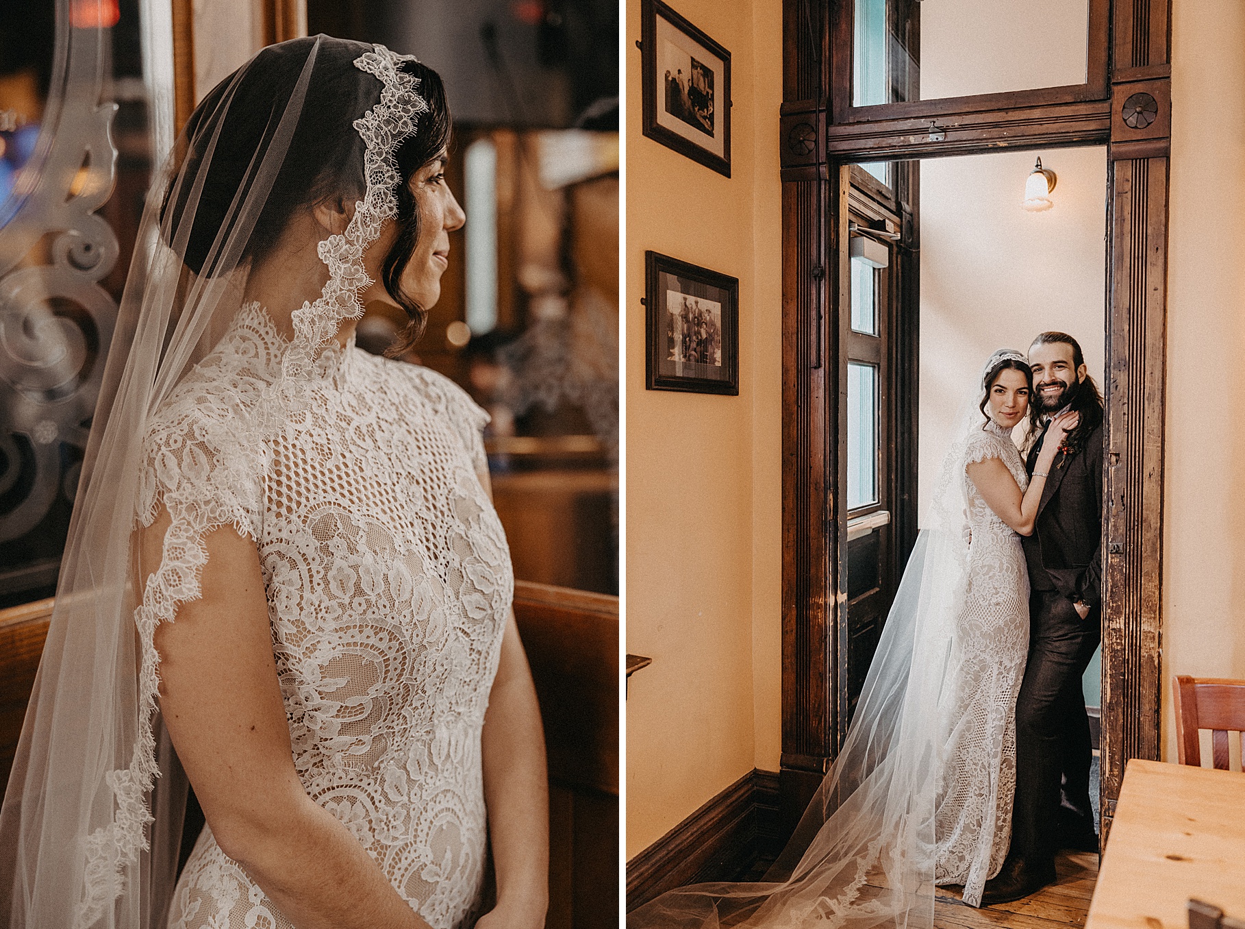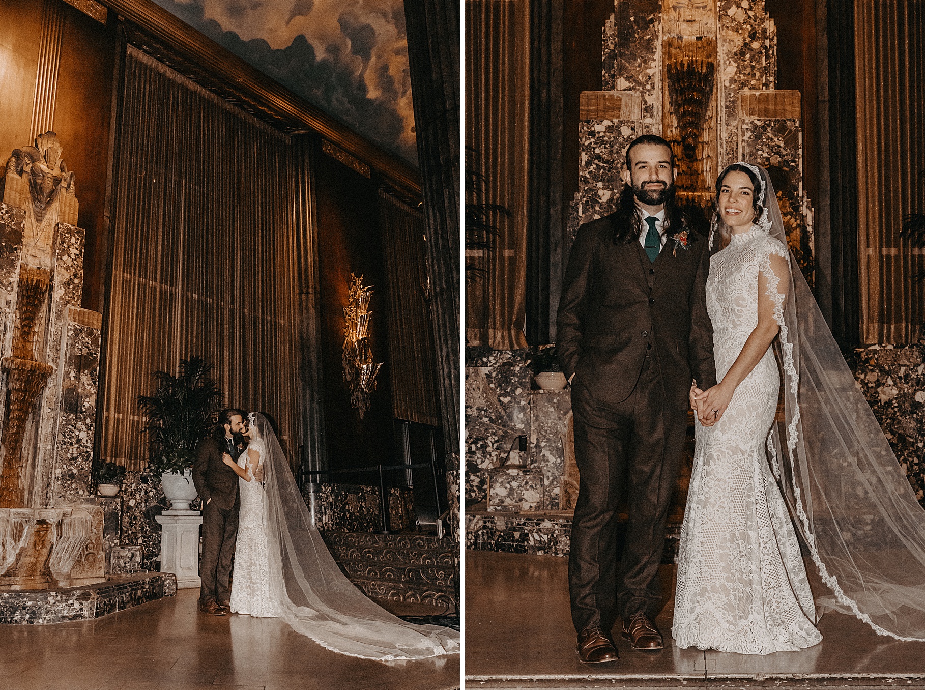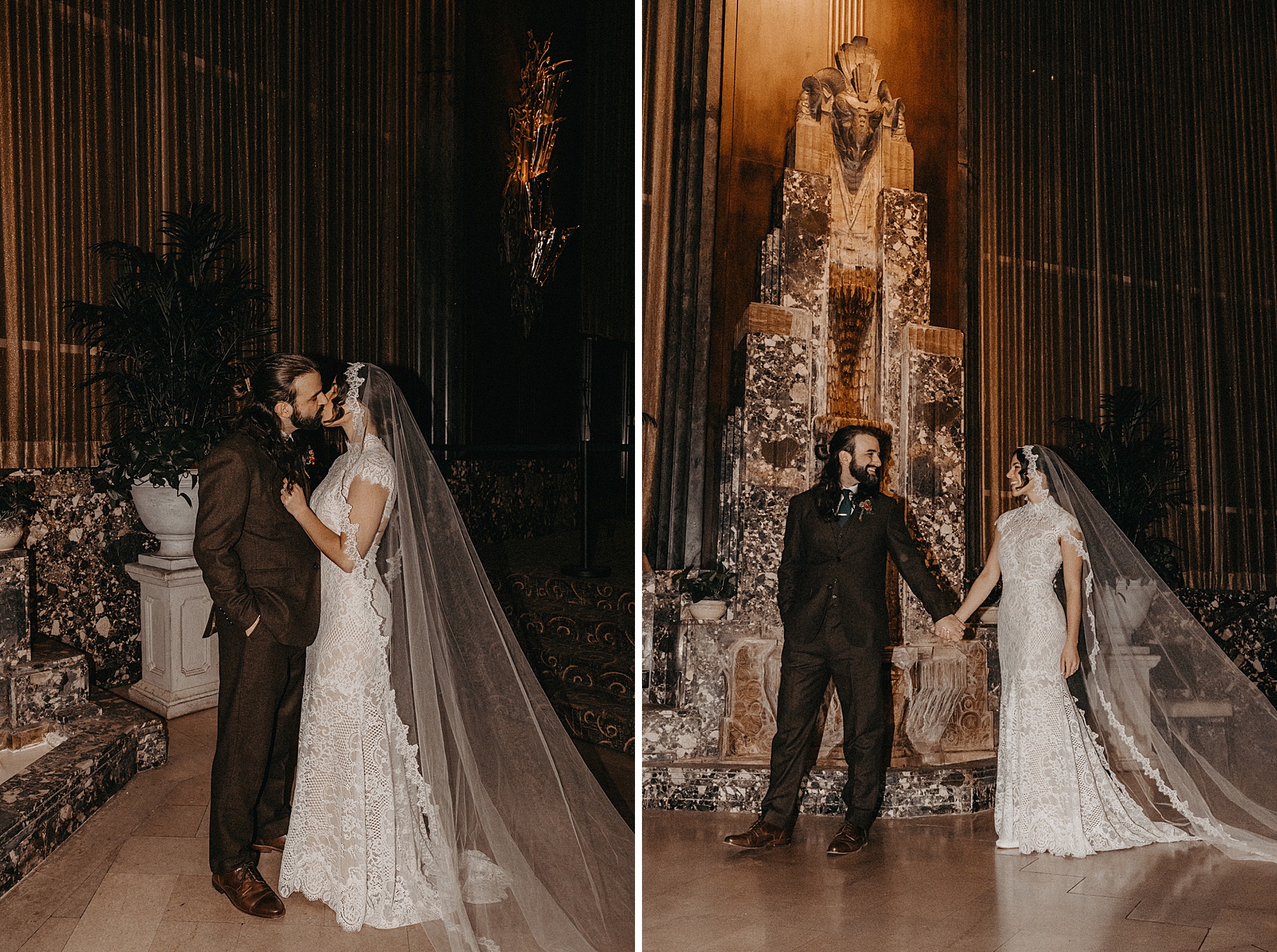 After their beautiful Nuptial Mass, we headed to two unique spots for Maria & Benj’s portraits. With wind chills bringing temperatures close to zero, we needed indoor locations, and the lobby of the Hilton Netherland Plaza Hotel and an Irish pub (Molly Malone’s) provided the perfect settings.