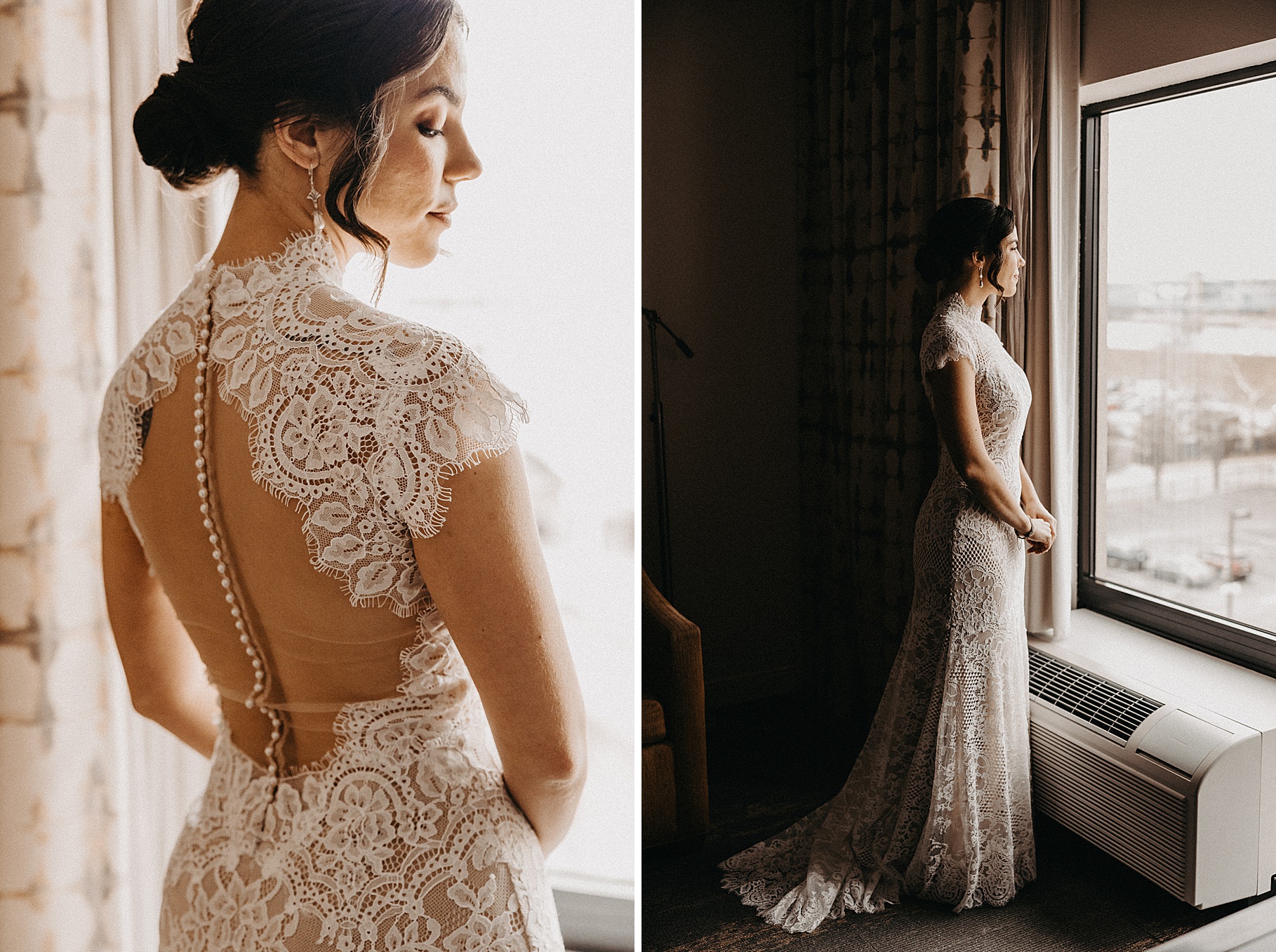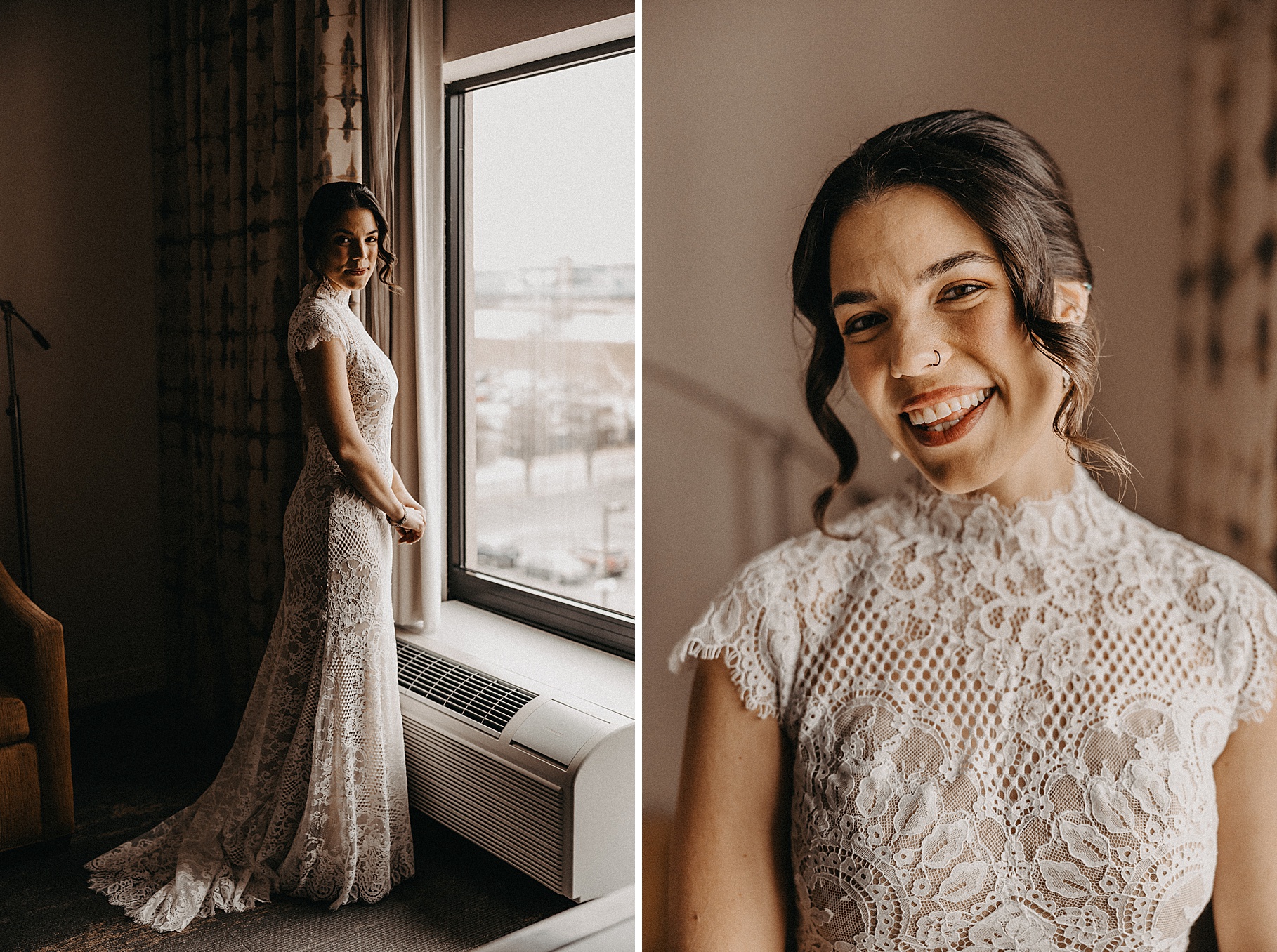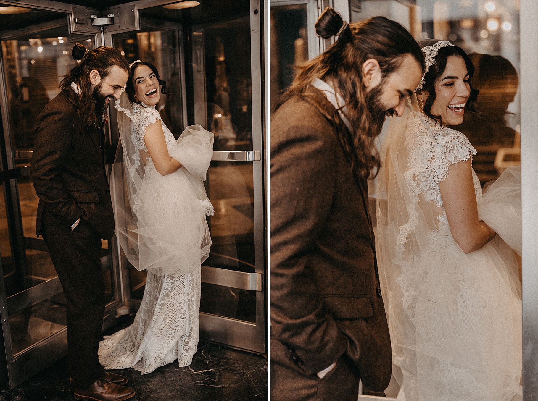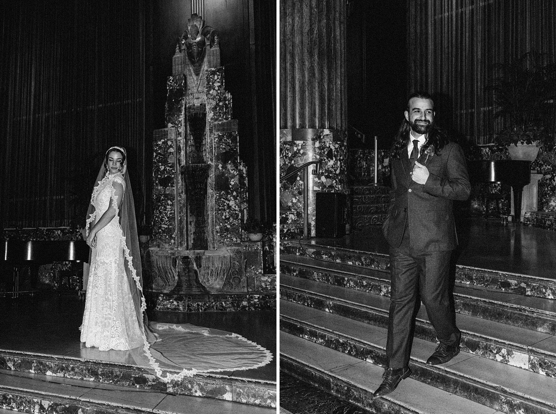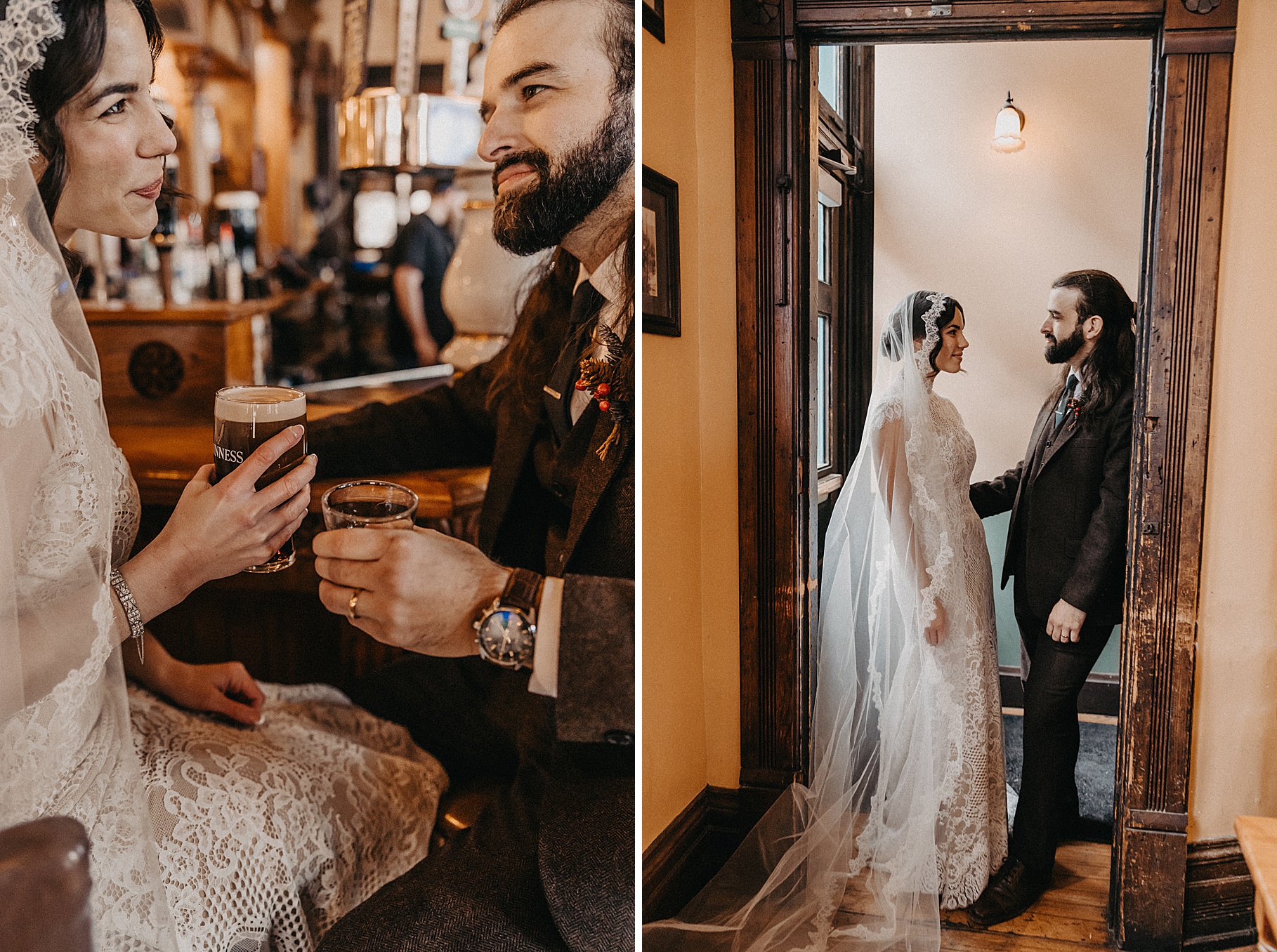 After their beautiful Nuptial Mass, we headed to two unique spots for Maria & Benj’s portraits. With wind chills bringing temperatures close to zero, we needed indoor locations, and the lobby of the Hilton Netherland Plaza Hotel and an Irish pub (Molly Malone’s) provided the perfect settings.