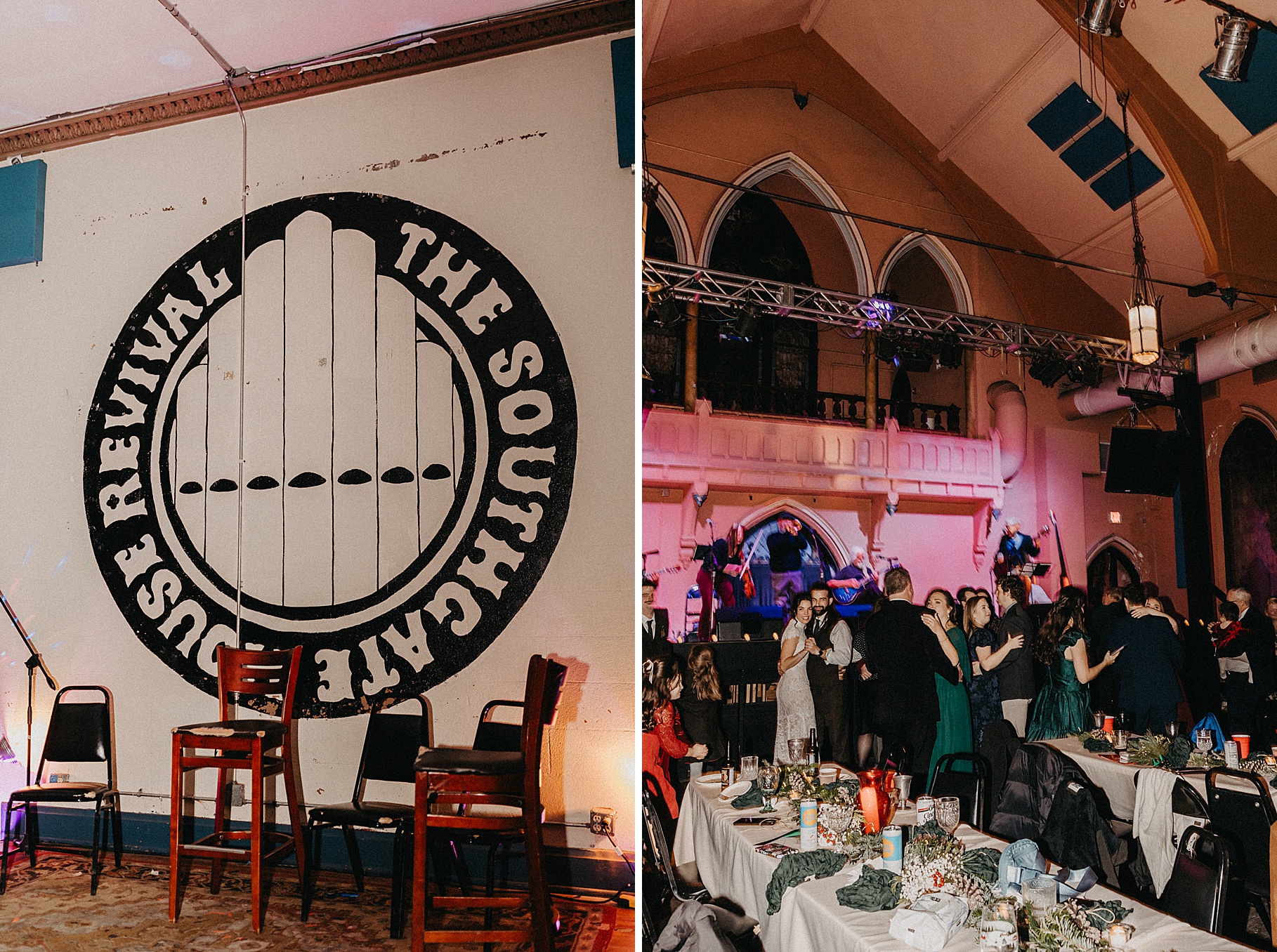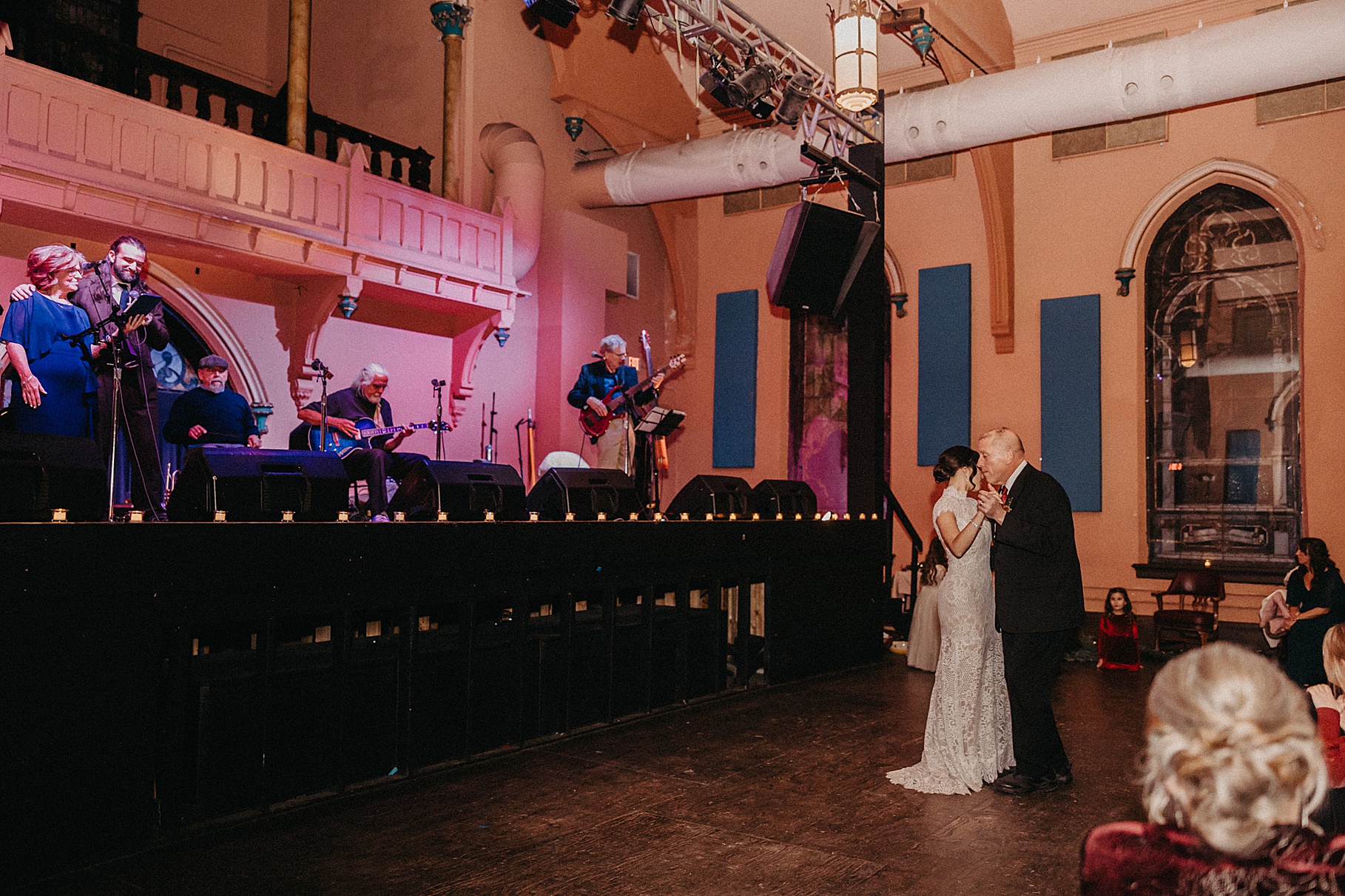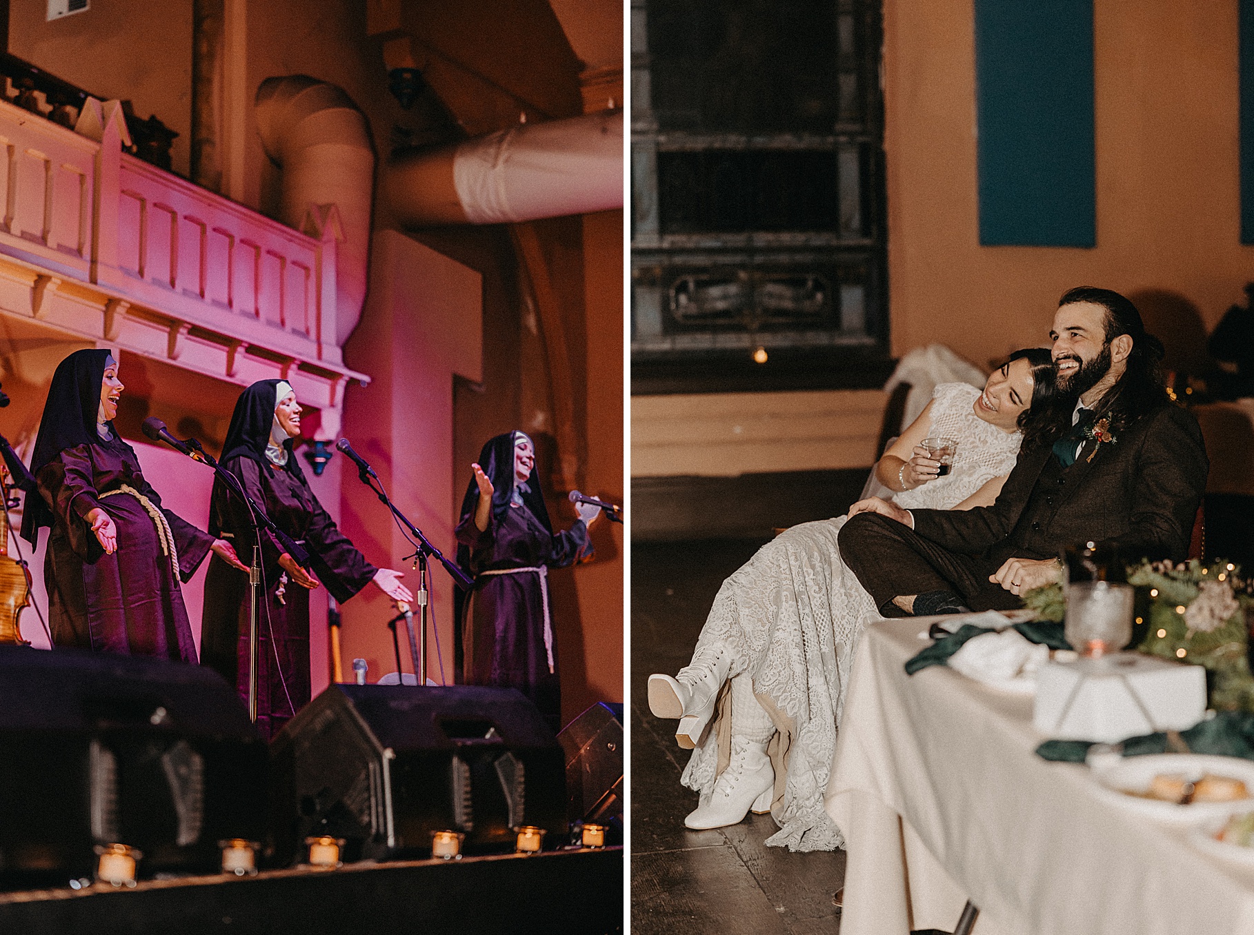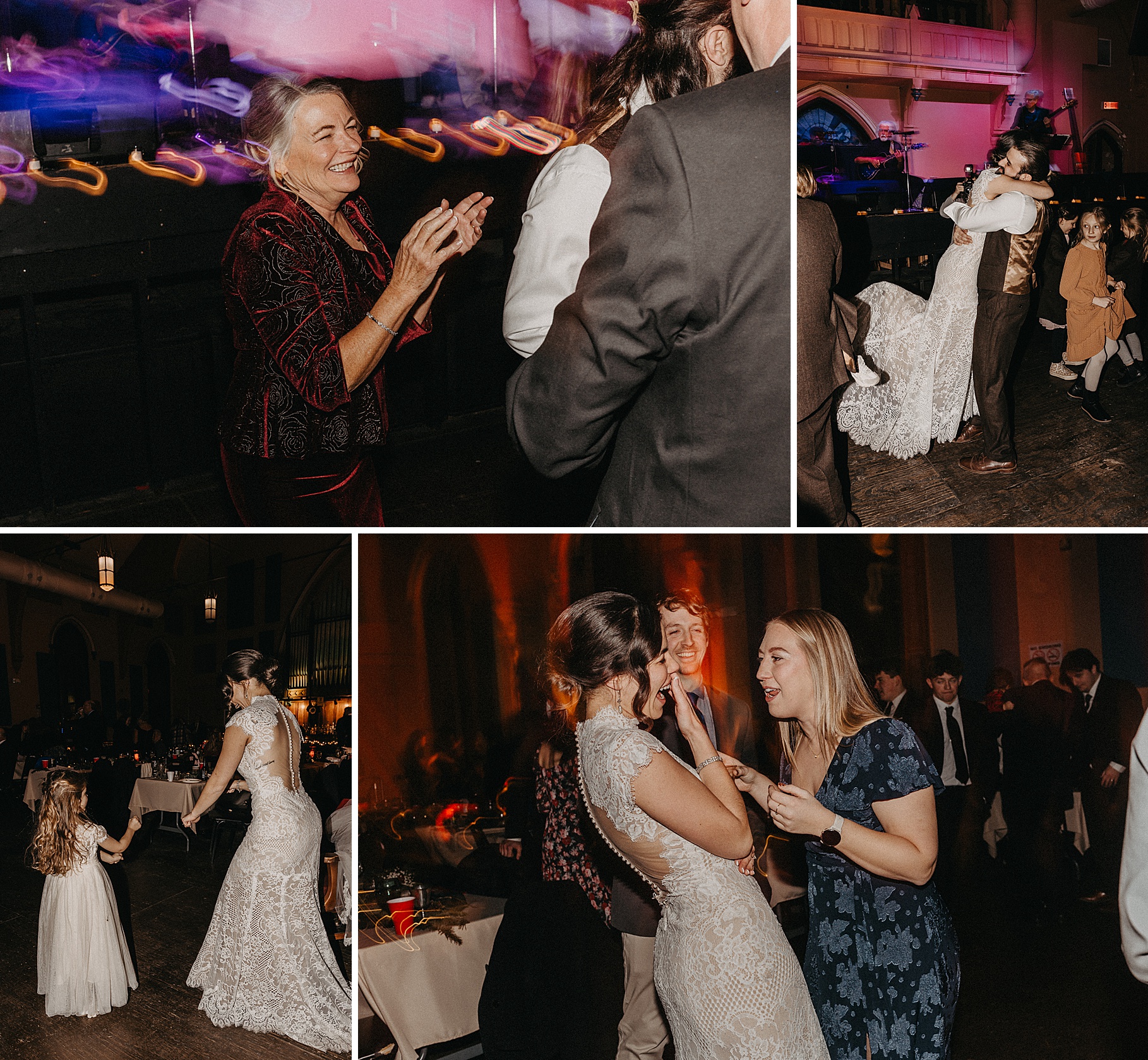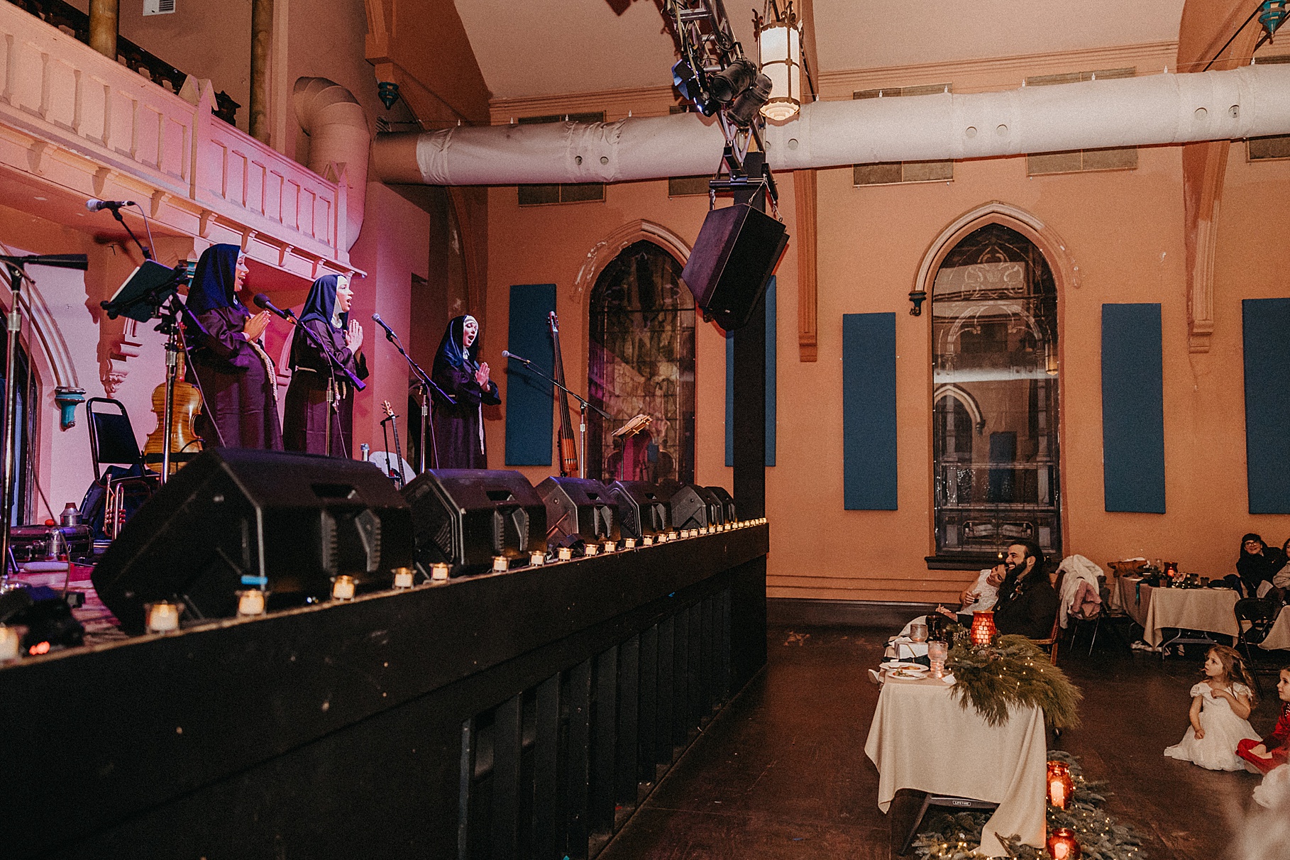 Once we finished portraits, we made our way to their reception at The Southgate Revival House. This venue is typically a live music space, which meant we had an incredible stage and lighting setup for their band, The Burning Caravan, who absolutely crushed it all evening. A few other highlights from the reception: Benj and his mom opted not to dance and instead sang a song for Maria and her dad’s dance (how special is that?). Another favorite moment was when Maria’s three sisters came out dressed as the nuns from The Sound of Music and performed a personalized version of “Maria,” describing their sister instead of giving traditional toasts. Maria and Benj also have a lot of nieces and nephews, which meant so many kiddos having the time of their lives—running around, dancing, eating pie (they had a pie bar instead of cake!), and drinking hot cocoa.