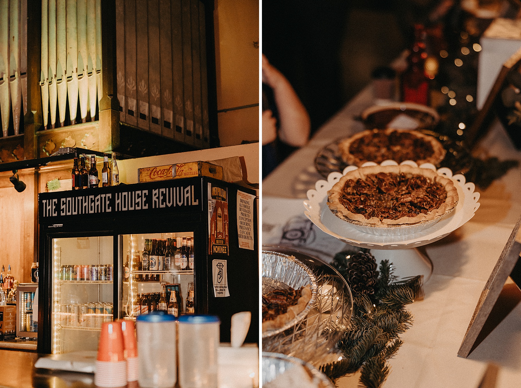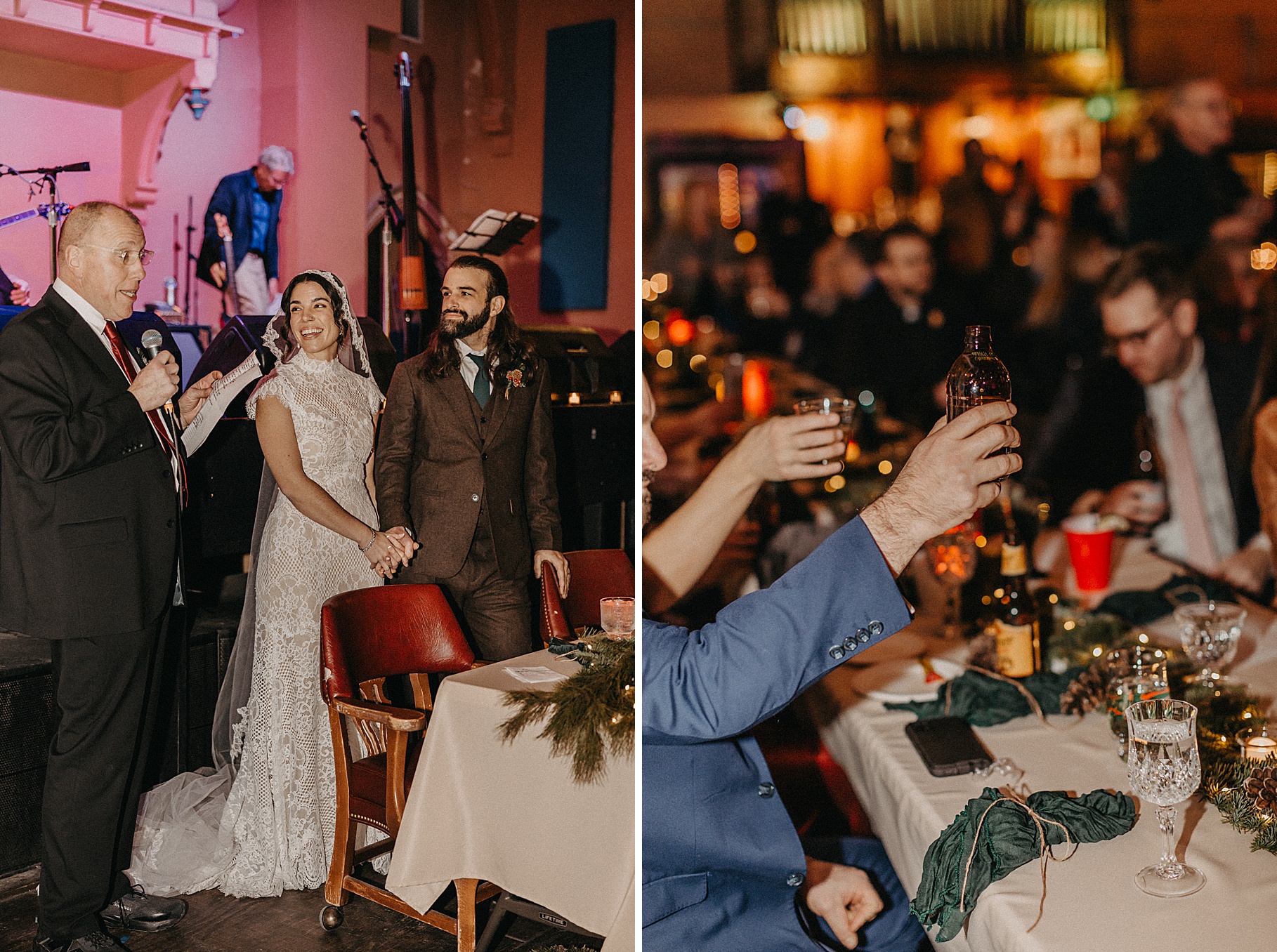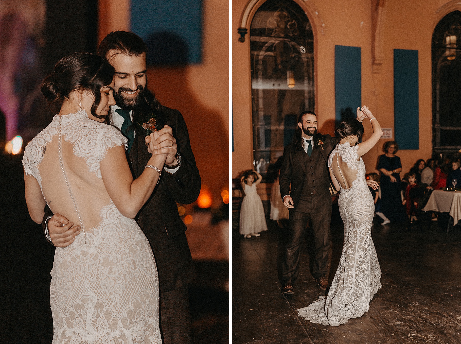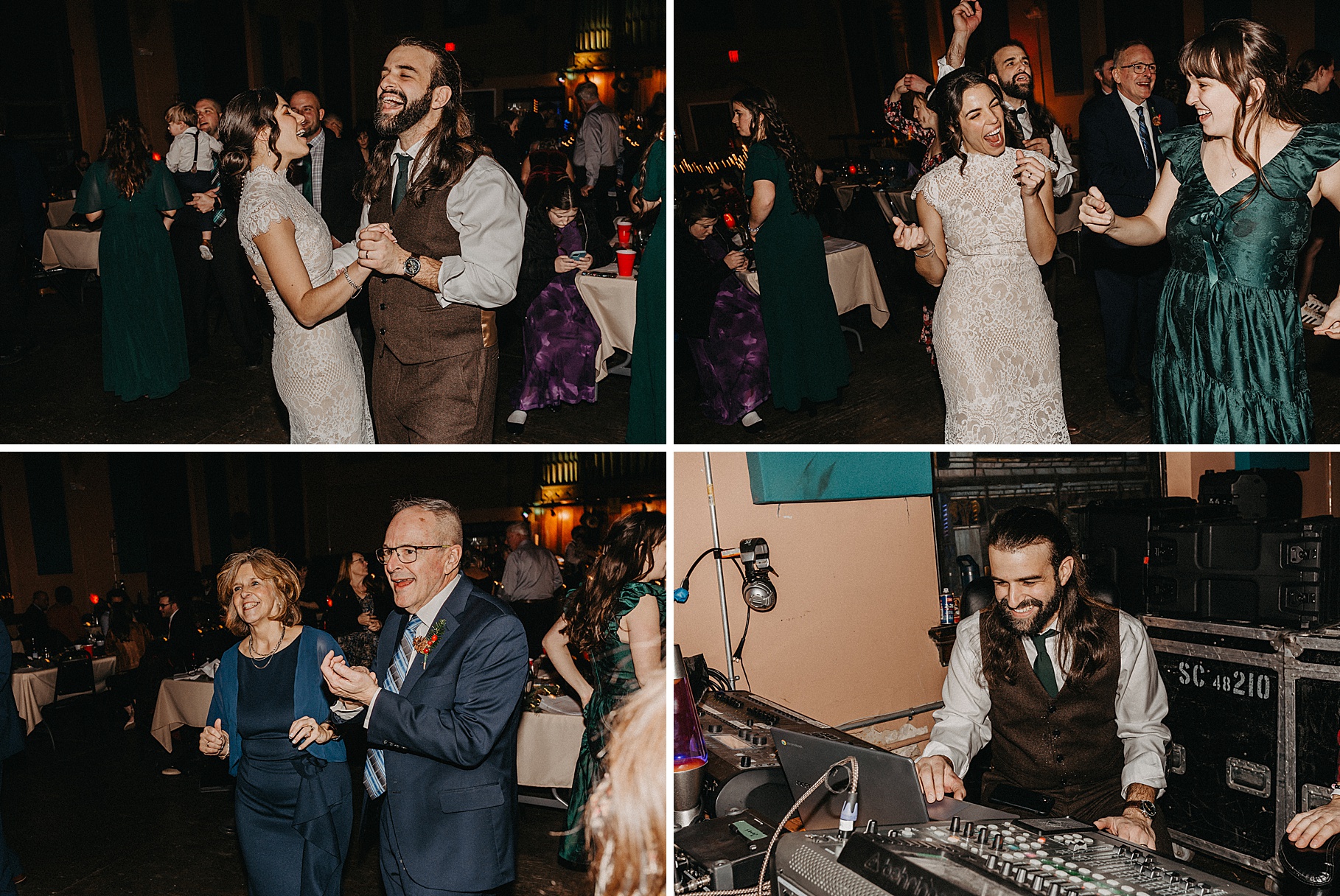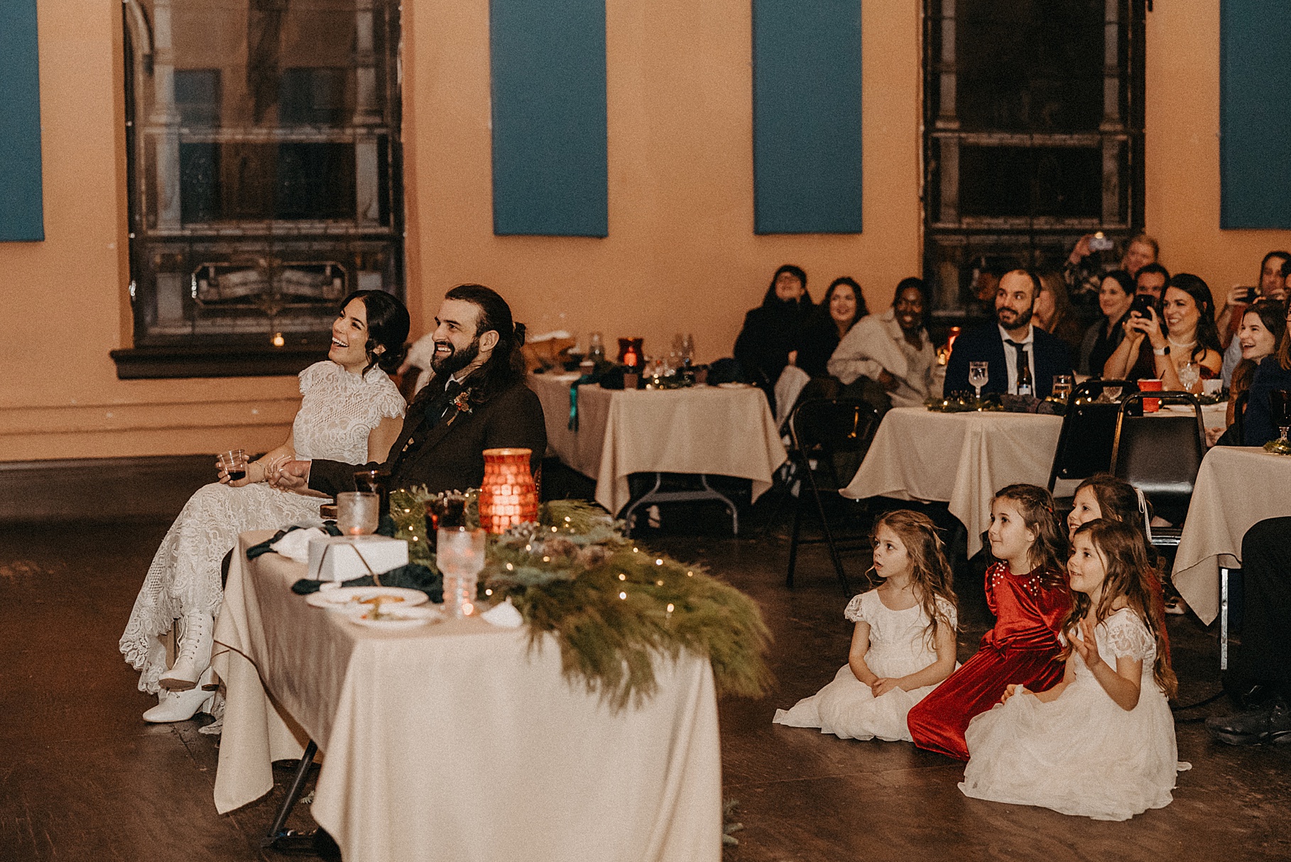 Once we finished portraits, we made our way to their reception at The Southgate Revival House. This venue is typically a live music space, which meant we had an incredible stage and lighting setup for their band, The Burning Caravan, who absolutely crushed it all evening. A few other highlights from the reception: Benj and his mom opted not to dance and instead sang a song for Maria and her dad’s dance (how special is that?). Another favorite moment was when Maria’s three sisters came out dressed as the nuns from The Sound of Music and performed a personalized version of “Maria,” describing their sister instead of giving traditional toasts. Maria and Benj also have a lot of nieces and nephews, which meant so many kiddos having the time of their lives—running around, dancing, eating pie (they had a pie bar instead of cake!), and drinking hot cocoa.