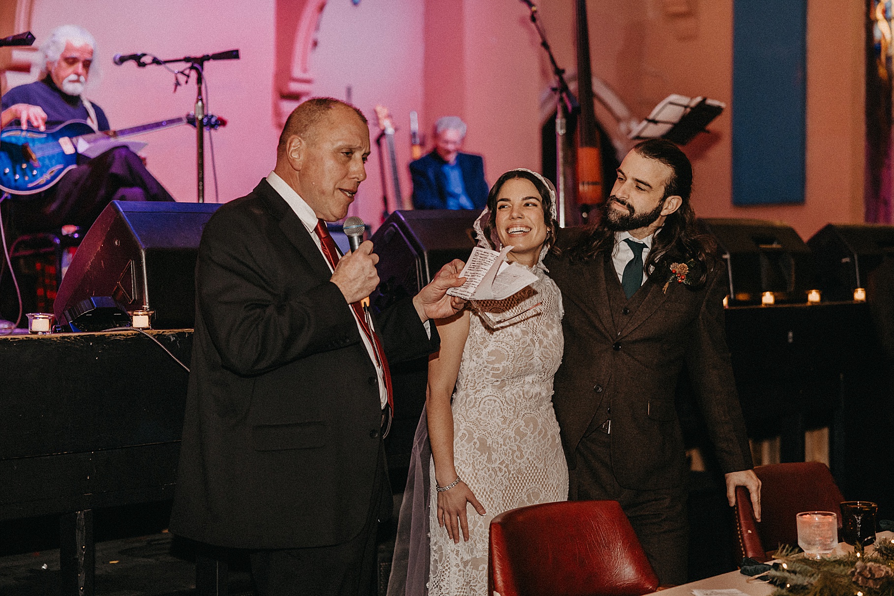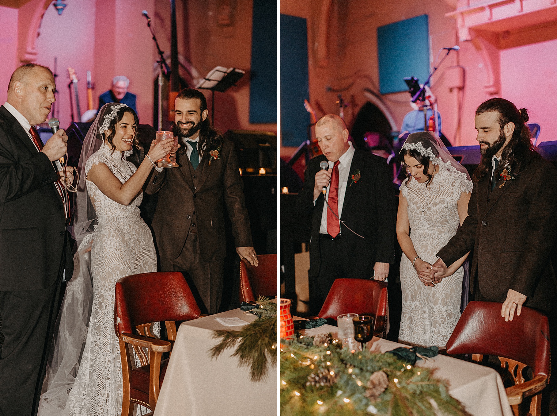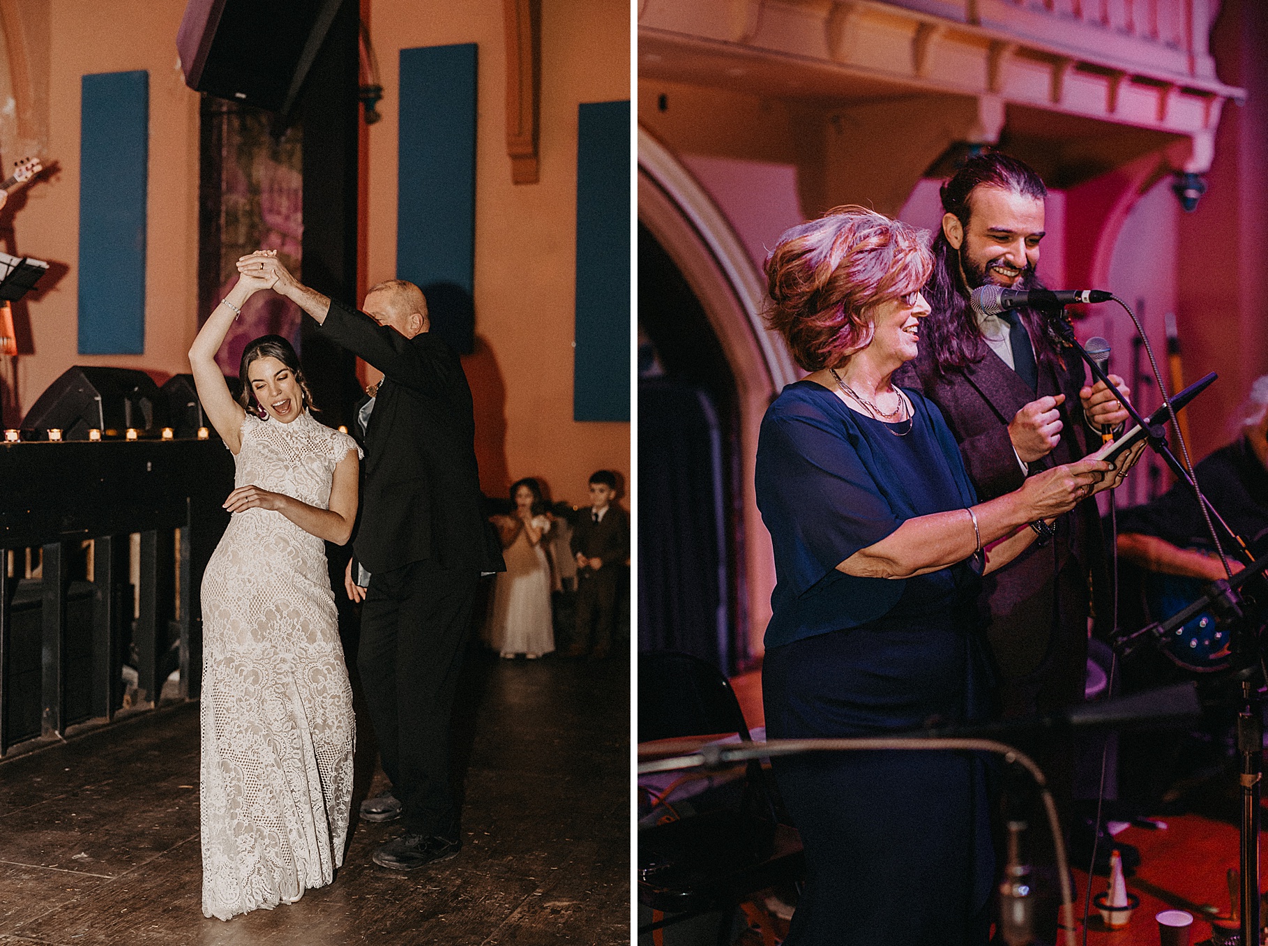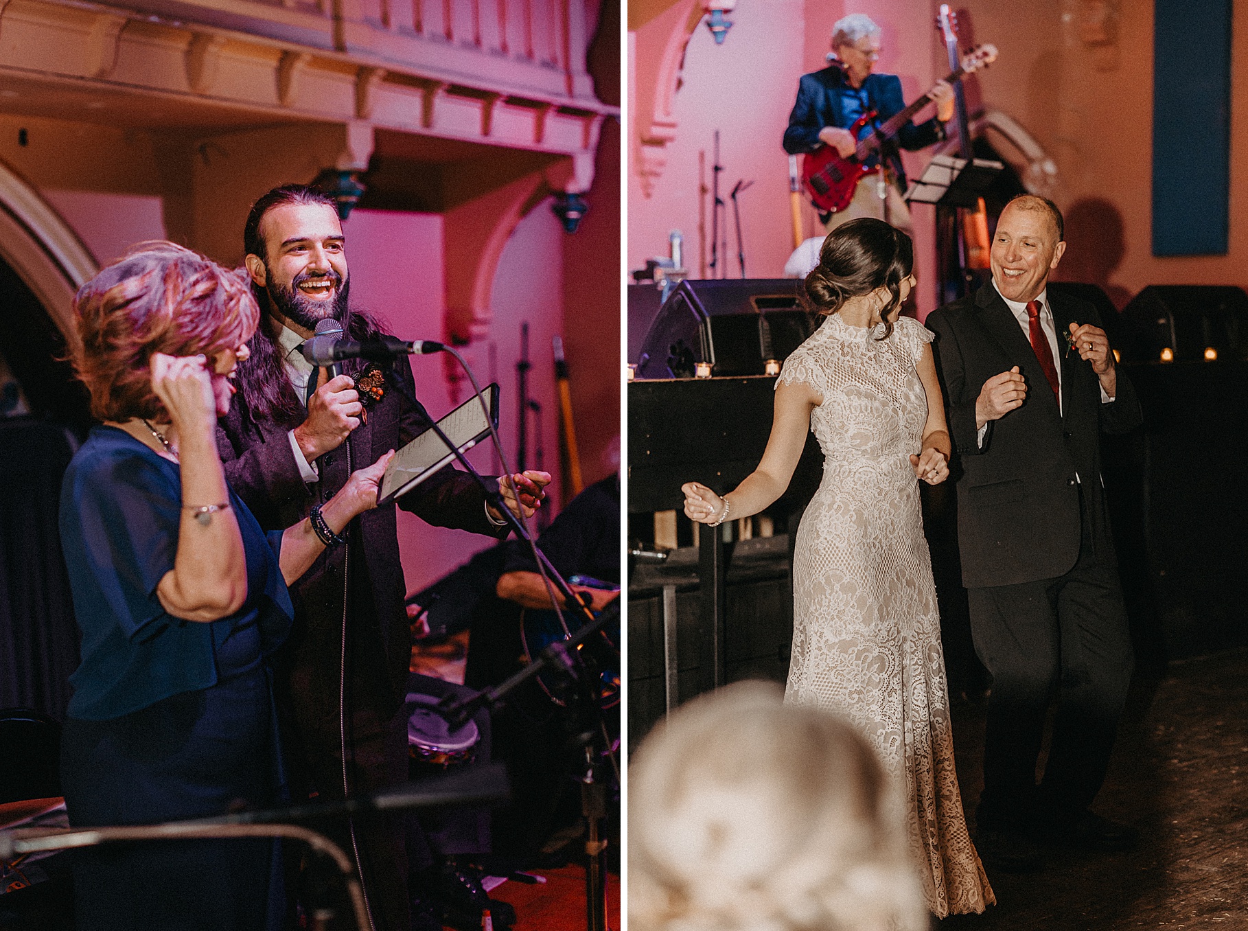 Once we finished portraits, we made our way to their reception at The Southgate Revival House. This venue is typically a live music space, which meant we had an incredible stage and lighting setup for their band, The Burning Caravan, who absolutely crushed it all evening. A few other highlights from the reception: Benj and his mom opted not to dance and instead sang a song for Maria and her dad’s dance (how special is that?). Another favorite moment was when Maria’s three sisters came out dressed as the nuns from The Sound of Music and performed a personalized version of “Maria,” describing their sister instead of giving traditional toasts. Maria and Benj also have a lot of nieces and nephews, which meant so many kiddos having the time of their lives—running around, dancing, eating pie (they had a pie bar instead of cake!), and drinking hot cocoa.