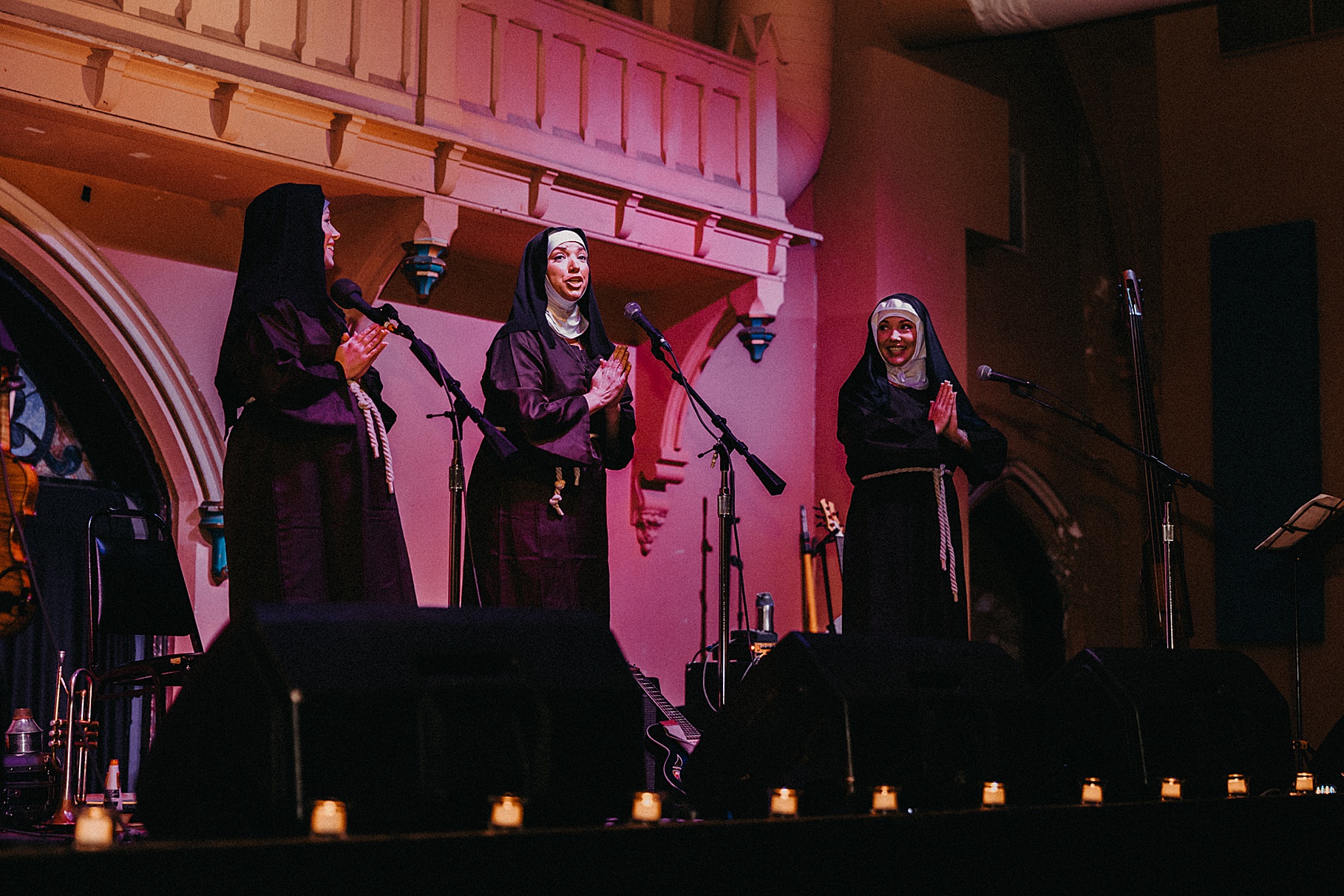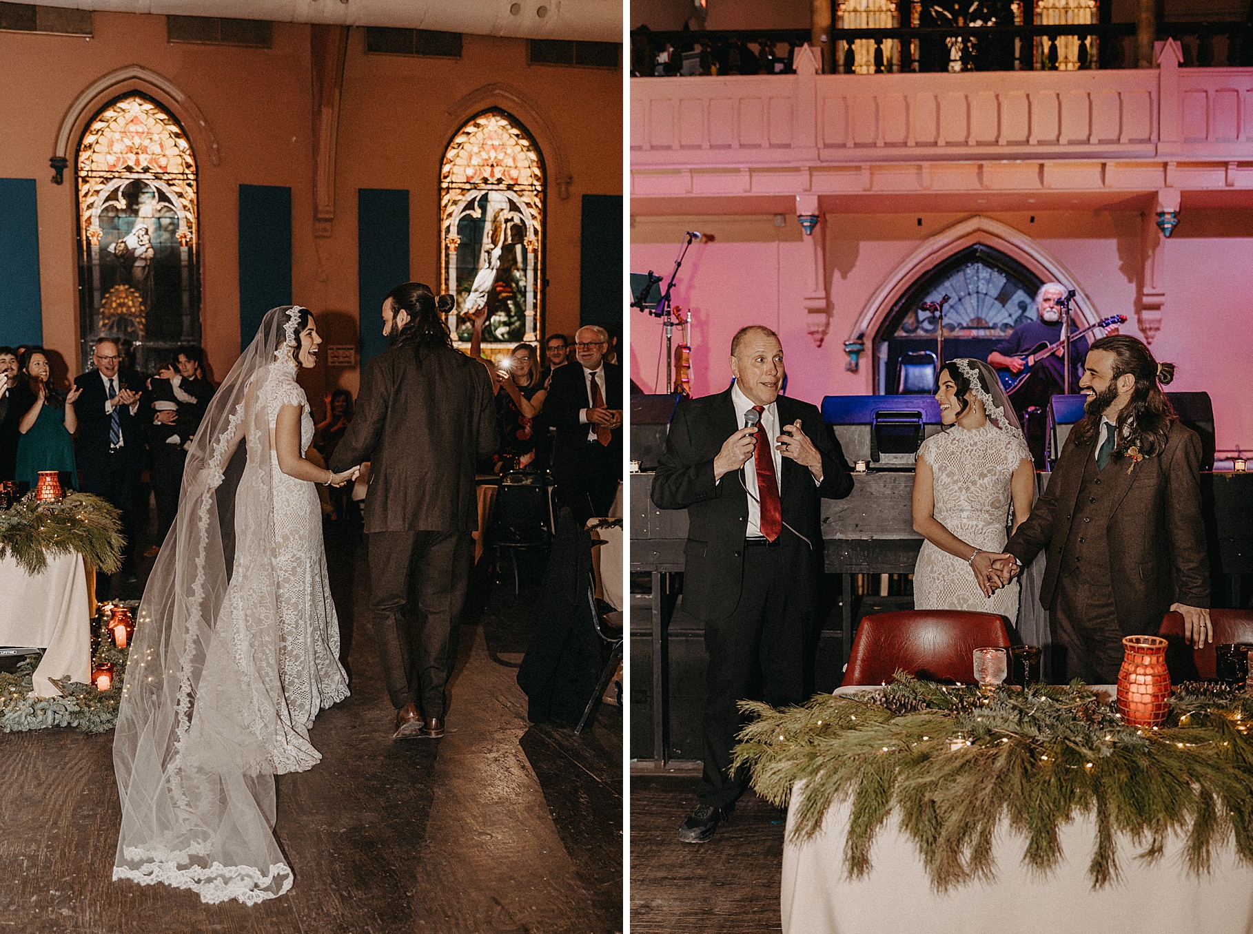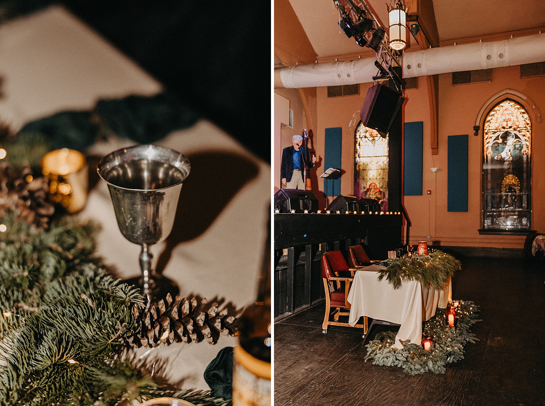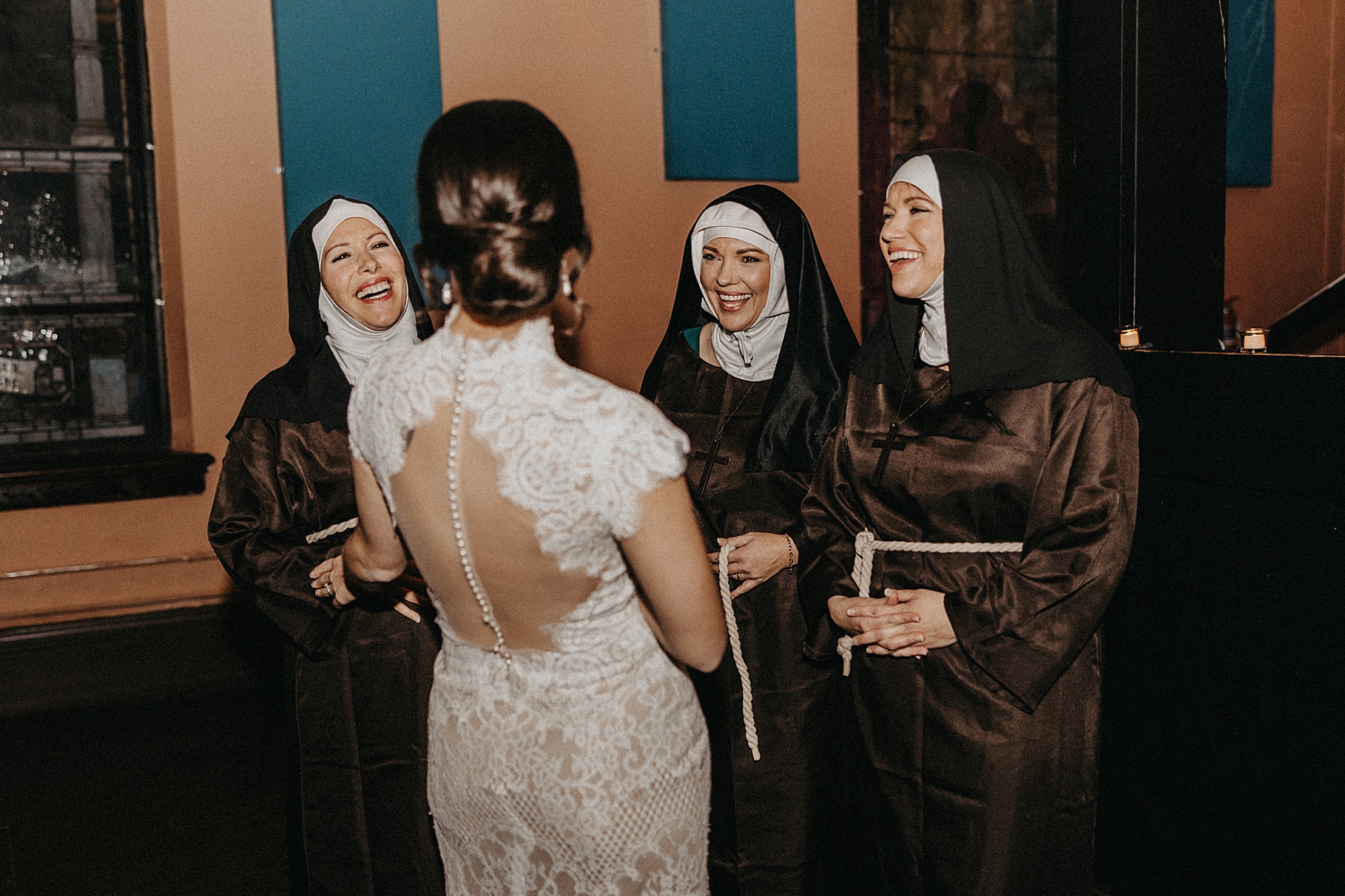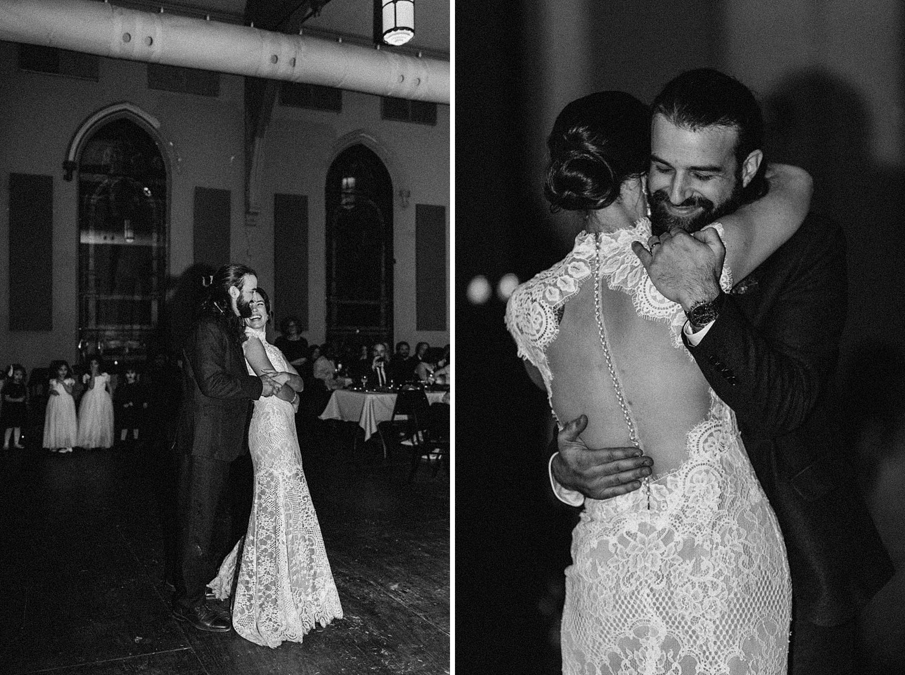 Once we finished portraits, we made our way to their reception at The Southgate Revival House. This venue is typically a live music space, which meant we had an incredible stage and lighting setup for their band, The Burning Caravan, who absolutely crushed it all evening. A few other highlights from the reception: Benj and his mom opted not to dance and instead sang a song for Maria and her dad’s dance (how special is that?). Another favorite moment was when Maria’s three sisters came out dressed as the nuns from The Sound of Music and performed a personalized version of “Maria,” describing their sister instead of giving traditional toasts. Maria and Benj also have a lot of nieces and nephews, which meant so many kiddos having the time of their lives—running around, dancing, eating pie (they had a pie bar instead of cake!), and drinking hot cocoa.