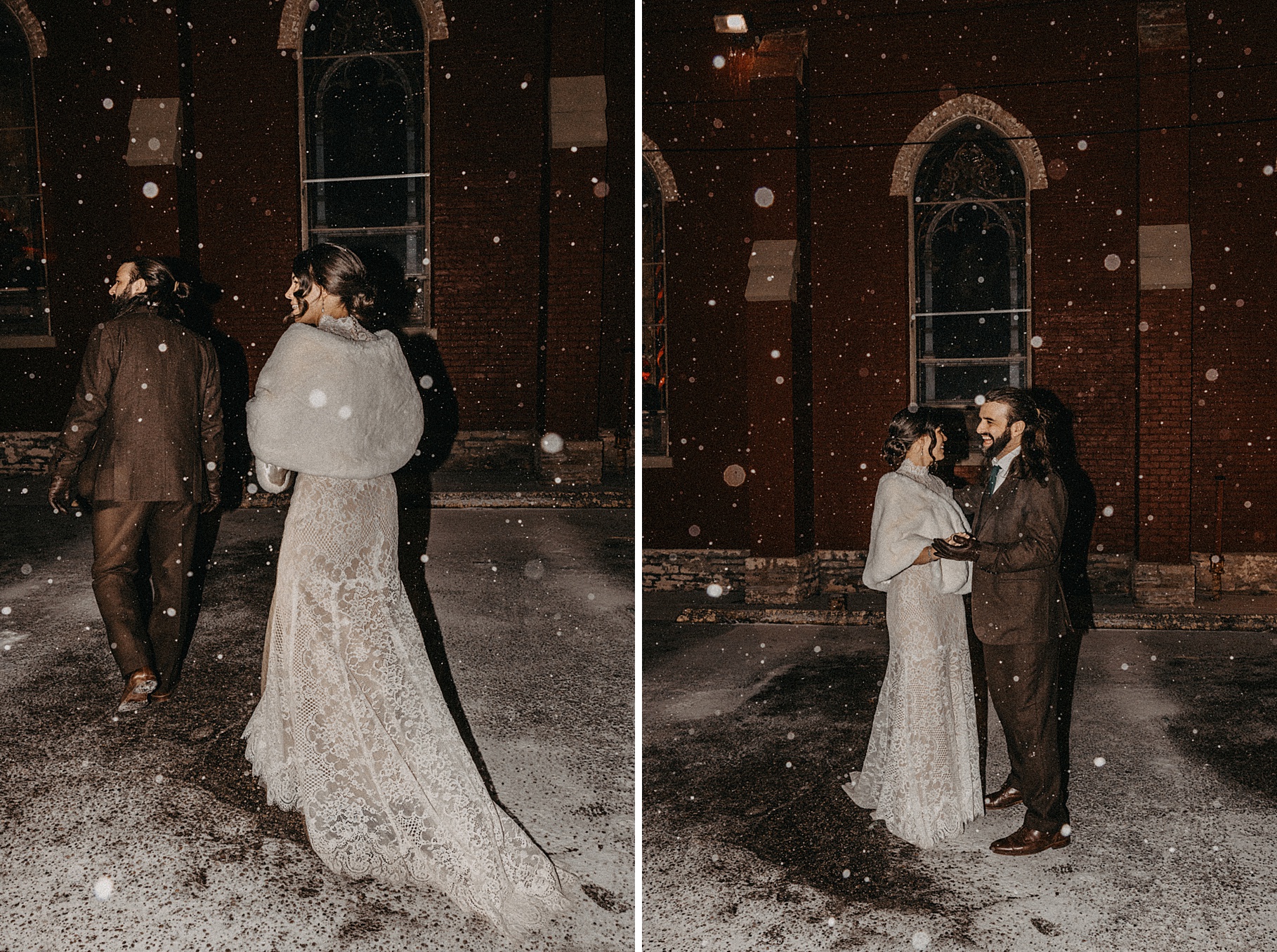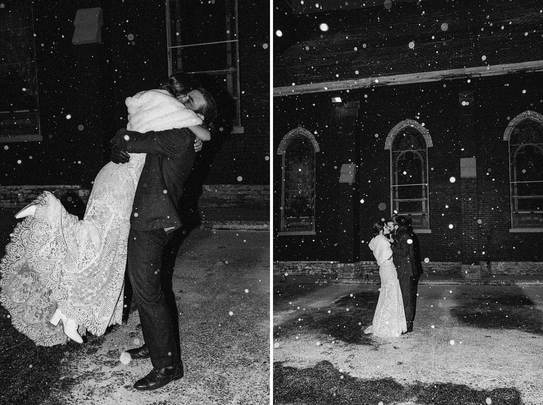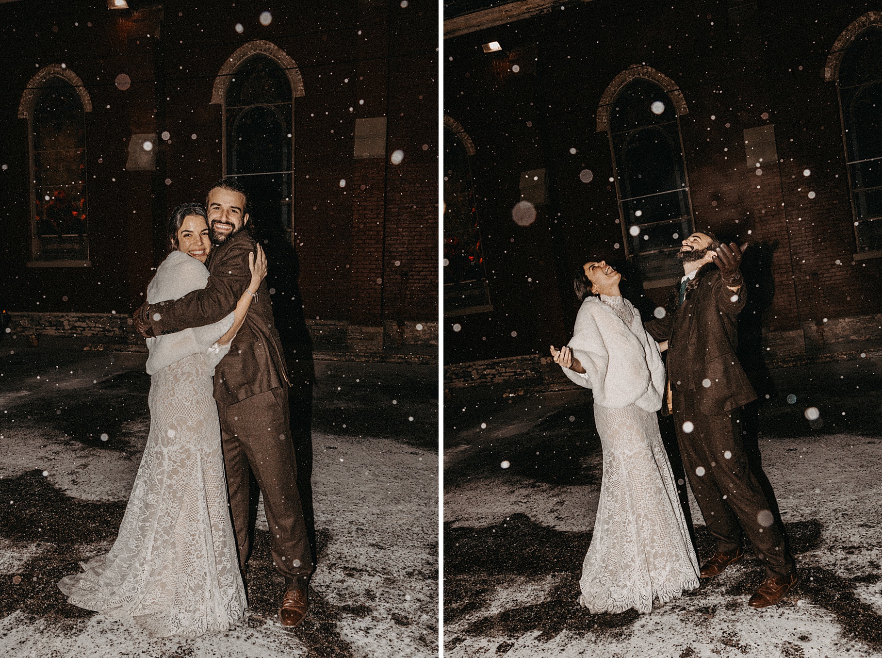 Before the end of the night, I stepped outside with Maria & Benj because it had started snowing. Since their wedding fell right before a huge winter storm was coming through, it felt fitting to capture the beginning of the snowfall. It was my first time taking snow photos in the dark using flash, and I absolutely love how they turned out—the flash illuminated every falling snowflake in the best way.