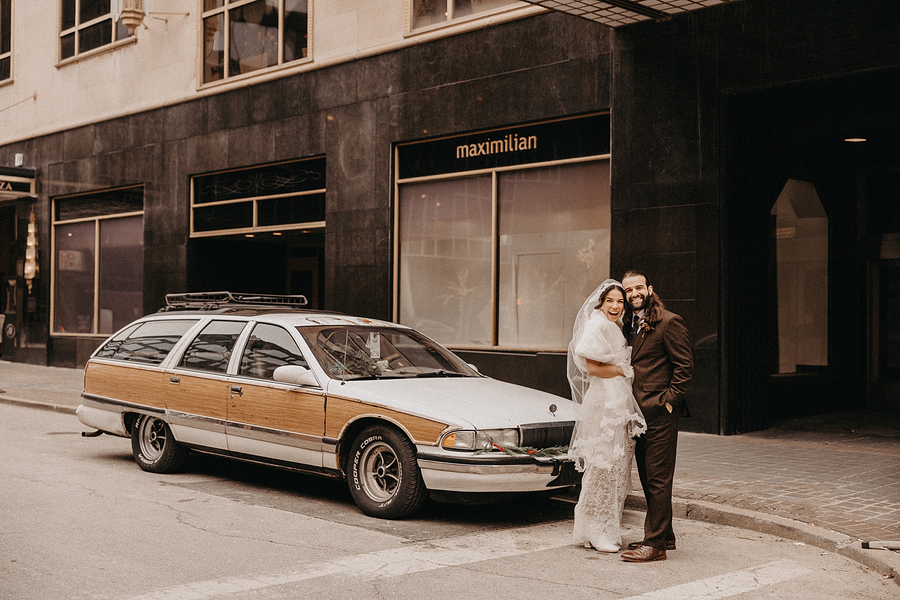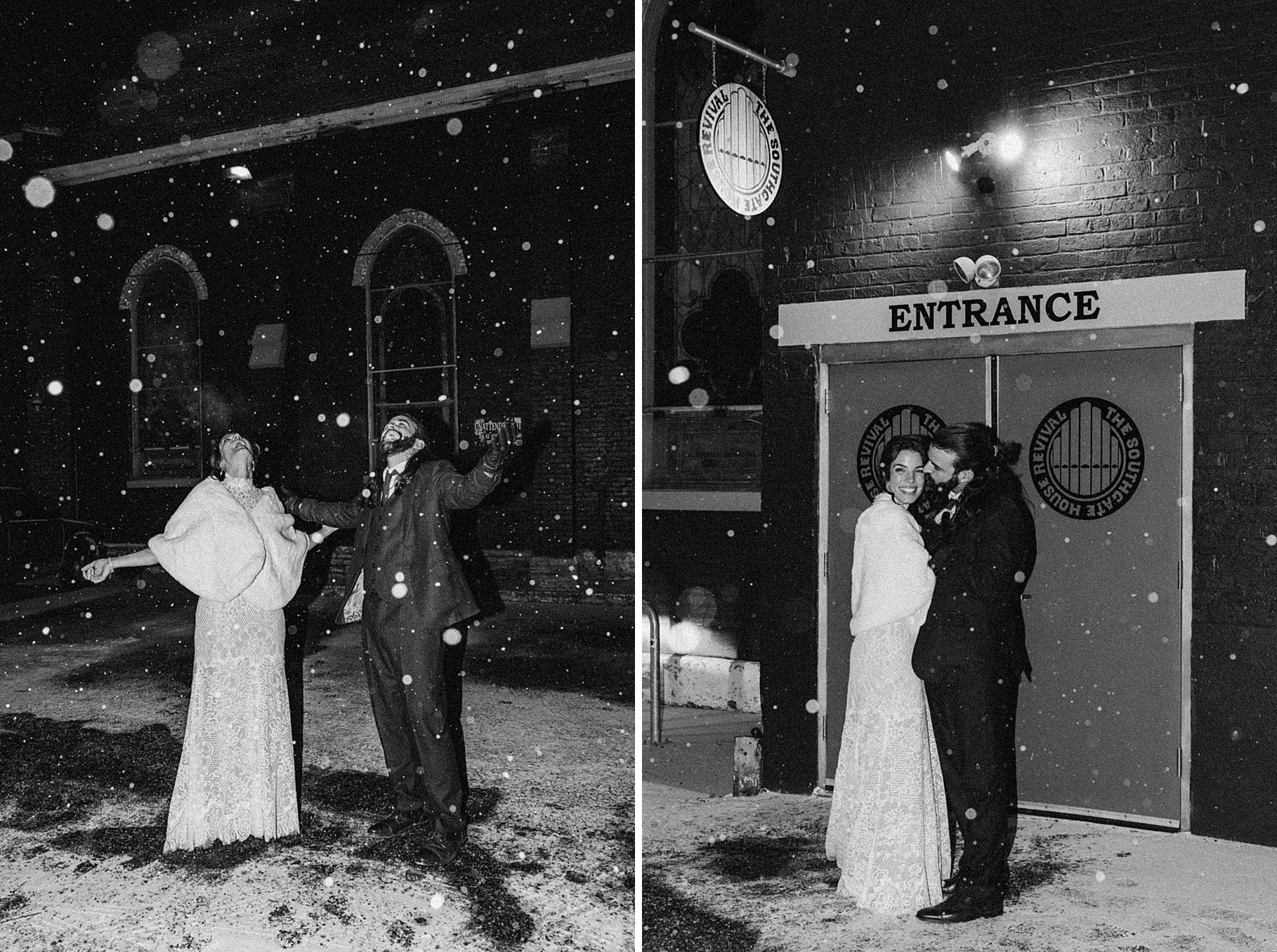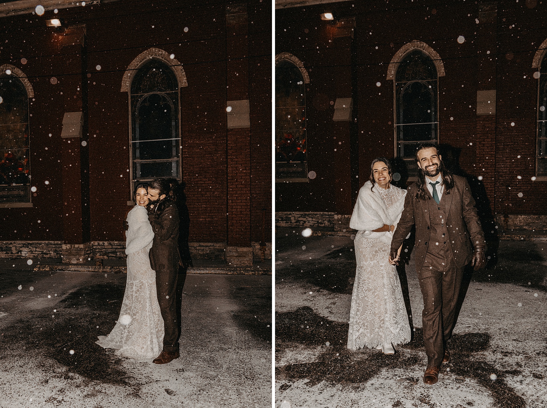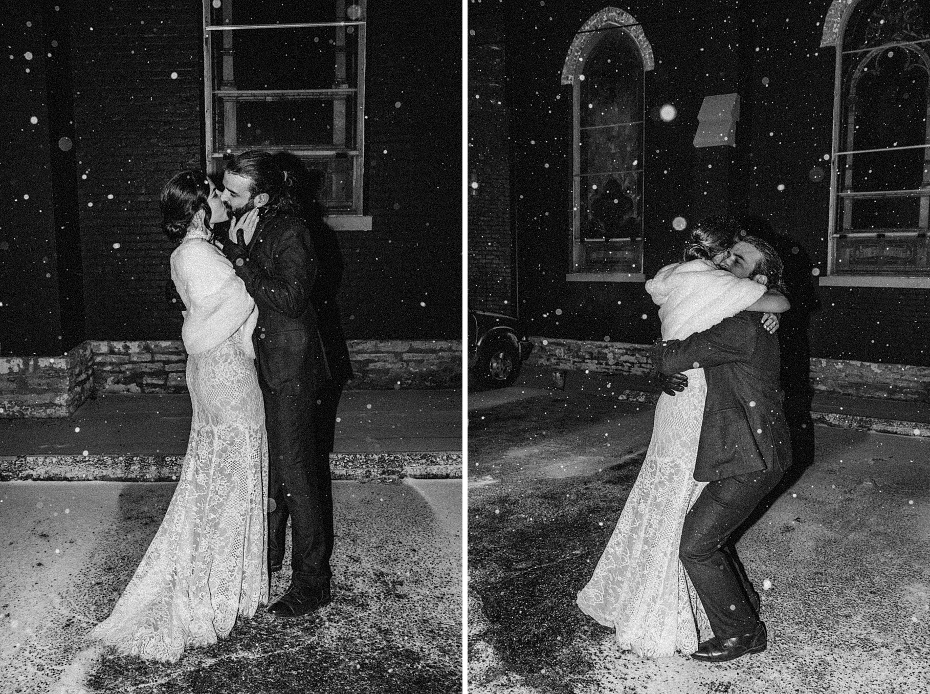Before the end of the night, I stepped outside with Maria & Benj because it had started snowing. Since their wedding fell right before a huge winter storm was coming through, it felt fitting to capture the beginning of the snowfall. It was my first time taking snow photos in the dark using flash, and I absolutely love how they turned out—the flash illuminated every falling snowflake in the best way.