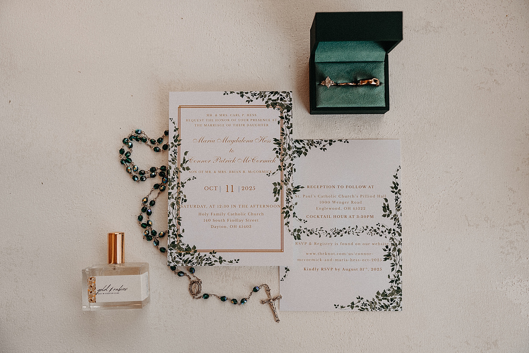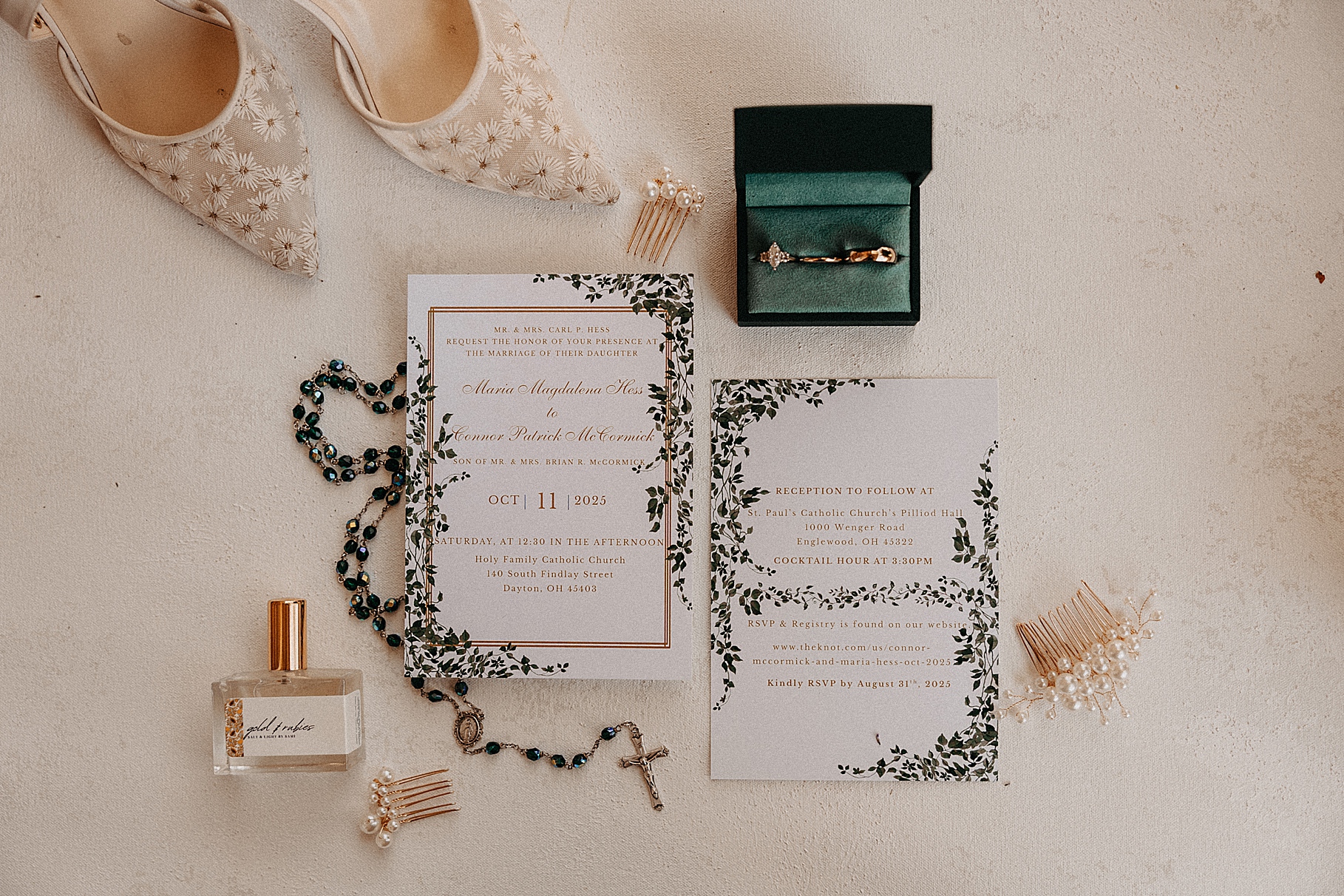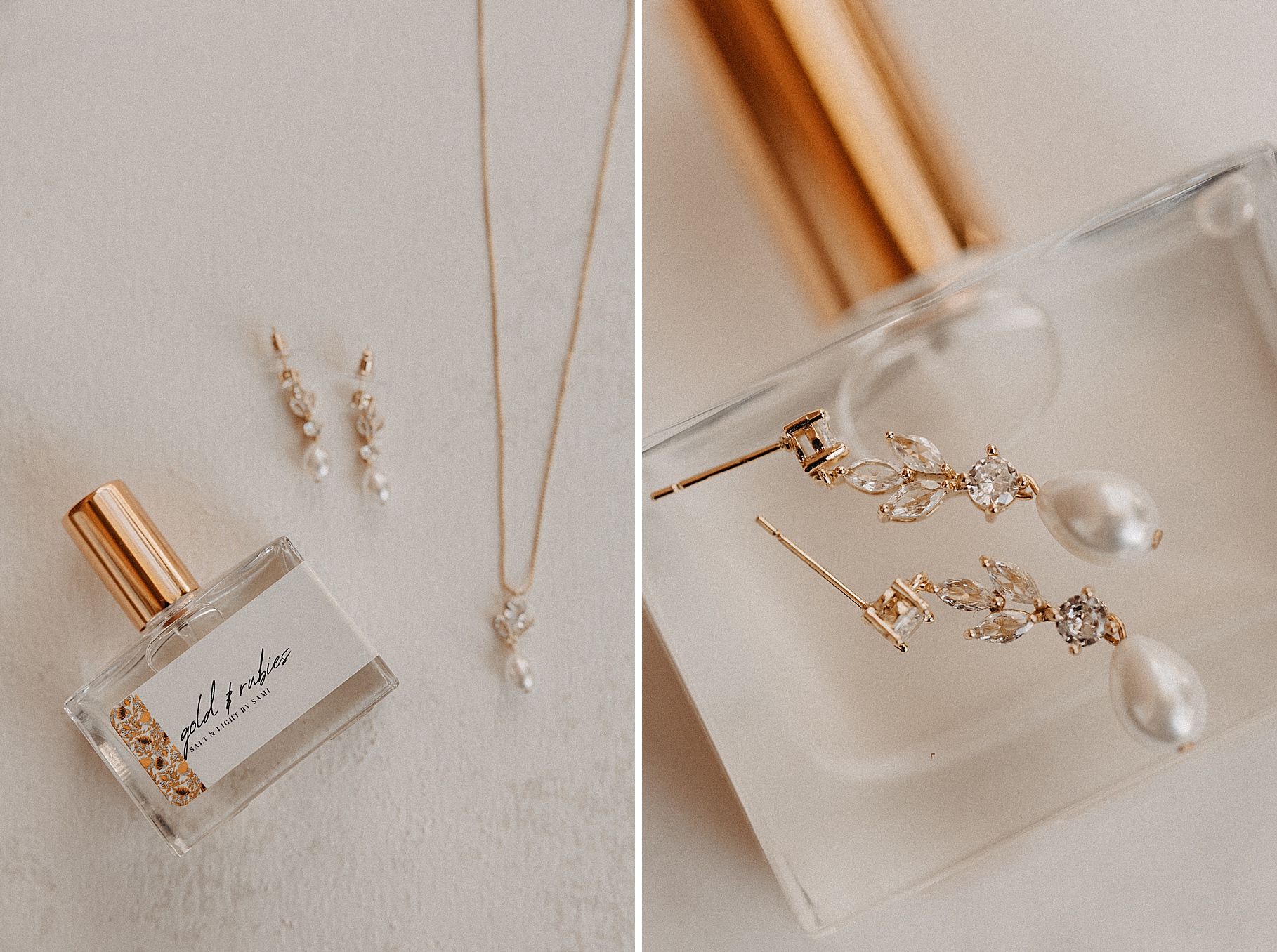 We began the morning at Maria’s parents’ home, where the girls were getting ready. I photographed her lovely details on the front porch while hair and makeup wrapped up inside. A little fun side note: I recently got the perfume sampler from Salt & Light by Sami (a Catholic, non-toxic small business!) and fell in love with the scent Gold & Rubies. When I was editing Maria’s detail photos, I realized that was the very perfume she had chosen for her wedding day!