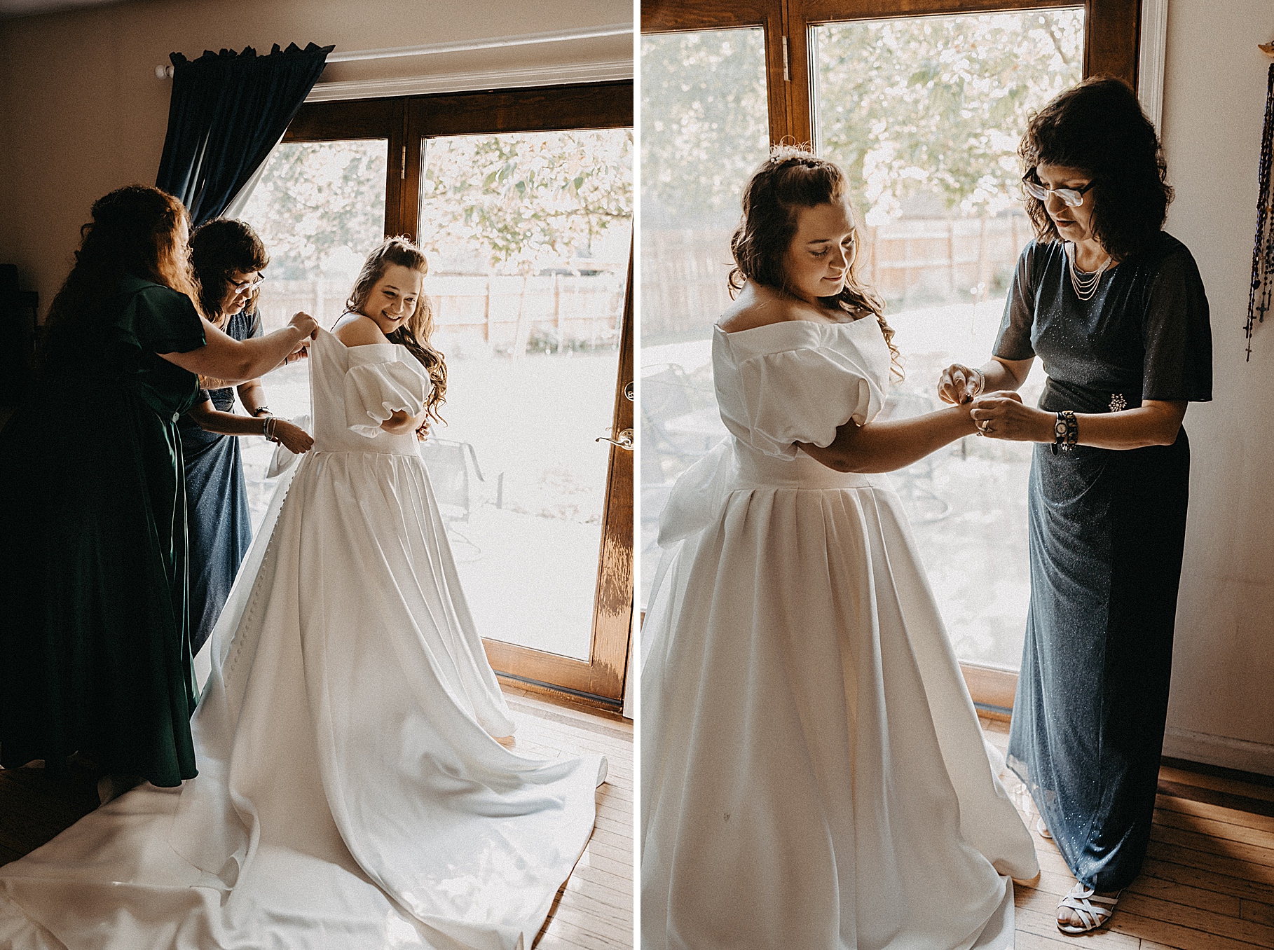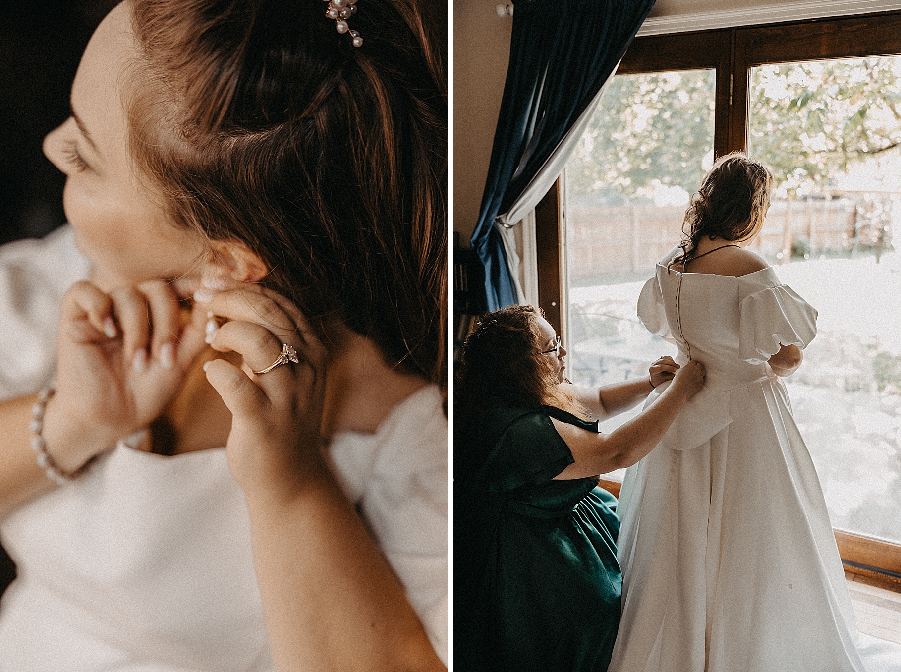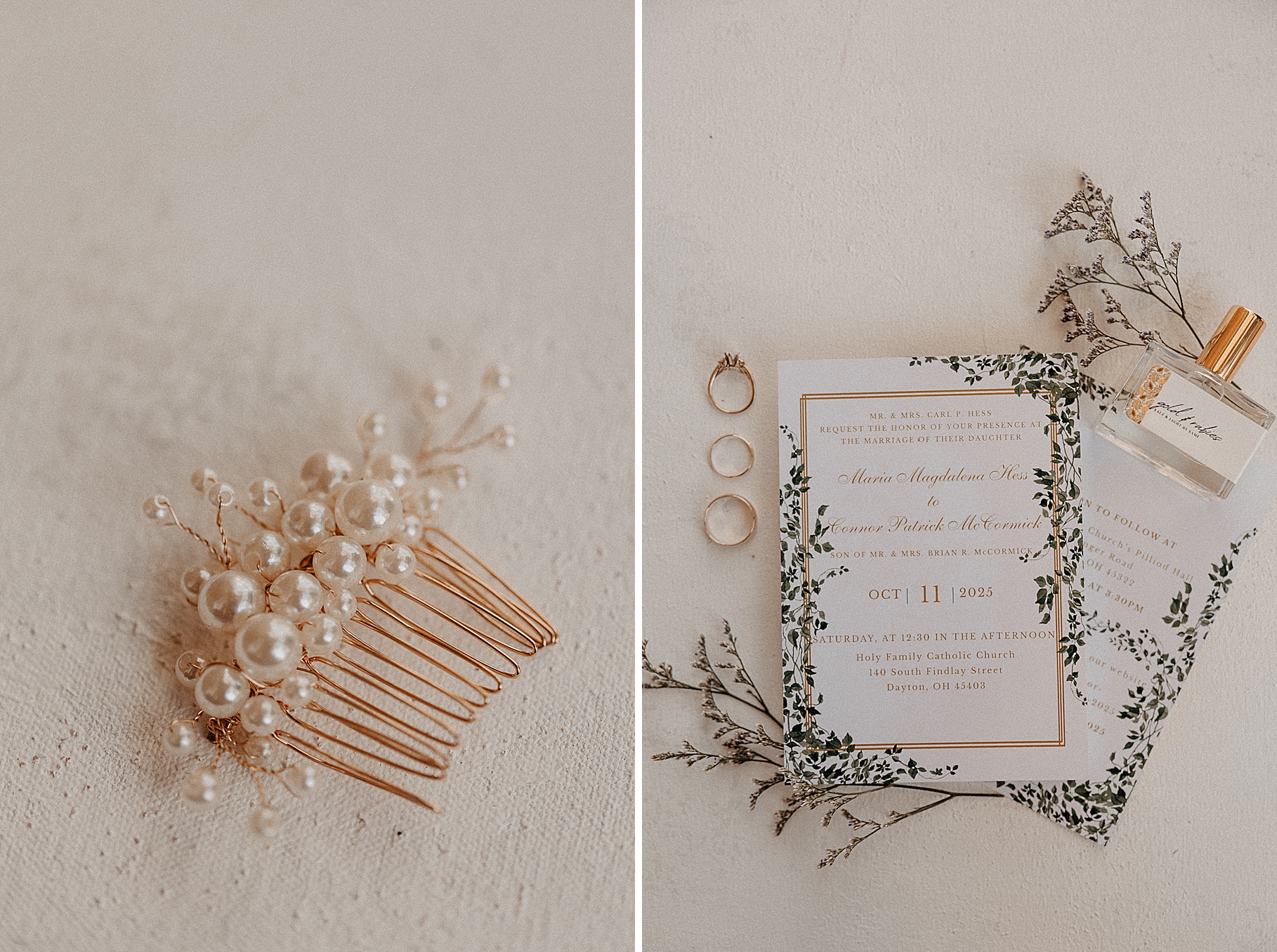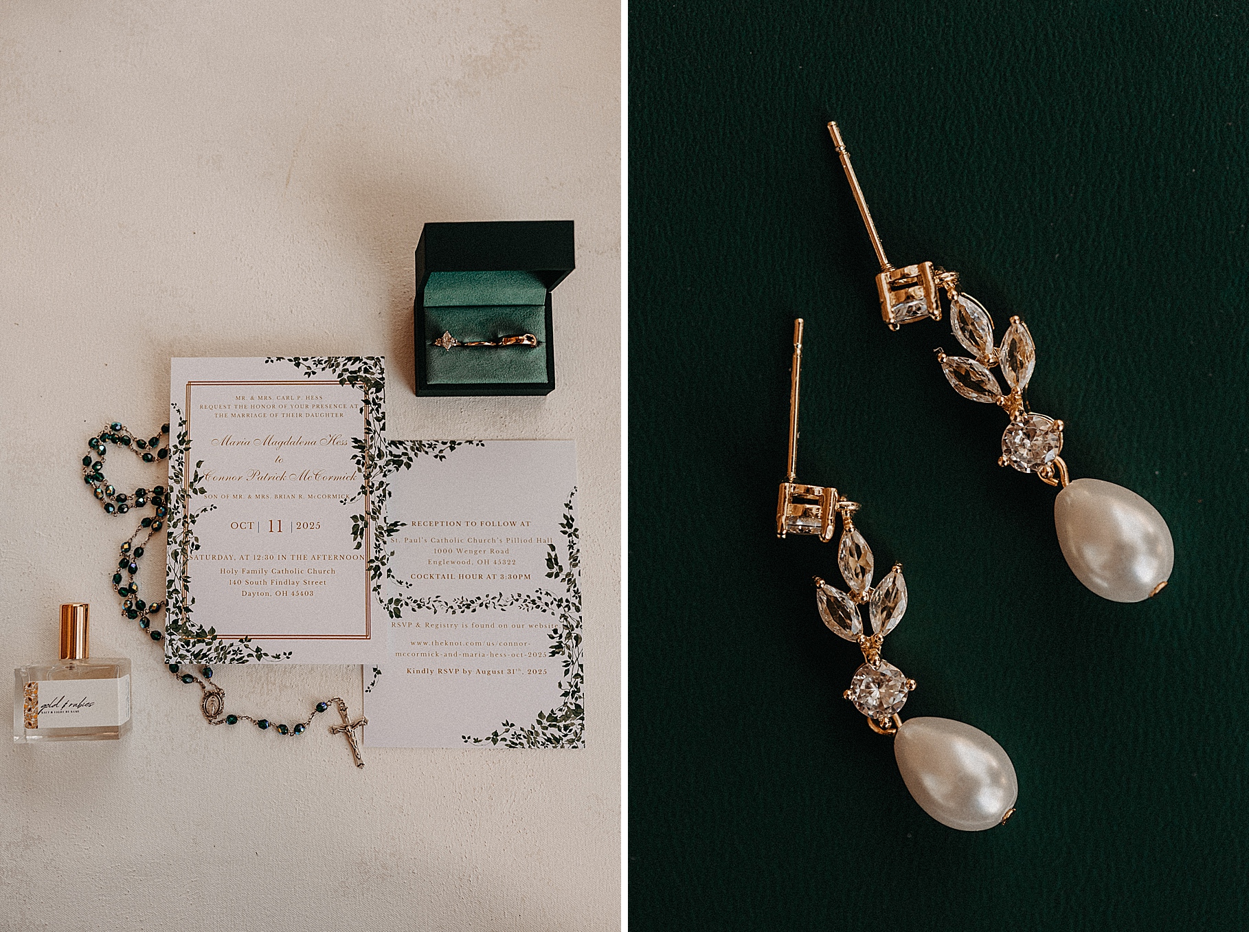 We began the morning at Maria’s parents’ home, where the girls were getting ready. I photographed her lovely details on the front porch while hair and makeup wrapped up inside. A little fun side note: I recently got the perfume sampler from Salt & Light by Sami (a Catholic, non-toxic small business!) and fell in love with the scent Gold & Rubies. When I was editing Maria’s detail photos, I realized that was the very perfume she had chosen for her wedding day!