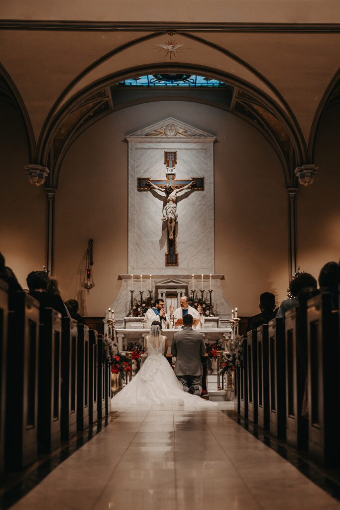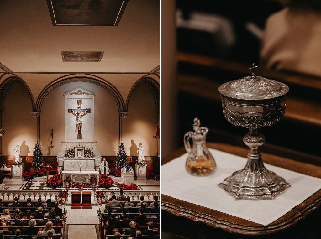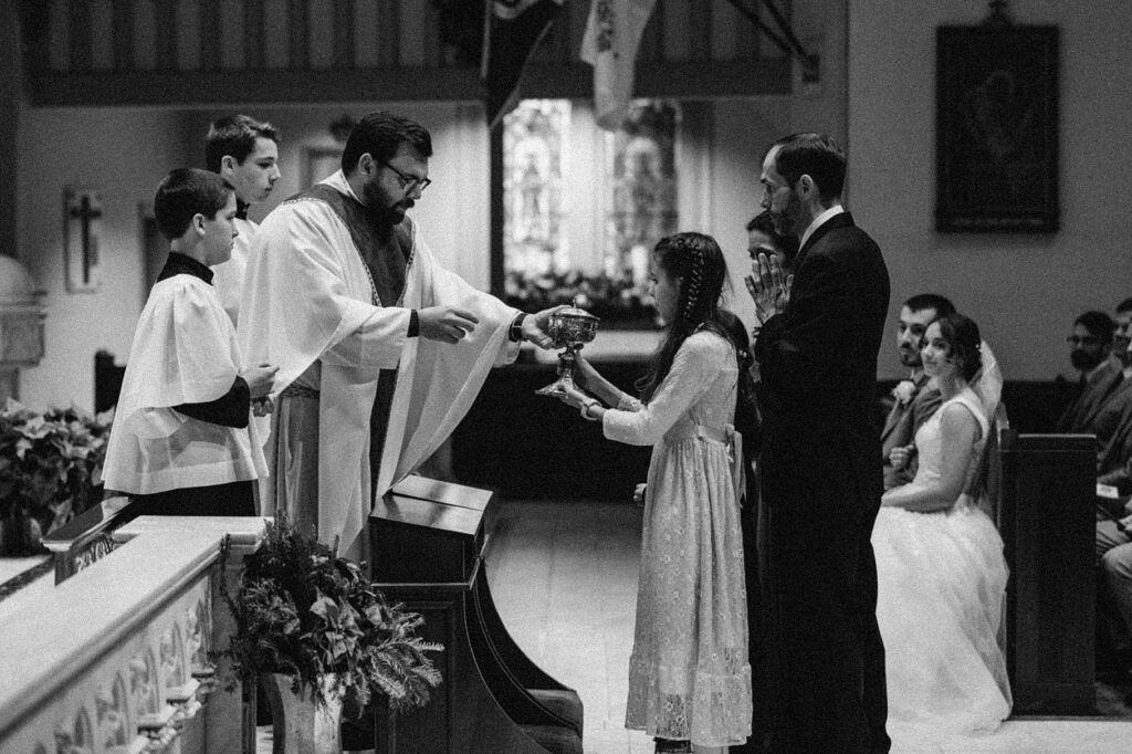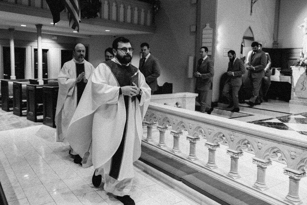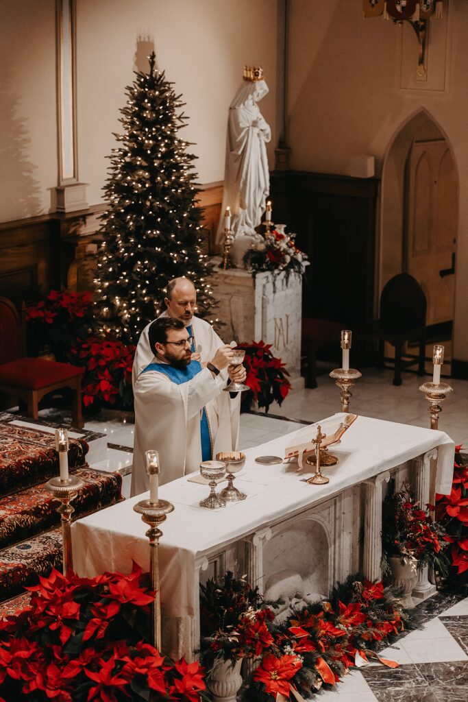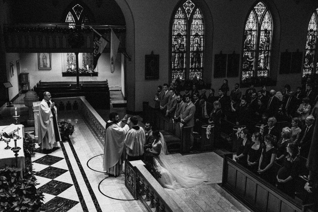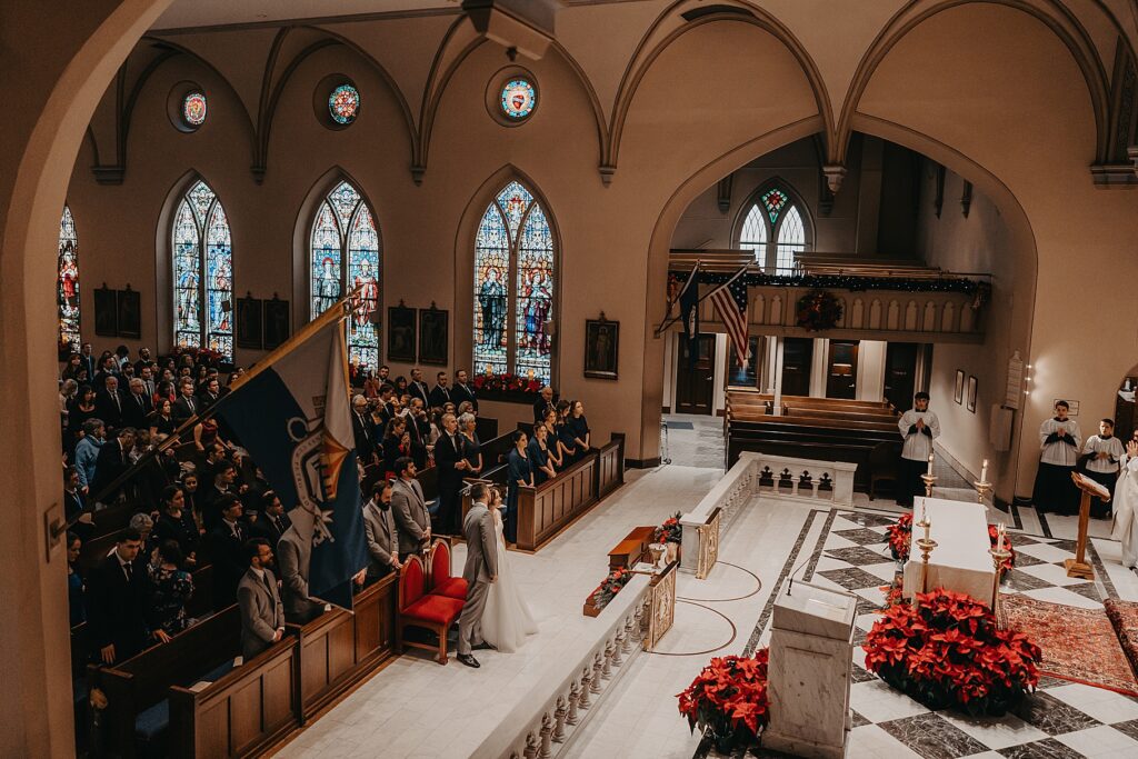 Their Nuptial Mass took place at the Basilica of St. Mary in Old Town Alexandria, Virginia. This was actually the second time I’ve photographed a wedding at this church, but the first wedding I shot here requested their images be kept offline — which means this is the first time I’ve been able to blog a wedding in this truly stunning church. One of my favorite features of the Basilica is the pair of side balconies at the front of the church, which allow for a unique aerial perspective of different moments throughout the Mass.