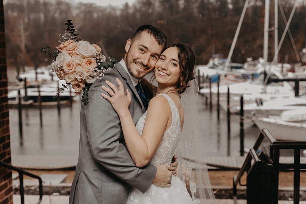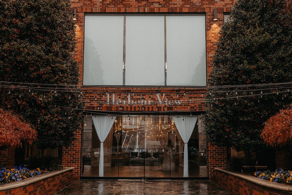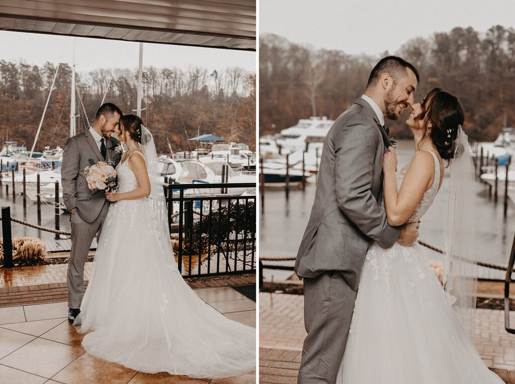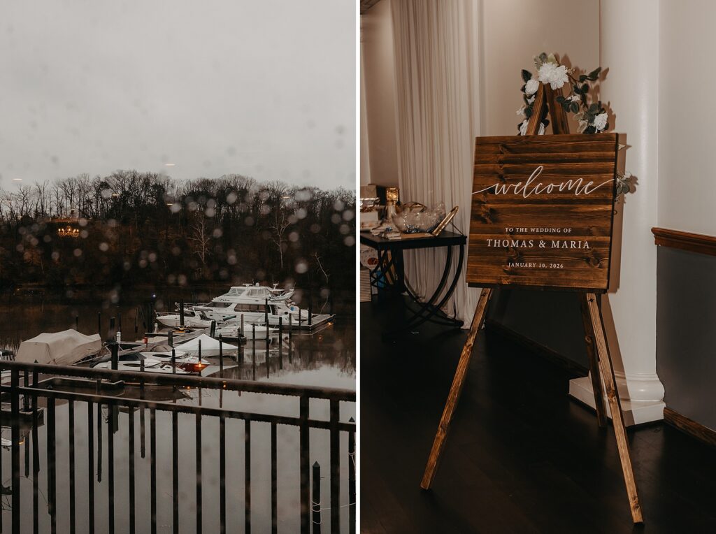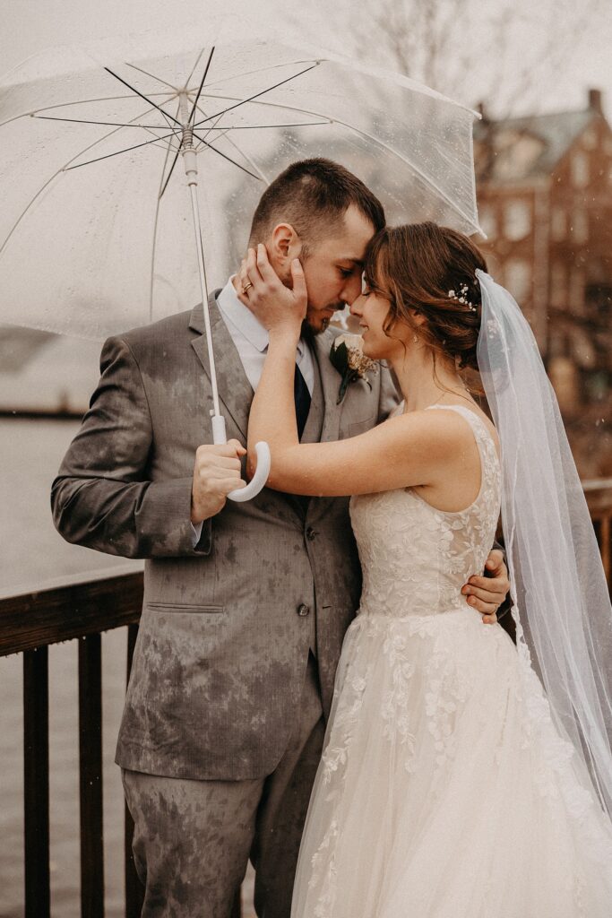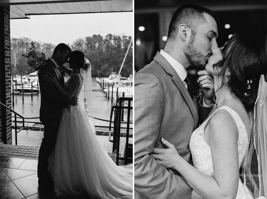 Their reception was held at the Harbor View Event Center, about thirty minutes south of Old Town. The upstairs reception space offered beautiful water views, while the downstairs level featured an open-air (yet completely covered) area — the perfect spot to finish Maria and Tom’s portraits without worrying about the rain.