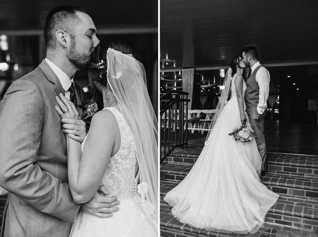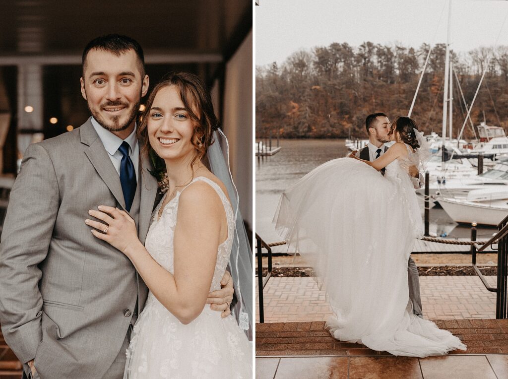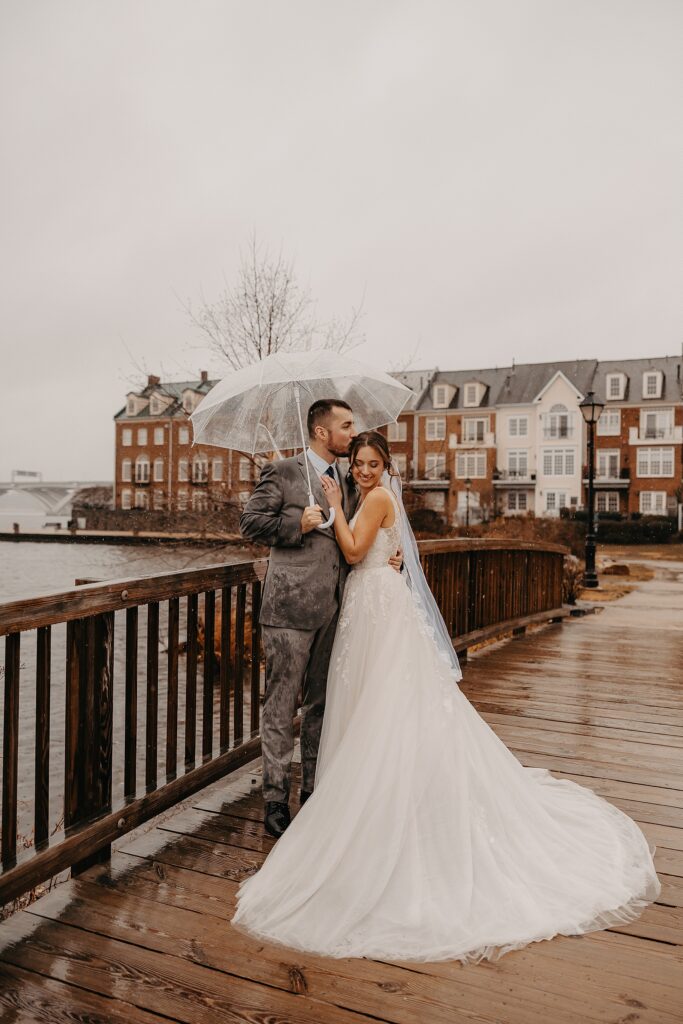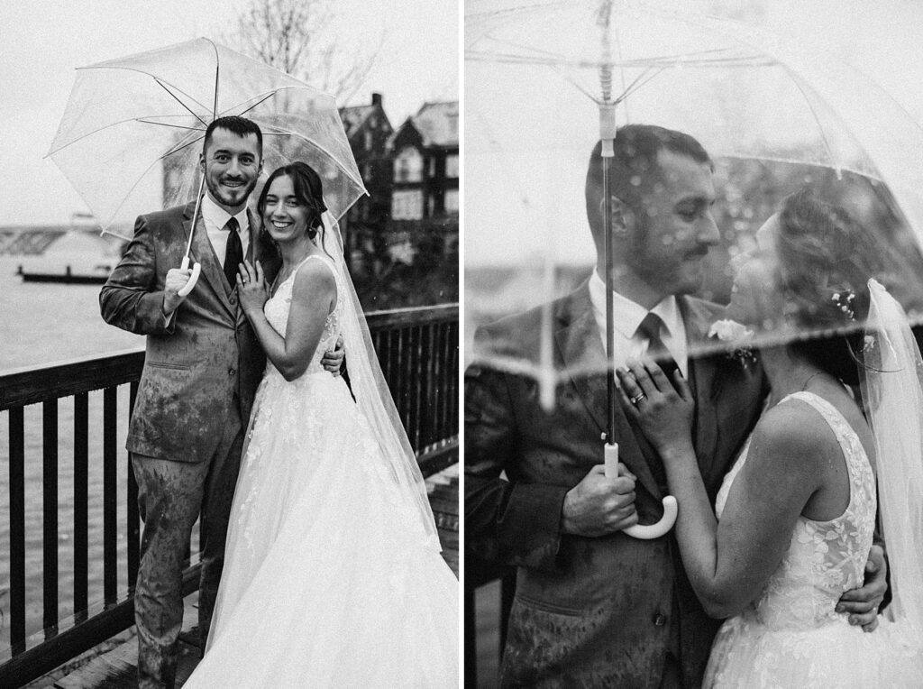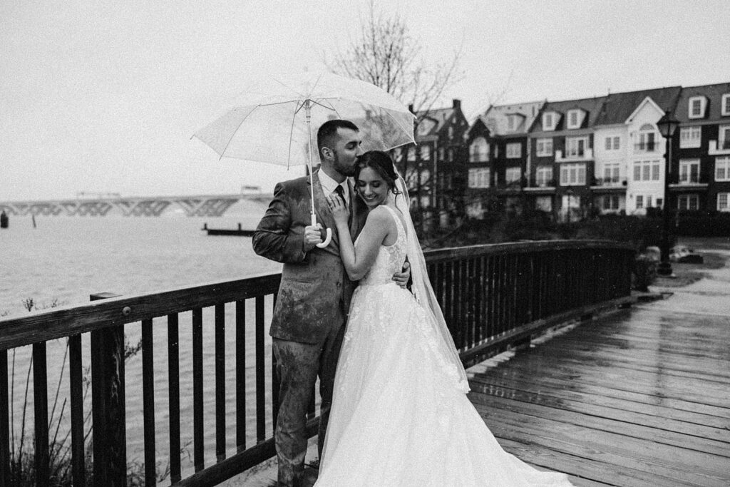 Their reception was held at the Harbor View Event Center, about thirty minutes south of Old Town. The upstairs reception space offered beautiful water views, while the downstairs level featured an open-air (yet completely covered) area — the perfect spot to finish Maria and Tom’s portraits without worrying about the rain.